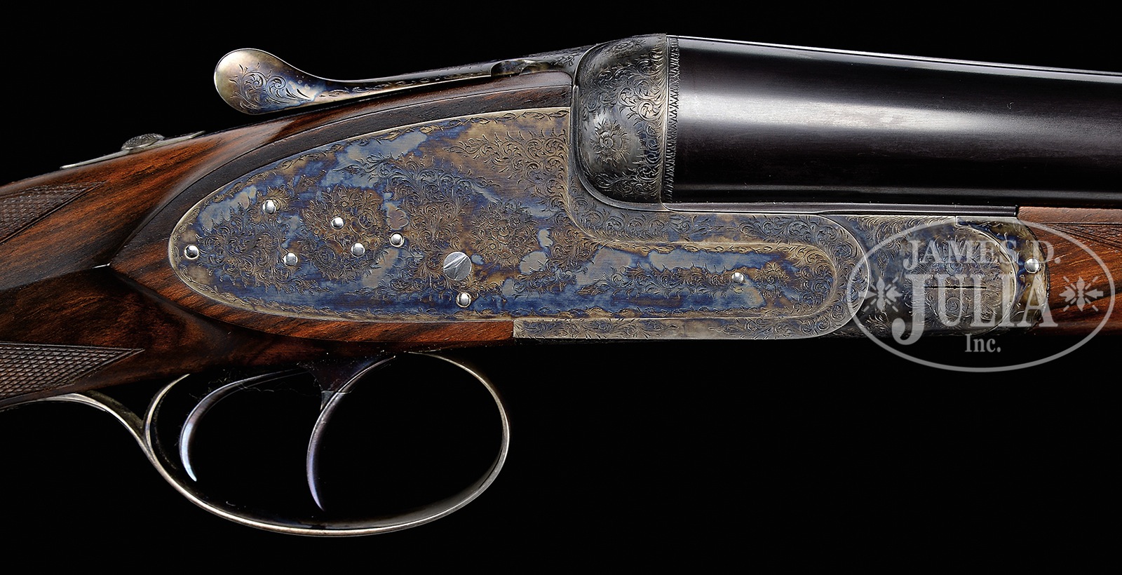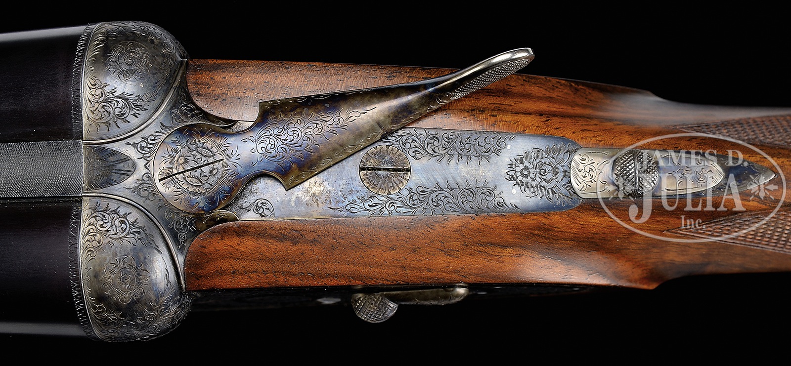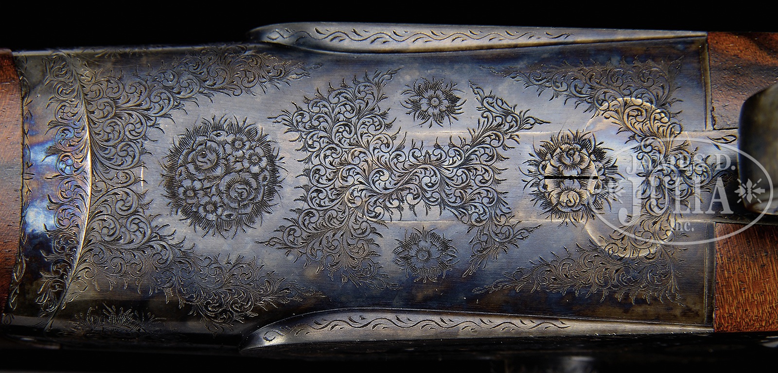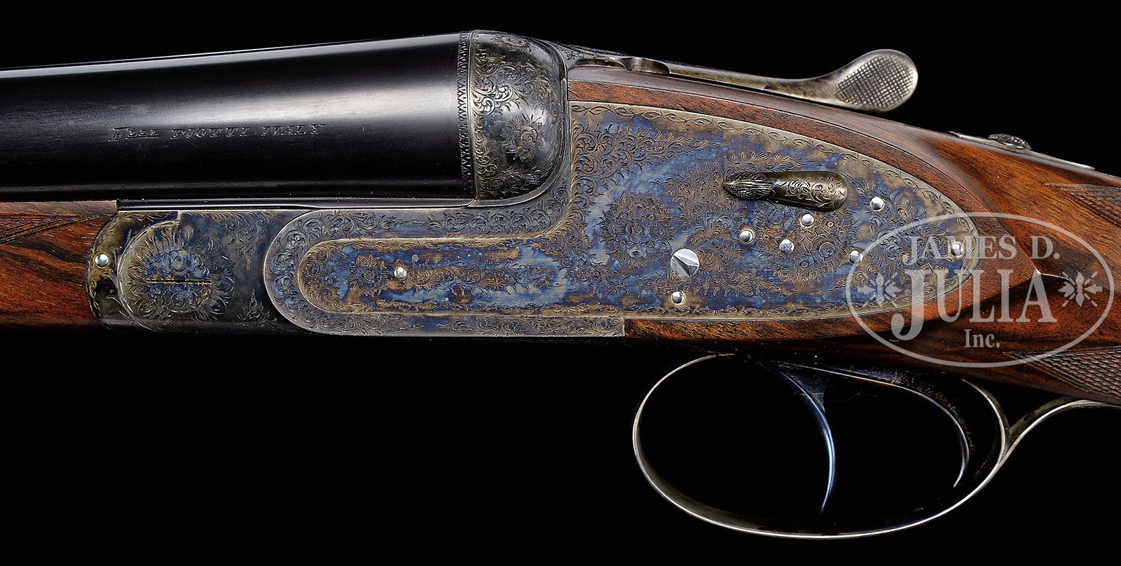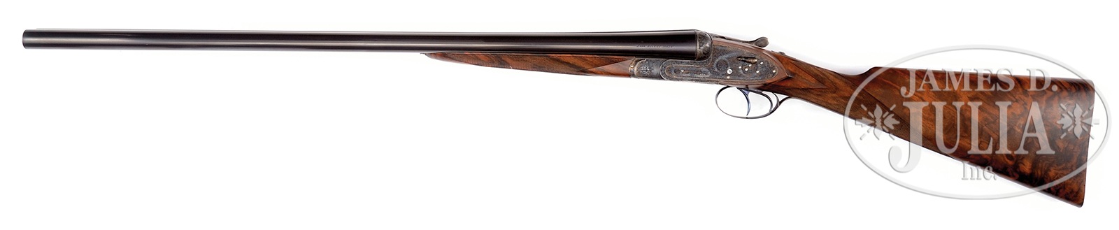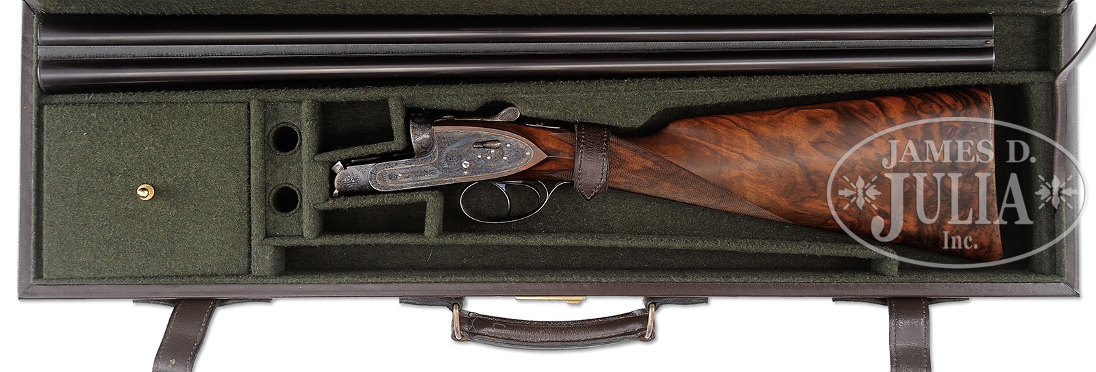 *FINE PIOTTI MONTE CARLO HEAVY GAME GUN WITH CASE.SN 8961. (1991) Cal. 12 ga. 2-3/4″ Chambers. 27-1/2″ Chopper lump bbls with slightly swamped, matted game rib, are engraved “Flli PIOTTI ITALY” on side of left bbl. Bbl flats are stamped with 1991 Italian nitro proofs, and with SN. Bottom of left bbl is engraved with model and importers name and address (WLM Westlake, CA). Case hardened sidelock action features non-automatic safety (S inlaid in gold), raised arrowhead tumbler end cocking indicators, H&H type lock detaching pin, and dbl triggers (front articulated). Action is engraved with 80% coverage Purdey style well cut rose and scroll. Engravers signature “Piotti” is on trigger plate. Makers name does not appear on exterior, but is stamped, along with grade, on water table. Matching case hardened single beaded trigger guard has SN on tang. Beautifully marbled, exhibition quality, stump European walnut straight grip buttstock measures 14-1/2″ over checkered wood butt, and features diamond hand, well cut point pattern checkering with line borders, and a silver oval on toe line is engraved with the monogram “LFM” (?). Matching splinter ejector forend has Anson release. Bore diameter: left -.728, right – .727. Bore restrictions: left – .019 (mod), right – .008 (IC). Drop at heel: 2-1/16″, drop at comb: 1-1/2″. Cast: Neutral. Weight: 7 lbs. 14 oz. LOP: 14-1/2″. Dark leather case with stitched leather corners by Nizzoli, is lined in dark olive felt. Black leather Piotti label is stitched into lid. PROVENANCE: Remarkable William Larkin Moore Private Estate Collection of Fine Sporting Arms. CONDITION: Excellent, with evidence of very light field use, most noticeably, thinning of blue on sides of bbls, and a few light handling marks in wood. Bores are excellent. Action is very tight. Ejectors are strong and in time. Gun has been in storage a long time, and top lever and triggers are a bit sluggish. Case is excellent with a few light rubs. Interior is excellent with some light rubs. 50594-88 MGM45 (8,000-14,000) – Lot 3354