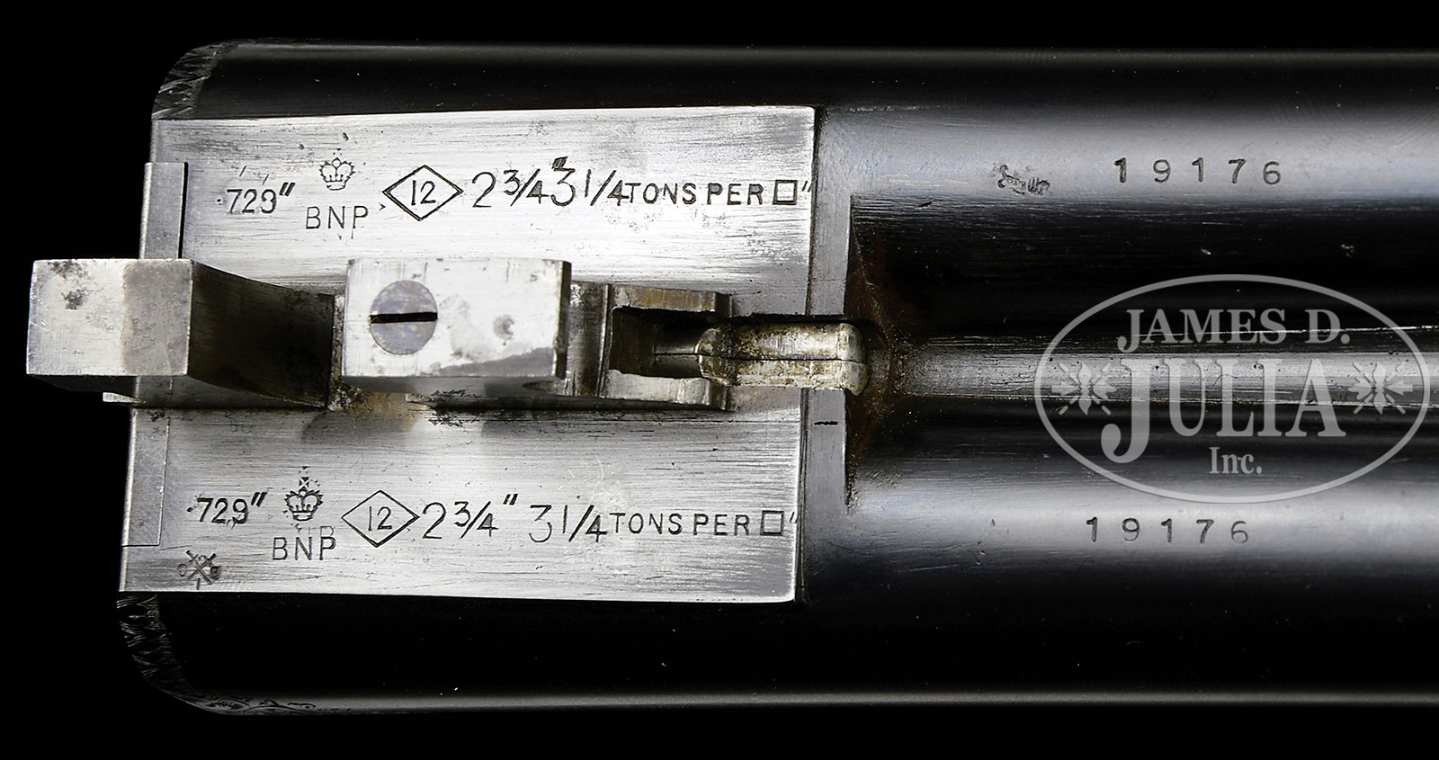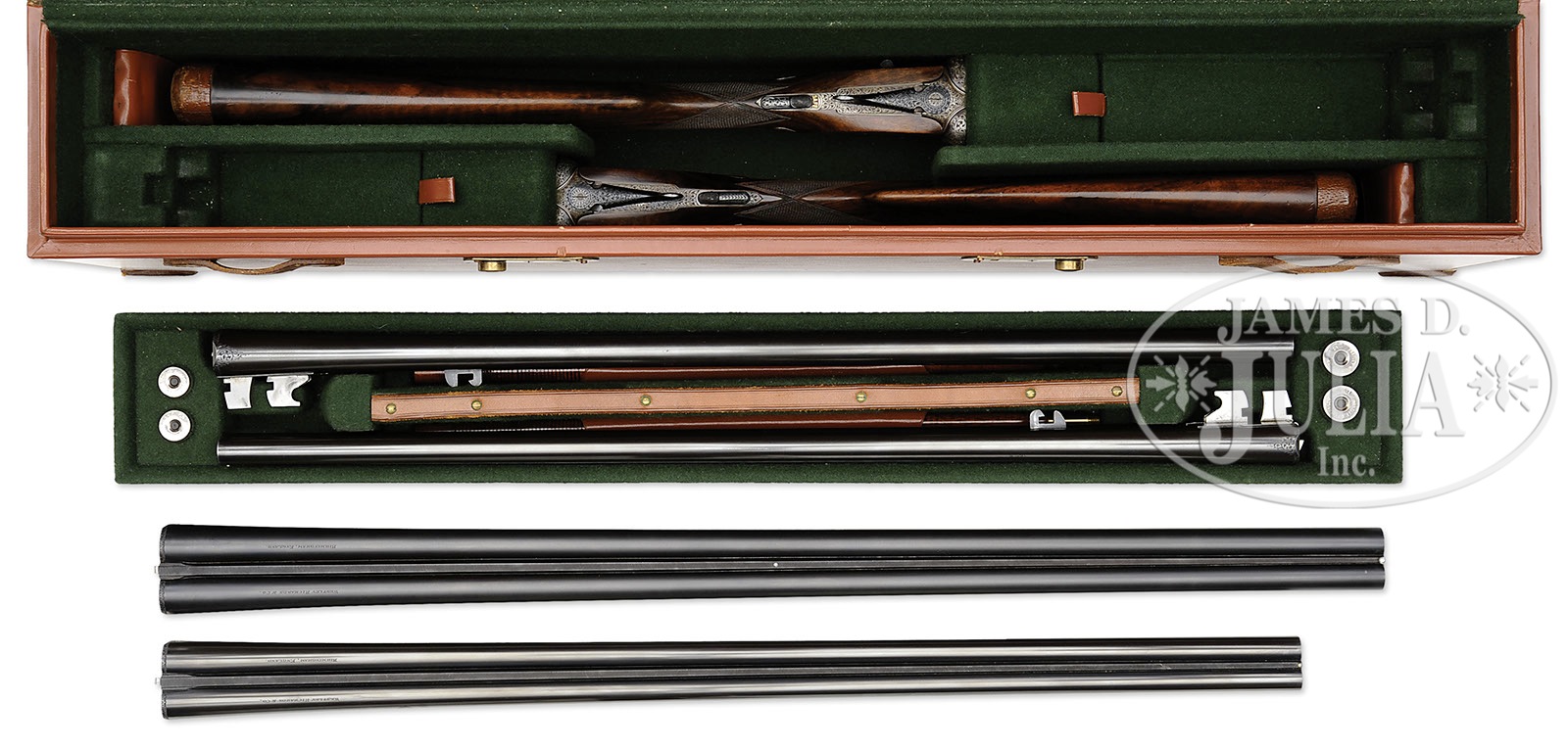 SN 19176/ 19178. (1963) Cal. 12 ga./ 20 ga. 2-3/4″ Chambers. 12 ga. bbls are 26″ and 30″, 20 ga. bbls are 26″ and 28″. All bbl sets have matted Churchill game ribs, and are engraved “Westley Richards & Co” and “Birmingham, England” on tops. Bbl flats are stamped with 1963 Birmingham nitro proofs for 2-3/4″ chambers. Case hardened Holland & Holland style full sidelock actions by Brown Brothers (logos on interior of sidelocks) feature H & H style lock detaching pins, non-automatic safeties (SAFE inlaid in gold), side clips, hidden third fasteners, gold band tumbler end cocking indicators, and gold-plated Miller single selective triggers. (Original double trigger parts and interceptors are in case.) Actions are engraved with cleanly cut, large, open, shaded scroll. “Westley Richards” is on the front of each lockplate. Blued top levers and trigger guards are also scroll engraved. SNs are on trigger guard tangs. Well figured and nicely marbled European walnut straight grip buttstocks measure 15″ over brown leather covered pads, and feature drop points, diamond hands, classic point pattern checkering with mullered borders, and incised rectangular crest plates on toe lines engraved “W H W”. Matching splinter ejector forends have Anson releases. 12 ga. 26″ bbls: Bore diameter: left-.729, right -.729. Bore restrictions: left -.007 (IC), right -.004 (IC). Wall thickness: left -.023, right -.023. Drop at heel: 2-1/2″, drop at comb: 1-1/4″. Weight: 6 lbs. 10 oz. LOP: 15″. 12 ga. 30″ bbls: Bore diameter: left-.729, right -.728. Bore restrictions: Screw chokes. Wall thickness: left -.027, right -.027. Drop at heel: 2-1/2″, drop at comb: 1-5/16″. Weight: 6 lbs. 14 oz. LOP: 15″. 20 ga. 26″ Bbls: Bore diameter: left-.613, right -.613. Bore restrictions: left -.004 (IC), right -.002 (IC). Wall thickness: left -.027, right -.031. Drop at heel: 2-5/16″, drop at comb: 1-1/4″. Weight: 5 lbs. 14 oz. LOP: 15″. 20 ga. 28″ Bbls: Bore diameter: left-.613, right -.613. Bore restrictions: Screw chokes. Wall thickness: left -.029, right -.031. Drop at heel: 2-5/16″, drop at comb: 1-1/4″. Weight: 6 lbs. 0 oz. LOP: 15″. Large, deep, leather motor case with stitched leather corners and two latch closure, is lined in green baize, and has gold embossed, black leather, makers label on lid, has room for both guns with extra bbls, in removable top tray. Case contains three 12 ga, and two 20 ga. Briley choke tubes in plastic holders (two tubes of each gauge are installed in bbls), 2 choke tube wrenches (for 12 ga and 20 ga), two walnut and brass 2-pc cleaning rods with mops, jags, and brushes, envelopes containing removed trigger and interceptor parts, and a pair of Westley Richards marked snap caps for each gun. PROVENANCE: Factory facts with details of these guns. CONDITION: Excellent. Bbls retain approx 95% orig blue (30″ 12 ga bbls re-blued, and retain nearly all of that blue). Actions retain 85 – 90% orig case hardening color, silvering on bottoms, beads, and fences. Lockplates retain nearly all of their orig case hardening color. What appears to be orig blue of trigger guards, is only slightly silvered, as are top lever thumbpieces. Stocks have only a small number of handling marks and rubs in their orig finish, checkering slightly worn. Twenty gauge gun has an invisible repair at the wrist. Bores are smooth, bright and shiny. Actions are tight. Bbls are on face. Ejectors are in time. Single triggers work. Along with installation of Miller single triggers, long bbls have been fitted with Briley thin wall chokes, and have had forcing cones lengthened. Leather of case is excellent with only a few minor bumps and rubs. Handle is strong, straps replaced. Interior cloth is excellent, with some compressions from contact with guns and bbls. Accessories are very fine to excellent, showing some rubs. A finely finished, unusual set. Factory records indicate that only six shotguns were produced by Westley Richards in 1963, two pairs and two singles. During this time most of the guns built were sidelocks. 4-47793 MGM29 (27,500-47,500) – Lot 3355