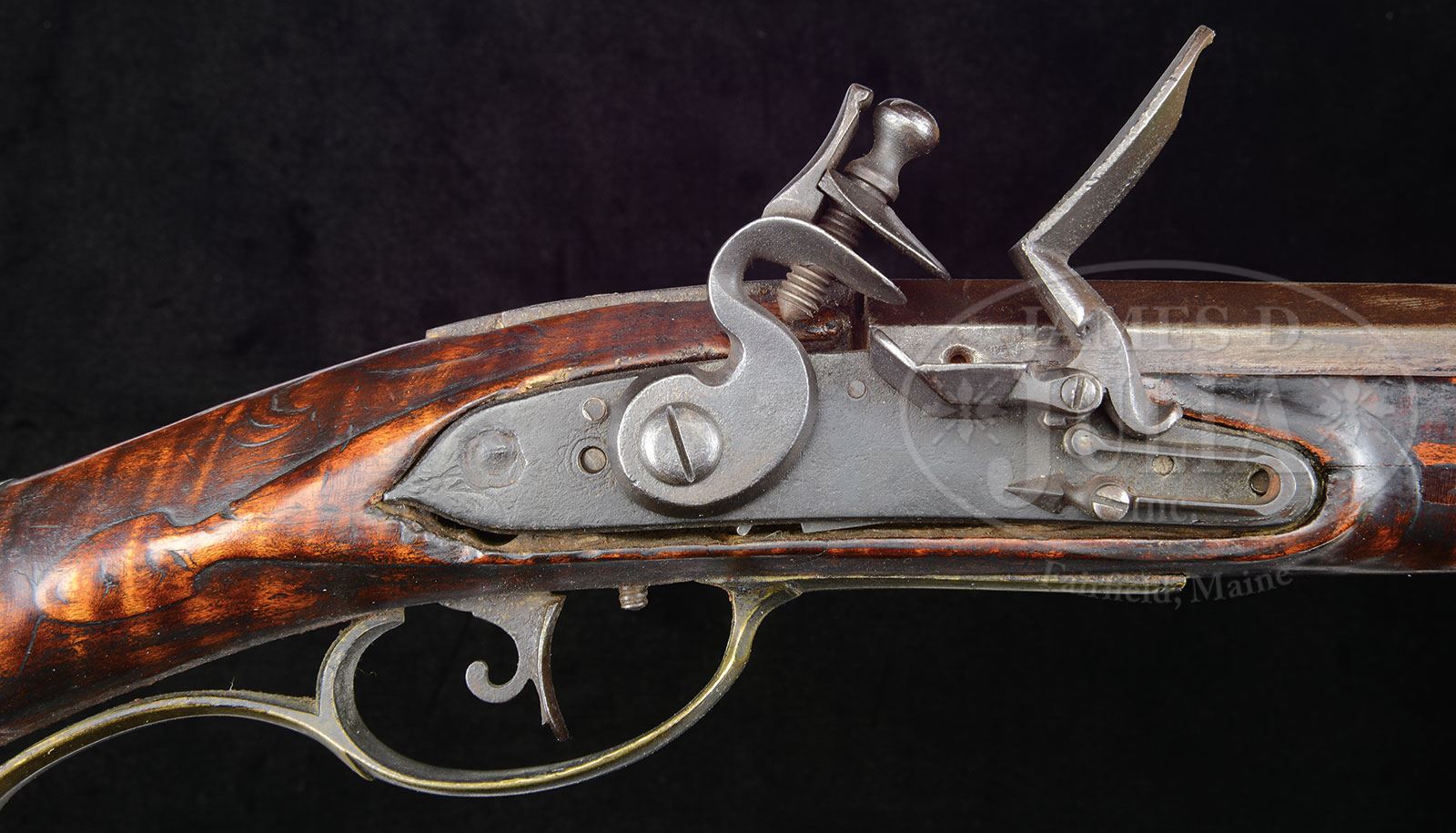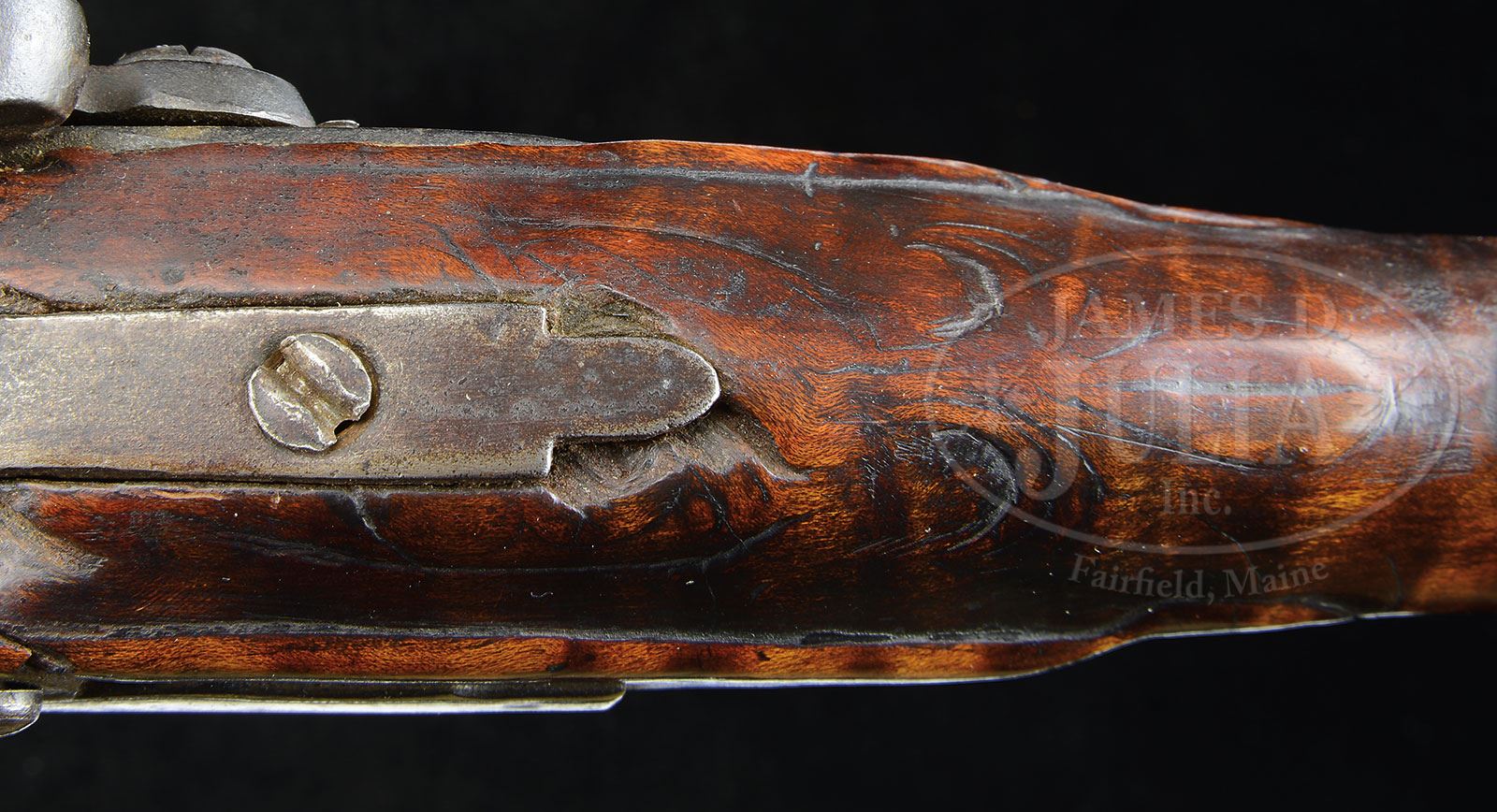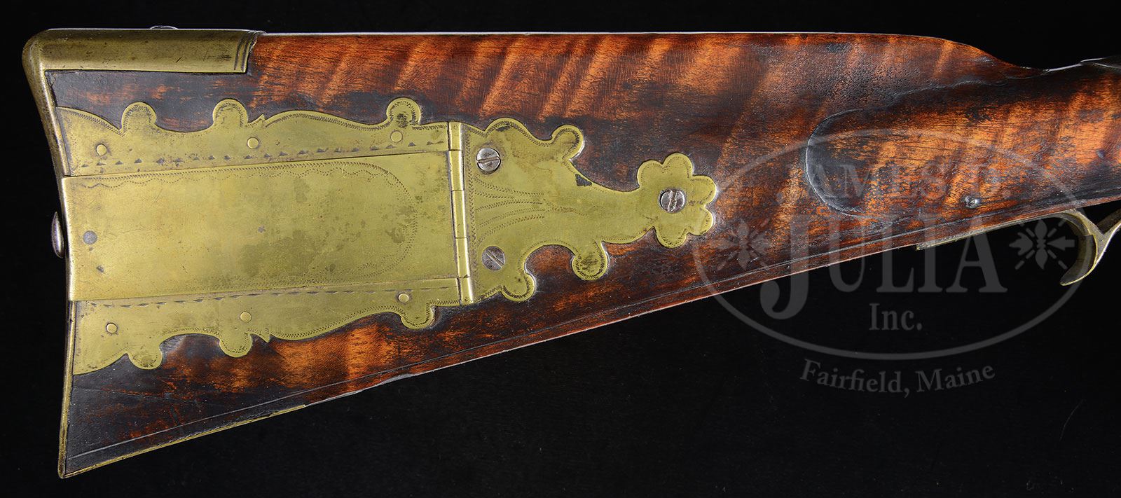 GOLDEN AGE RELIEF CARVED FLINTLOCK KENTUCKY RIFLE OF POSSIBLE SOUTHERN MANUFACTURE.Cal. 52. Overall length 65-1/2″, 5″ x 1-3/4″ buttplate. 49-1/2″ oct to rnd smooth unmarked bbl. This curly maple stocked rifle is profusely relief carved behind, under and forward of its 4-1/4″ long cheekpiece. The rifle has low relief fleur-de-lis carving rear of the bbl tang and has a 4-pc brass engraved patchbox with a daisy head finial. The finial is held to the stock by three wood screws while the patchbox and sideplates are pinned. The brass sideplate is not engraved. PROVENANCE: Collection of Dr. Douglas Sirkin. CONDITION: Very good. the forestock appears to have been replaced. The mainspring appears to be broken. There are small professional replacements forward of the lock and at the toe. Stock remains sound. 4-49976 (10,000-20,000) – Lot 3355 Click here to view provenance