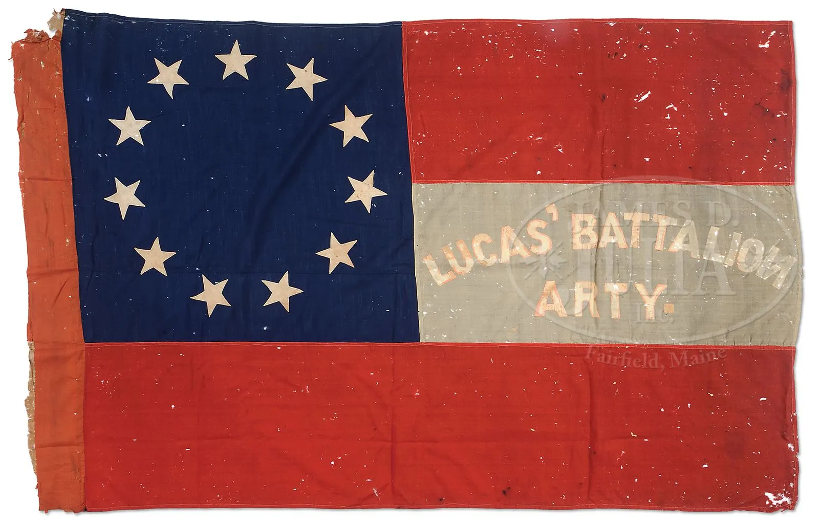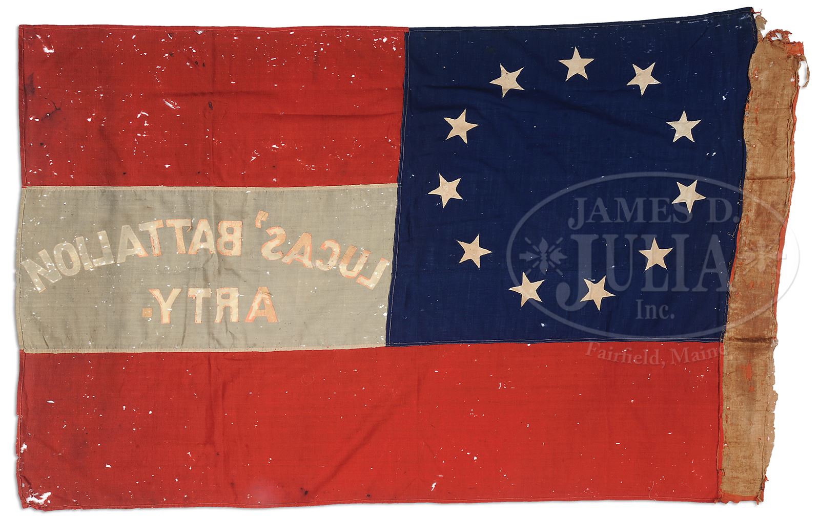 This flag being offered comes from direct family descent being consigned by the great-great granddaughter of Maj. James Lucas. Maj. Lucas commanded the 15th South Carolina Heavy Artillery Battalion and brought this flag home after the war. This flag not only has great aesthetics but can also be traced to its date of manufacture and presentation. A historical report written by noted Confederate vexilliogist and historian Greg Biggs accompanies this flag. The flag is made from fine, light weight single-ply English wool bunting with stars of cotton and lettering made from originally red silk ribbon which has faded to pink where still remaining. Biggs, in his scholarly essay, notes that this flag was invoiced by the firm Hayden & Whilden under contract. Lucas Artillery Battalion was one of several coastal artillery units that protected Charleston Harbor. The battalion was formed June 6, 1861 on James Island where it was mustered into service. James J. Lucas was selected to command the battalion with the rank of Major. Lucas who was born in Kershaw County in 1831 was a son of a noted and prominent Charleston physician. James attended South Carolina Military Academy (the Citadel). James was prominent in the Charleston business community prior to the war and was elected to the state legislature where he served 3 terms. Lucas became part of the Palmetto Guards and served as their captain for 7 years leading up to the war. Upon the secession of South Carolina in December 1860, Lucas became aide-de-camp to Governor Francis Pickens. In that capacity he helped secure war supplies used against Ft. Sumter in April 1861. Lucas and his artillery were orig assigned to the fortifications on Sullivan Island, later moving to Cole’s Island guarding Charleston’s “backdoor” along Stono River and other points. It was here that the battalion gained their greatest success of the war. The USS Isaac R. Smith was a Union Navy blockading vessel that had seen pre-war service on the Hudson River until purchased by the Union Navy in 1861 for service along the coast. She weighed 450 tons and carried nine heavy guns. Her small size and shallow draft made her perfect for operations in the rivers around Charleston including on the Stono. The Confederates soon set a trap to capture the warship. On January 30, 1863, the Union vessel sailed up the river past masked Confederate batteries. Manning guns on one side of the river was a portion of the 15th South Carolina Heavy Artillery while a portion of the 2nd South Carolina Artillery covered the opposite shore. The Smith sailed past the batteries unaware of her predicament and anchored about 4-1/2 miles upstream by a local plantation. It was here that the Confederates opened fire on the ship. Another Union vessel sailed to her rescue but the rebel guns drove her off. Seeing the predicament he was in, the Smith’s commander stuck his colors. The Confederates recovered the ship, repaired it and renamed the CSS Stono. She then served as part of the Confederate Navy squadron around Charleston. Later becoming a blockade runner, she was wrecked at Sullivan’s Island bearing a load of cotton in June 1863. From August and into September, Lucas and his battalion fought in several engagements around Charleston harbor as the Union Navy tried to force entry into the harbor and were rebuffed time and again. Sites included in these fights included Battery Wagner, where two officers were killed, and Fort Sumter. In July 1864, Lucas’ Battalion defended Batteries Pringle and Tynes and defeated an attack by two Union ironclads and three gunboats. Finally, in late 1864, after Atlanta and Savannah in Georgia had both fallen, Union general William T. Sherman set his sights on South Carolina invading the state in early 1865. With the dearth of infantry units to defend it, some of the heavy artillery units about Charleston converted to infantry commands and Lucas and his battalion were so included. Attached to Rhett’s Brigade, Lucas and his troops fought at the battles of Averysboro and Bentonville in North Carolina between March 16 and 21, 1865. Lucas was wounded in both fights and sent to Raleigh to recover. He was there when General Joseph E. Johnston surrendered the Confederate forces in the region in late April 1865 including his battalion. Accompanying this lot supplied by family is a Polaroid photograph of Maj. Lucas’ grave and a frame post-war photograph, circa 1870. This is a fabulous and fresh historic and iconic “stars and bars” Confederate battle flag never previously offered from direct family descent. PROVENANCE: The flag comes from the Great-Great Granddaughter of Major James Lucas. Major Lucas also brought this flag home from the war. It was inherited upon the major’s death by his son, Benjamin Simon Lucas. Benjamin’s son, James Jonathan Lucas, inherited the flag and later gave it to his daughter Eleanor before his passing. Eleanor is the mother of the flag’s current owner who is the last of the Lucas family line on that side. CONDITION: Flag overall is in very good, sound, supple condition with bright colors, scattered small holes from moth damage. The silk ribbons are mostly missing which formed the letters on the flag. Flag measures 40-1/2″ on hoist and 63-1/2″ on fly. There is a 4″ sleeve made of orange cloth backed with polished cotton. The single applique cut-through stars measures 3-1/2″. The letters in unit name measure about 3″ and they are double applique. 49502-1 JS (40,000-60,000) – Lot 3355