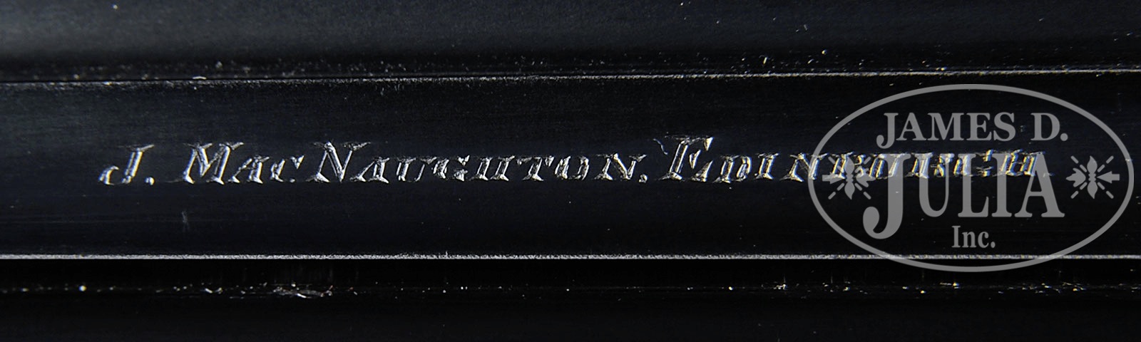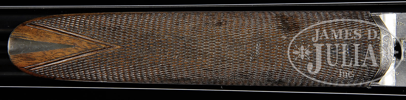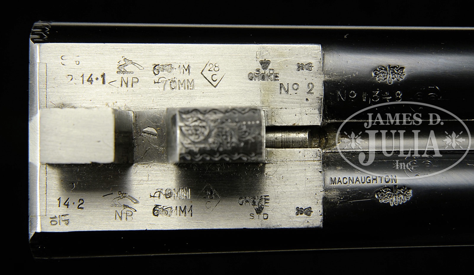 SN 1306. (ca 1897) Cal. 28 ga. 24″ Steel dovetailed bbls, both have slightly raised, concave, game ribs engraved “J. MacNaughton, Edinburgh.” Bbl flats and bottoms of bbls are stamped with London black powder proofs, and London 2010 nitro re-proofs for 2-3/4″ chambers. The bbls are marked “No. 1” and “No. 2” which is also marked on their matching forends. Set “No. 1” is heavily choked (full and full), while set “No. 2” is open choked (skeet and skeet). Round bodied top lever action is fitted with back action peninsula rebounding locks, with short, serpentine, high spurred hammers. Lockplates are engraved “J. MacNaughton”. All metal parts are engraved with about 30% coverage sprays of small scroll. SN is on trigger guard tang. Strikingly fiddle figured and well streaked European walnut straight grip buttstock measures 14-9/16″ over Silver type pad. Classic point pattern checkering is at grip. A circular silver oval is on toe line which is also stamped “120” behind checkering. Matching splinter forends are marked “No. 1” and “No. 2″, are nearly fully checkered, have inset horn tips, and friction spring releases. Bbl set No. 1: Bore diameter: left-.600, right -.601. Bore restrictions: left -.043 (Full), right -.044 (Full). Minimum wall thickness: left -.033, right -.034. Drop at heel: 1-7/8″, drop at comb: 1-7/16″. Weight: 4 lbs. 14 oz. LOP: 14-9/16″. Bbl set no. 2: Bore diameter: left-.554, right -.550. Bore restrictions: left -.002 (Skeet), right -.006 (IC). Minimum wall thickness: left -.050, right -.050. Drop at heel: 1-15/16″, drop at comb: 1-3/8″. Weight: 5 lbs. 5 oz. LOP: 14-9/16”. Makers leather case with brass corners has an inset rectangular brass plaque on lid engraved “Capt. Colin MacRae”. Interior is lined in what used to be scarlet cloth with orig paper MacNaughton label on lid. Case has nicely fitted compartments for action and both sets of bbls. Case contains one piece of a 2-pc ebony and brass cleaning rod, and a turned and un-fitted spare lock pin. CONDITION: Fine. Bbls retain nearly all of an excellent quality rust blue, most likely done at time of re-proof. Action and lockplates retain traces of orig case hardening color, but are mostly a smooth pewter gray. Top lever and trigger guard are re-blued, and engraving slightly washed. Stocks retain most of what appears to be their orig hand rubbed oil finish, with some maintenance over the years with added oil, over a number of small nicks and bumps. Checkering is somewhat worn. Forend no. “1” has considerable chipping at both sides of front. Bores are excellent. Action is tight. Bbls are on face. Locks are crisp. Hammer screw of left lock is a nicely done replacement, has not been engraved. Case leather has considerably darkened and has many scuffs and rubs. Straps and handle are good. Interior cloth is considerably faded. There is some insect damage, soiling, and rubs through from contact with gun and bbls. Label is oil soaked and foxed. Partitions are tight. A nifty, fast handling little hammer gun. 4-50425 MGM175 (12,000-17,000) – Lot 3357