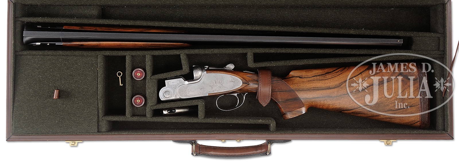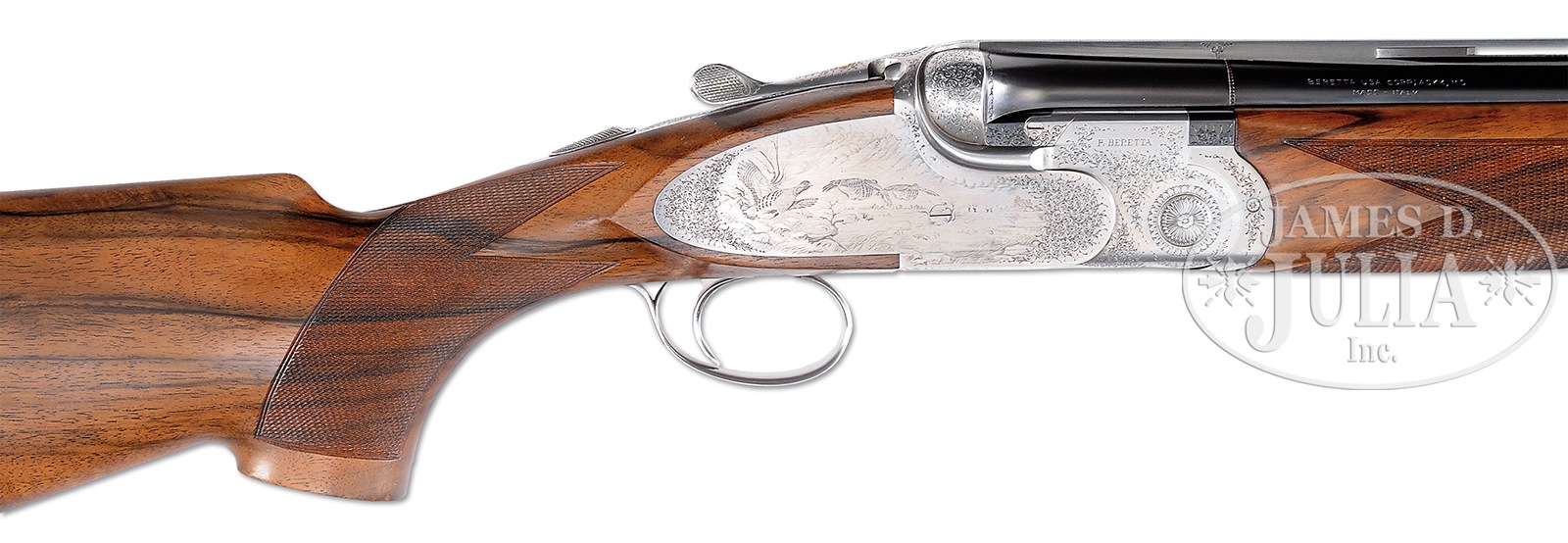 *FINE BERETTA SO9 OVER-UNDER SHOTGUN WITH BULINO AND SCROLL ENGRAVING BY D. BONSI AND S. VENZI, WITH CASE.SN AAA203B. (1995) Cal. 12 ga. 3″ Chambers. 28″ Mono-bloc bbls fitted with flat, matted, ventilated rib, are engraved “P. Beretta – ITALY” and with importer (Beretta USA) on top bbl either side of rib. Upper left portion of mono-bloc is engraved with caliber and bbl length. Mono-bloc is stamped with 1995 Italian nitro proofs, and is engine turned on sides. Bbls are fitted with Briley interchangeable choke tubes. Coin finished, low profile OU action fitted with non-automatic safety and non-selective single trigger, is engraved with makers name on each side and on bottom. Action is engraved with 60% coverage well cut small scroll surrounding meticulously rendered bulino game scenes of game birds; pheasant flushing over meadow on left lockplate, trio of chukar partridge flushing over field on right, and a pair of woodcock flitting through alders on bottom. This fine engraving is signed “D. Bonsi” and “S. Venzi” on trigger plate. An imperial crown is inlaid in gold on top lever. Single beaded small bow trigger guard with scroll engraving on bow, has grade engraved on tang. Well marbled and lightly figured European walnut deep pistol grip buttstock measures 14-5/8″ over russet brown leather covered pad. Point pattern checkering with line border is at grip. Matching one piece forend has Beretta’s rendition of a Deeley release. Bore diameter: top -.724, bottom – .723. Bore restrictions: screw chokes. Wall thickness: top – .035, bottom – .038. Drop at heel: 2-1/4″, drop at comb: 1-1/2″. Cast off approx 1/4″. Weight: 7 lbs. 13 oz. LOP: 14-5/8″. High quality leather case by Vera Pelle with stitched leather corners is lined in dark olive felt, and has dark brown leather Beretta label in lid. Case has space for an extra set of bbls, and contains a pair of plastic snap caps, and three additional choke tubes (two in the gun) and wrench. CONDITION: Excellent, showing limited use, with a small number of minor marks and rubs on bbls. Coin finish remains bright overall. Stocks have some light handling marks. Checkering is excellent with tops of diamonds hand polished, and some flat diamonds on left side of grip. Mechanically crisp. Case leather is excellent with a number of rubs and scuffs. Interior cloth is excellent with some light rubs. 50401-9 MGM33 (20,000-30,000) – Lot 3357