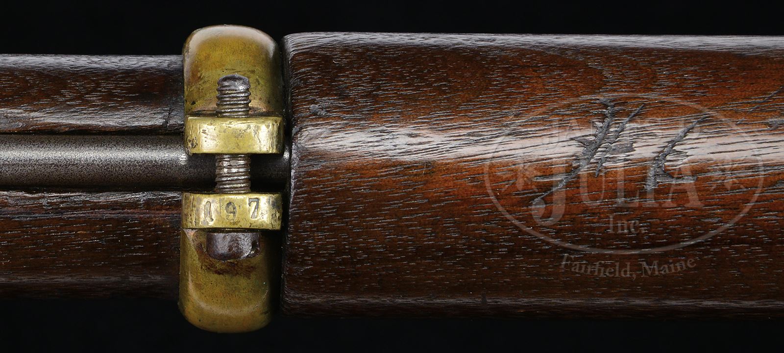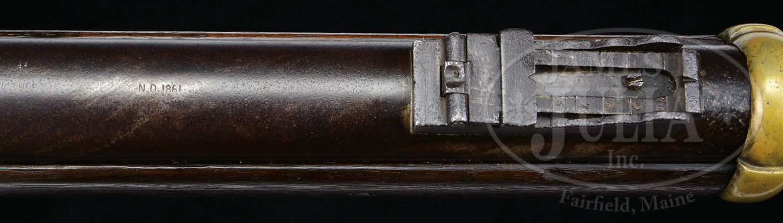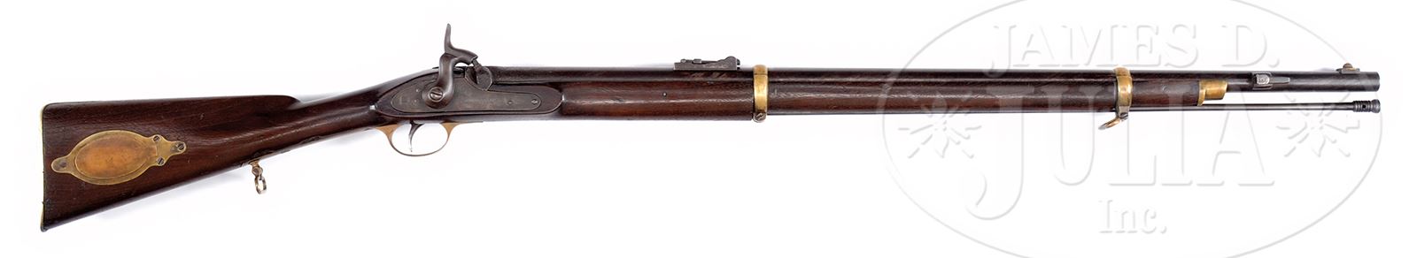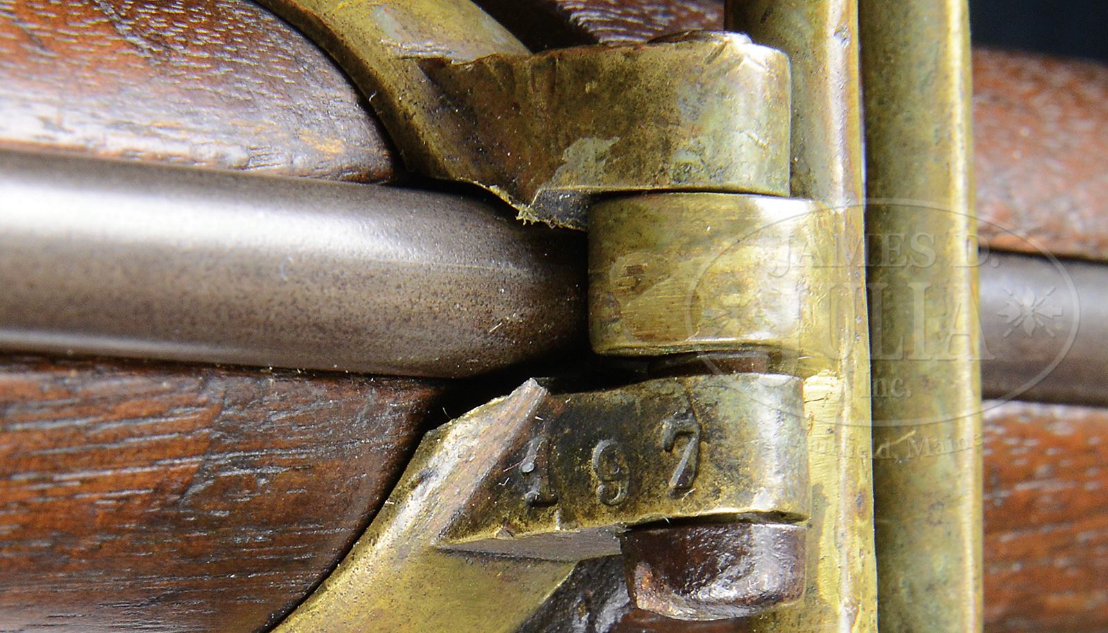 EXTREMELY RARE EARLY NEW ORLEANS COOK RIFLE.SN 197. This is an extremely early and extraordinarily rare product of Cook & Brother Manufacturing of New Orleans. There are no more than 4 or 5 examples known of these classic 33″ Damascus barreled rifles with factory patchboxes. These early Cooks made in 1861 and so dated have interesting early features such as the stubby, distinct Cook hammer, saber bayonet lug with rail SNd to match gun and large fixed iron block front sight with inset dovetailed brass blade. Rear of hammer the lock is marked with the earliest version of Confederate First National flag and “COOK & BROTHER N.O. 1861” is found forward of hammer. The bbl is also marked “COOK & BROTHER N.O. 1861” rear of adjustable long-range rear sight. John Murphy and Howard Madaus in their monumental text Confederate Rifles and Muskets discuss these rare New Orleans rifles at length. We are only aware of possibly one other example of this extremely rare New Orleans rifle with patchbox which is in private hands. PROVENANCE: Damon Mills 2004; Collection of Jim Maconkey. CONDITION: Very good to fine overall. Metal overall brown with pitting. Markings are mostly discernible as can be seen in photographs. SNs found externally on lock, screws, bayonet lug and bbl bands. Stock is sound and solid with a well disguised and expert wrist repair. Soldier’s name is scratched into buttstock and is only partially discernible. Rear sling swivel and brass blade to front sight are possible restorations, but match gun very well. Mechanically gun is sound and functioning with crisp well defined rifling in bore. 49442-11 JS (25,000-35,000) – Lot 3358