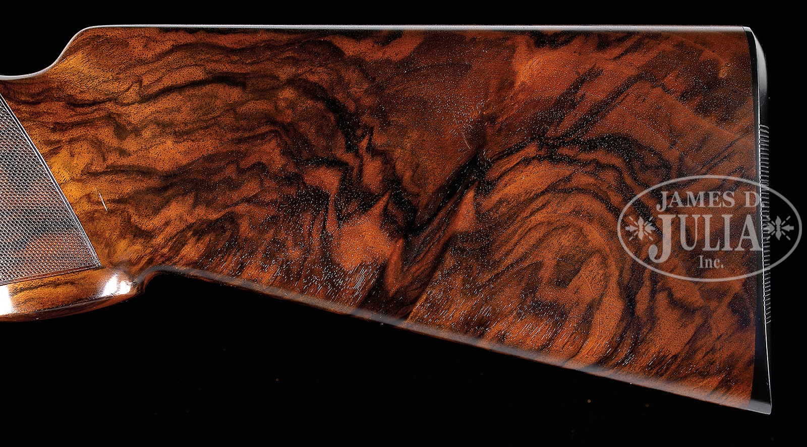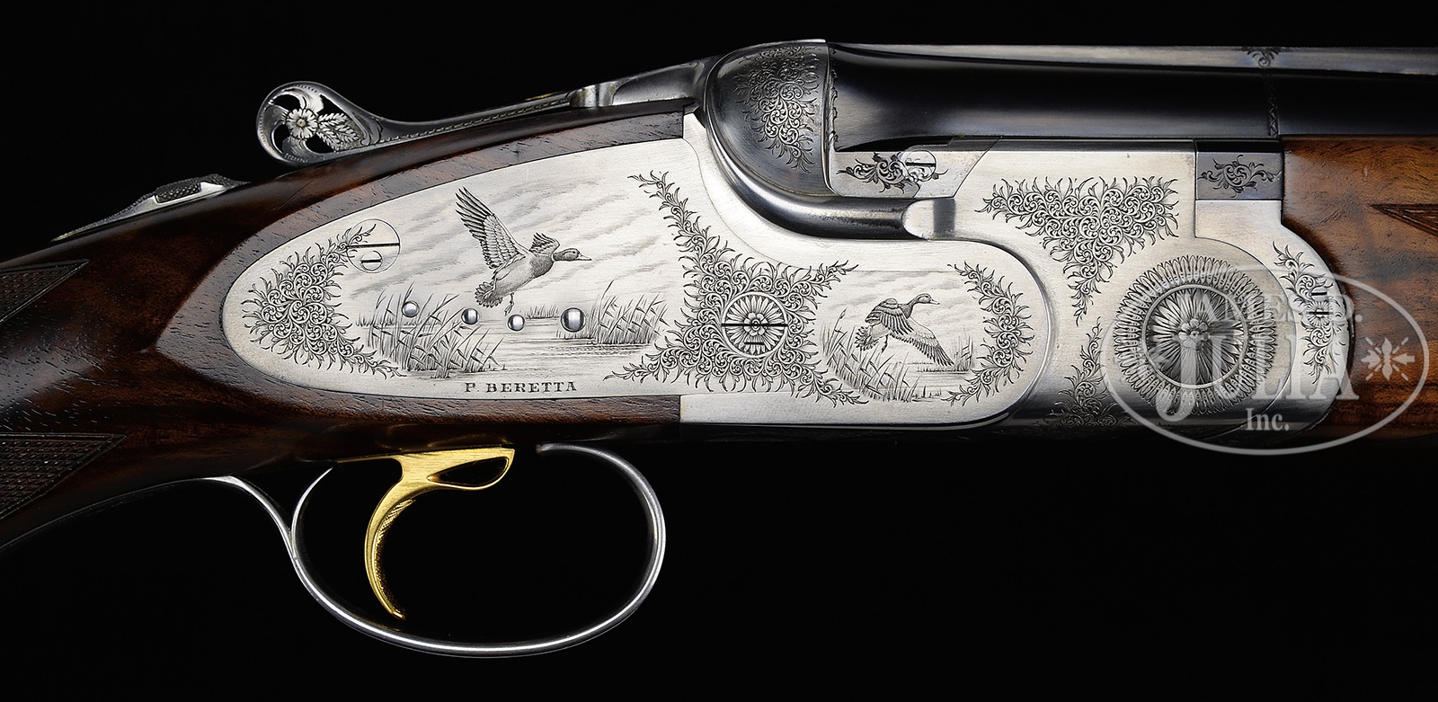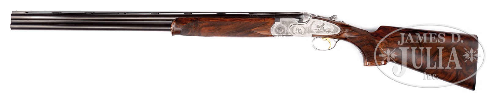 SN C12115B. Cal. 12 ga. 28″ Mono-bloc bbls with interchangeable chokes fitted, have hand matted, ventilated rib, and are marked “P. Beretta Italy” on left side of top bbl. Bottom of mono-bloc are stamped with 1990 Italian nitro proofs for 2-3/4″ chambers, and with grade and SN. Coin finished, low profile, Beretta sidelock OU action is nicely filed and has pierced thumbpiece. Action features single selective trigger and non-automatic safety. Action is engraved with very well cut small shaded scroll surrounding lifelike vignette of flying woodcock and tree branch on bottom, which is also engraved “P. BERETTA” “BREVETTATO” and “MADE IN ITALY”. Lockplates with more scroll have scenes of flying chukar partridge quartering toward viewer at rear and quartering away toward front on left plate, and mallard drake settling into marsh at rear of right plate with hen in same attitude toward front. This well detailed work is signed “C Giovanelli” on trigger plate. A gold crown is inlaid on top lever, and “SPORTING” is in gold on double beaded trigger guard bow. Grade is on tang. Beautifully marbled and somewhat figured European walnut flared pistol grip buttstock measures 14-3/8″ over ribbed composition buttplate. Point pattern checkering with line borders is at grip. Field type schnabeled one piece forend has Deeley type release. Drop at heel: 2-1/8″, drop at comb: 1-1/4″. Cast: approx 1/2″ off. Weight: 7 lbs. 11 oz. LOP: 14-3/8″. Bluish gray ABS Beretta marked case is lined in bluish blanket weave cloth, with compartment for tools, etc in lid, and contains 3-pc rosewood and brass cleaning rod, stock removal tool, instruction manual, guarantee, multi-tool, as well as 6 Briley choke tubes (2 in gun giving a total of 8) with wrench. CONDITION: Excellent, very near to new, with only a few handling and assembly marks, and with evidence of very little firing, with light halos on breechface. Mechanically crisp. Case is excellent, as are accessories. 51070-3 MGM285 (15,000-25,000) – Lot 3359