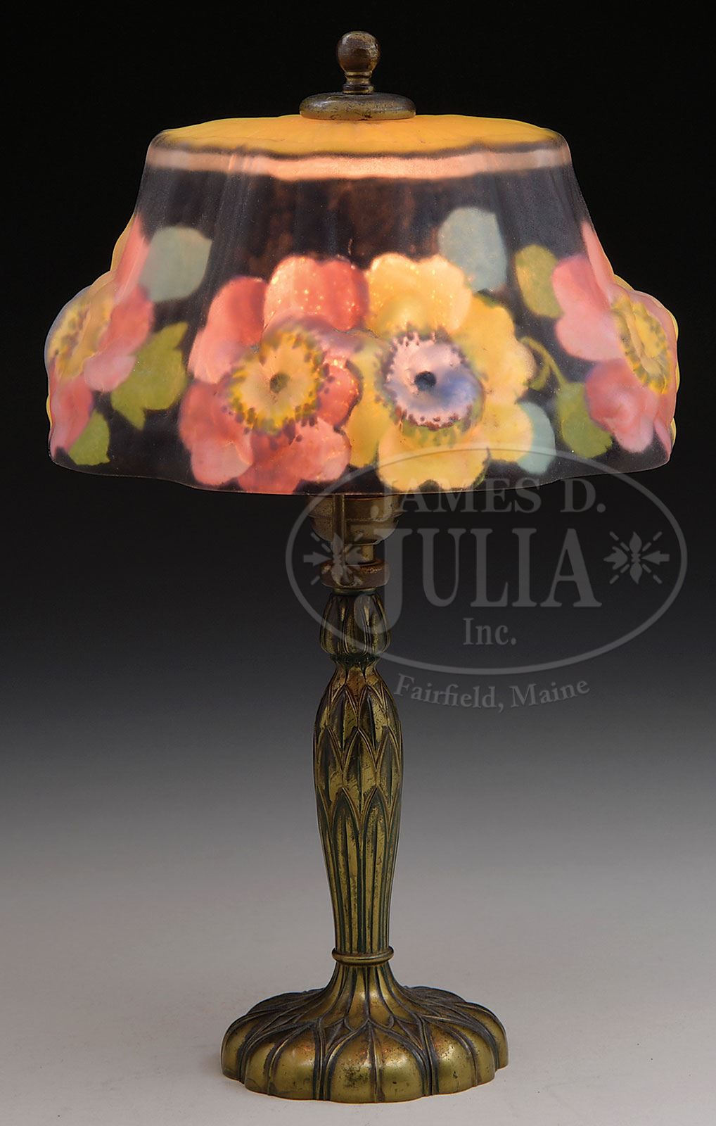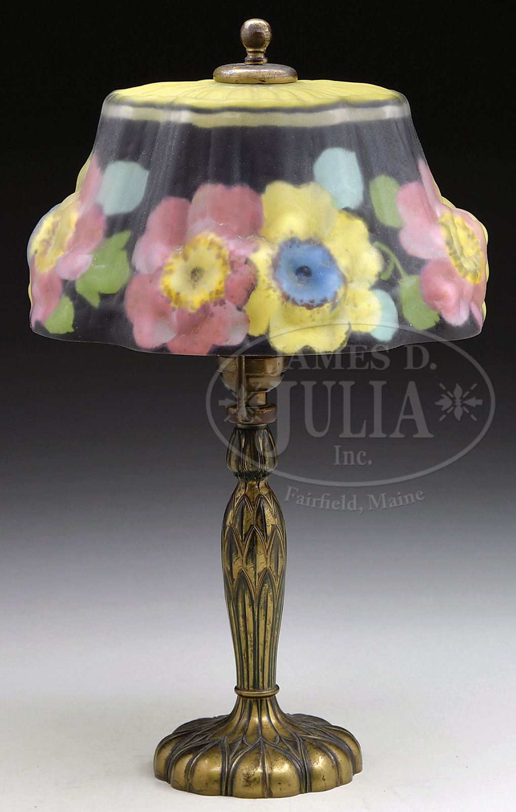 PAIRPOINT PUFFY BOUDOIR LAMP.Pairpoint Puffy boudoir lamp has reverse painted puffy shade with yellow and pink flowers encircling the side of the shade against a black background. Top of shade has ribbing extending out from the fitter and is finished in bright yellow. Shade rests on a Pairpoint artichoke boudoir base. Shade is signed in gold “The Pairpoint Corpn.” Base is signed “Pairpoint” along with the Pairpoint logo and “C3064”. SIZE: Shade is 8-3/4″ dia. Lamp is 14-1/2″ t. CONDITION: Very good to excellent with some normal wear to finish on base. 5-66945 (1,800-2,200) – Lot 3360