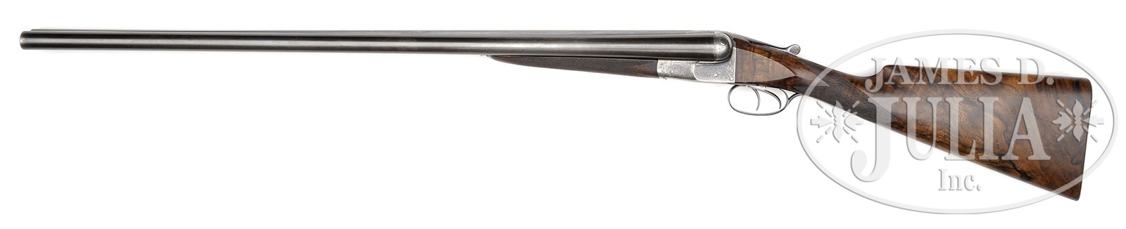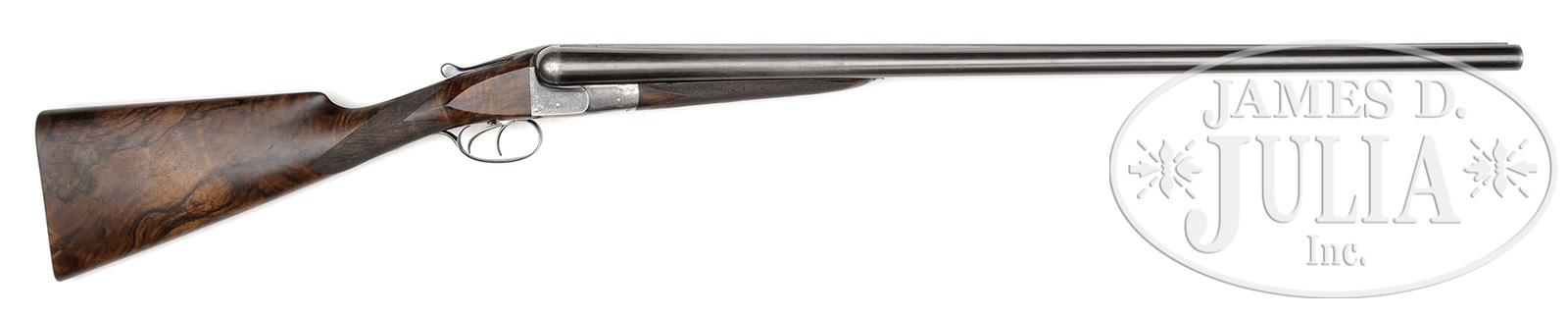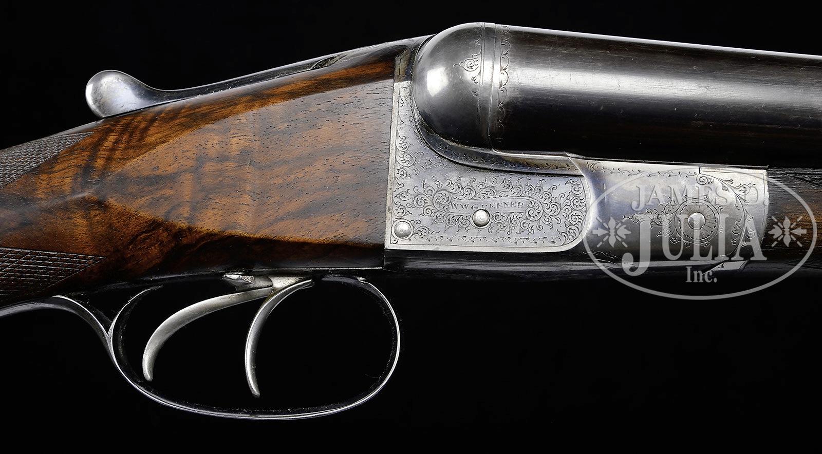 *W. W. GREENER GRADE “M” “FACILE PRINCEPS” EJECTOR PIGEON GUN.SN 48020. (ca 1899) Cal. 12 ga. 3″ Chambers. 30″ Dovetailed steel bbls with raised, flat, matted rib having game bird engraved on rear portion, are engraved “W. W. Greener. 68 Haymarket London & St. Mary’s Square Birmingham. England.” and “Winner at the London Gun Trials, 1875, 1877, 1878 & 1879. “Siemen Steel”” on tops. Bbl flats and bottoms of bbls are stamped with Birmingham black powder proofs, SNs, elephant logos, and “Siemens”. Bbls have been fitted with Briley TI thin wall choke tubes. Case hardened boxlock action with crossbolt third fastener, does not have a tang or side safety, but is fitted with a pivoting trigger block safety on right side of trigger plate. Action is engraved with 30% coverage well cut small scroll. “W. W. GREENER” is in scroll terminated ribands on each side. Blued steel trigger guard is engraved with scroll on bow and SN on short tang. Beautifully marbled and lightly figured Circassian walnut straight grip buttstock measures 14-1/8″ over checkered wood butt, and has been converted to straight grip from what was most likely a semi-pistol grip. Borderless point pattern checkering is truncated. Splinter ejector forend has Anson release and is fitted with Baker ejectors. Iron is stamped with “Patent Ejector” and engraved “Grade M”. Bore diameter: left-.736, right -.735. Bore restrictions: Screw chokes. Minimum wall thickness: left -.044, right -.045. Drop at heel: 2″, drop at comb: 1-1/2″. Weight: 7 lbs. 14 oz. LOP: 14-1/8″. CONDITION: Fine. Bbls retain most of what appears to be their orig blue, considerably thinned at normal carry area. Action retains approx 40% orig case hardening color, vivid where protected, balance smooth silver gray. Top lever and trigger guard retain a considerable amount of their orig bright blue. Guard tang screw does not sit flush. Stocks retain most of an old oil finish, which is rather dry, with a number of light handling marks. Bores are excellent, with some slight striations. Action is tight. Ejectors are in time. 4-50374 MGM169 (3,000-5,000) – Lot 3361