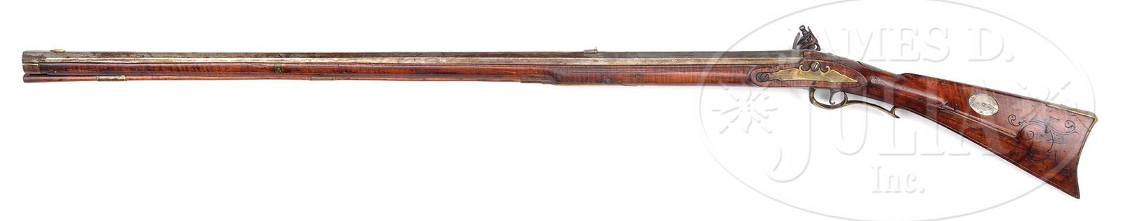 EARLY BUCKS COUNTY INCISED CARVED FLINTLOCK RIFLE.Cal. 68. Overall length 56″, 4-1/2″ x 1-3/4″ buttplate. 41″ full oct smooth unmarked bbl. This rifle has Bucks County incised carving behind cheekpiece and a 2-pc brass patchbox which appears to have been recently engraved with Schuler type engraving on the door. This is a heavy rifle with a hand forged German lock and Bucks County incised carved fleur-de-lis behind the lock and side plate mortise and where the comb meets the wrist. The incised carving around the bbl tang is also of the Buck County style. There is a large silver inlay on the top of the wrist. Rear ramrod entrance ferrule has a 5″ long tang, a characteristic of Buck County rifles. PROVENANCE: Collection of Dr. Douglas Sirkin. CONDITION: Gun has undergone in service renovations including replacement of lock, sideplate, and triggerplate. About 5″ of forend wood has been replaced at the muzzle along with old repaired forestock cracks along bbl. 4-50128 (12,000-18,000) – Lot 3361