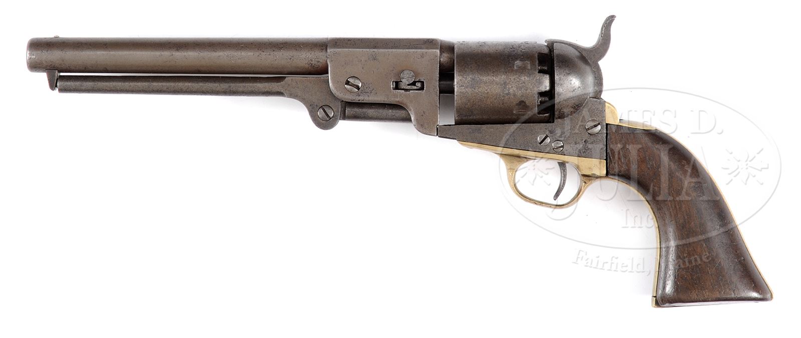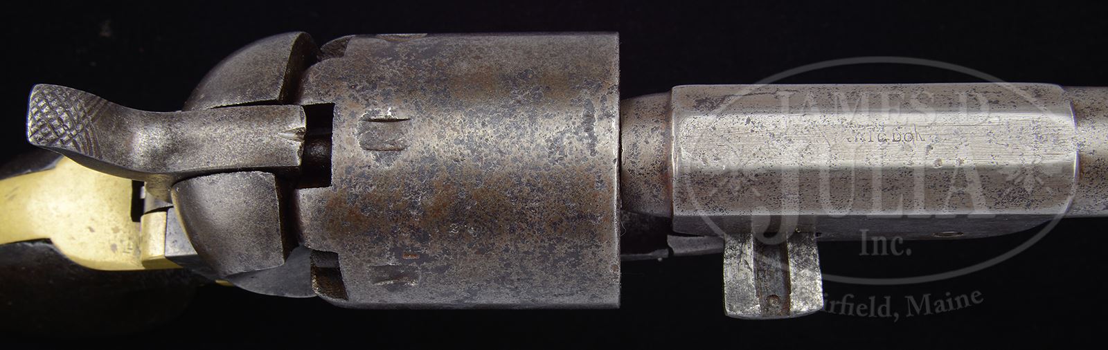 VERY RARE CONFEDERATE LEECH & RIGDON REVOLVER SN 25.SN 25. This rare Confederate revolver with small die stamped “LEECH & RIGDON” only is first noted on this particular gun SN 25 with the highest small die stamps proceeding to about SN 375 as 377 first appears with larger dies. These earliest guns probably total only 75 revolvers made in Columbus, Mississippi (per document cited in text by Bill Gary, Confederate Revolvers) due to the factory being forced to move their manufacturing operation in December 1862 due to Union threat. A great detail of production notes and opinion concerning these rare pistols can be found in William Gary Confederate Revolvers and American Society of Arms Collectors articles published by Ted Meredith and Kent Wall. (Kent Wall & Bruce Kusrow, leading Leech scholars opine and reason in these articles that possibly all 375 “small die” guns were made in Columbus). Regardless, there are only 10 known Columbus, Mississippi surviving guns SN under 75 that show the dramatic physical changes as the company improved their product. This is among the best provenanced and well known of Columbus, Mississippi produced guns by Leech & Rigdon and this is a fine complete example. PROVENANCE: Cecil Anderson Collection pictured on pages 16-18 North South Trader magazine, July/August 1985; Kent Wall Collection pictured on the cover and page 27 of North South Trader Civil War magazine, Spring 1997; an article by Kent Wall and William Beard, Hendershott Catalog #111, December 2000; Collection of Jim Maconkey 2004. CONDITION: Metal with old cleaning, grey with white pitting overall. SNs and markings discernible though only about half of the letters in Leech & Rigdon are complete as can be seen in photographs. Gun appears orig and complete. SN 25 found on bbl, frame, trigger guard, backstrap, loading arm, wedge, cylinder, cylinder pin and bottom of right stock (though worn and barely discernible as two indiscernible numbers). Stocks are sound and solid with edge wear, hand worn patina well fit to gun. The loading lever catch is unserialized but over half these earliest models are not serialized and latch has matching patina, tooling and surface matching rest of gun. The loading arm screw is also SNd “36”. This is only the 3rd Leech & Rigdon known with SNd screws all in the earliest production; the other two examples are 15 which is being sold as the previous lot (the rare and unique “NOVELTY WORKS” marked pistol) and SN 52. Gun is a bit loose, frame pins can be seen through worn thin walls of bbl housing and a small shim was added to cylinder pin slot to make it tighter. Mechanically gun is functional with crisp rifling in bore though pitted. 49442-3 JS (30,000-35,000) – Lot 3361
