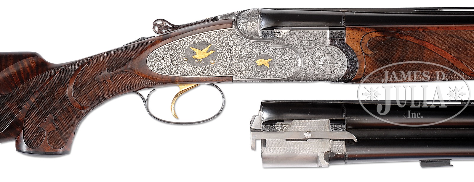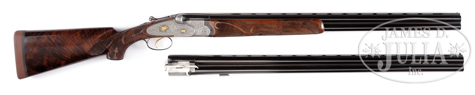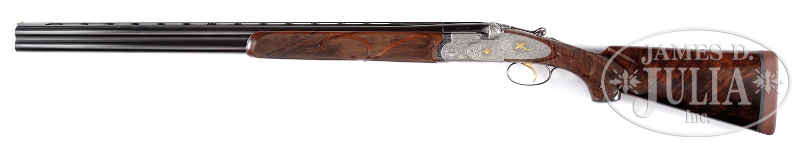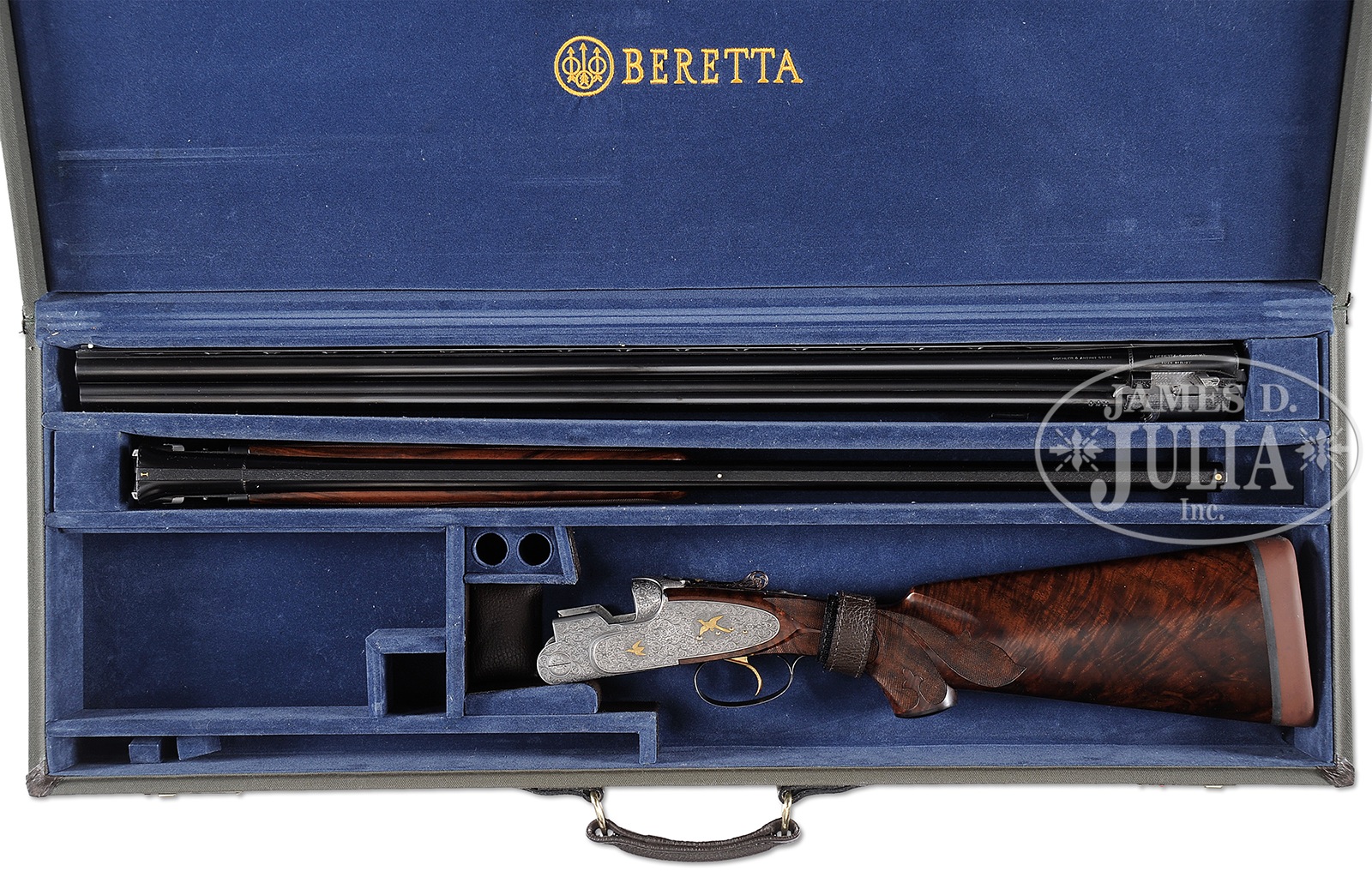 *UNUSUAL BERETTA S3EELL PIGEON GUN WITH FINE SCROLL AND GOLD INLAY BY TONONCELLI WITH EXTRA BARRELS AND CASE.SN 30189. Cal. 12 ga. 2-3/4″ Chambers. 28″ and 30″ Mono-bloc bbls are gold inlaid “I” and “II” at rear portions of narrow, matted, ventilated ribs. Left sides of bbls and mono-blocs are marked with steel type and Beretta name and address, along with “MADE IN ITALY”. Sides of mono-blocs are engine turned, and bottoms are stamped with 1965 Italian nitro proofs, grade and SNs. Choke stars are on left sides of bbls. Coin finished, low profile, sidelock action features non-automatic safety, double Kersten type bolt, and gold plated single non-selective trigger. Action and lockplates are engraved with full coverage open shaded scroll with multi-floral and acanthus highlights surrounding gold inlaid game birds in oval and circular motifs; two pigeons on bottom of action, pheasant and snipe on left lockplate, and a duck and grouse on right. Engravers signature “S. Tononcelli” is on trigger plate. Blued top lever, with thumbpiece pierced in floral motif, is gold inlaid with a crown. Trigger guard with more scroll, has SN on tang. Exceptional high quality, beautifully flame figured, dense American walnut rosewood capped pistol grip buttstock measures 14-1/8″ over brown KICKEEZ pad. Borderless checkering at grip is very cleanly cut. Checkering features fleur-di-lis and ribbons through pattern along with large flourishes into butt. Matching long one piece forend has Deeley type release, and a gold sparrow inlet above escutcheon. 28″ BBL SET “I”: Bore diameter: top -.725, bottom – .723. Bore restrictions: top – .022 (mod), bottom – .011 (lt mod). Drop at heel: 1-7/8″, drop at comb: 1-7/16″. Cast: approx 1/4″ off. Weight: 7 lbs. 15 oz. LOP: 14-1/8″. 30″ BBL SET “II”: Bore diameter: top -.725, bottom – .723. Bore restrictions: top – .042 (extra full), bottom – .023 (mod). Drop at heel: 1-13/16″, drop at comb: 1-3/8″. Cast: approx 1/4″ off. Weight: 7 lbs. 15 oz. LOP: 14-1/8″. Makers green canvas case with stitched leather corners is lined in blue velvet with Beretta embroidered in gold in lid. PROVENANCE: Remarkable William Larkin Moore Private Estate Collection of Fine Sporting Arms. CONDITION: Excellent, as refurbished. Both sets of bbls retain nearly all of what appears to be their orig blue. Coin finish of action remains bright, with little evidence of cleaning. New stocks retain essentially all of their fine hand rubbed oil finish, with only one or two of the faintest of handling marks. Checkering remains light in color, with almost no wear. Bores are excellent. Action is tight. Ejectors are in time. Trigger works. Case is very good, with some scuffs on exterior, and a few compressions and rubs on interior. 50594-74 MGM82 (12,500-22,500) C&R – Lot 3361