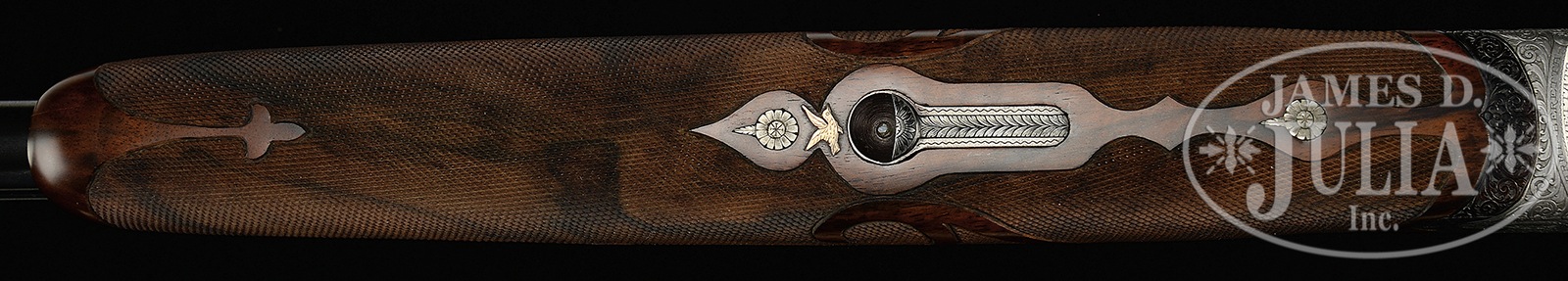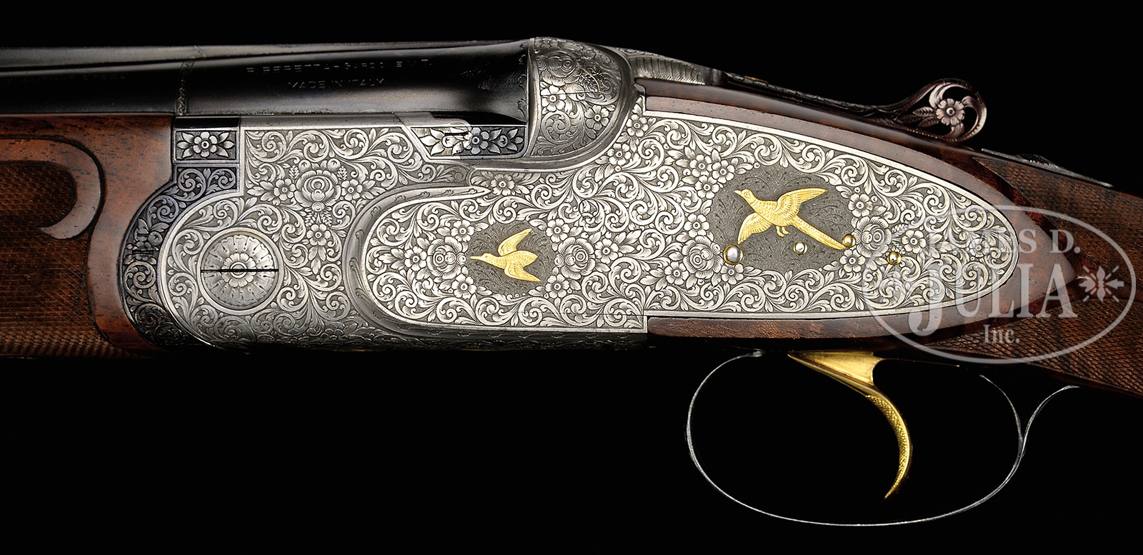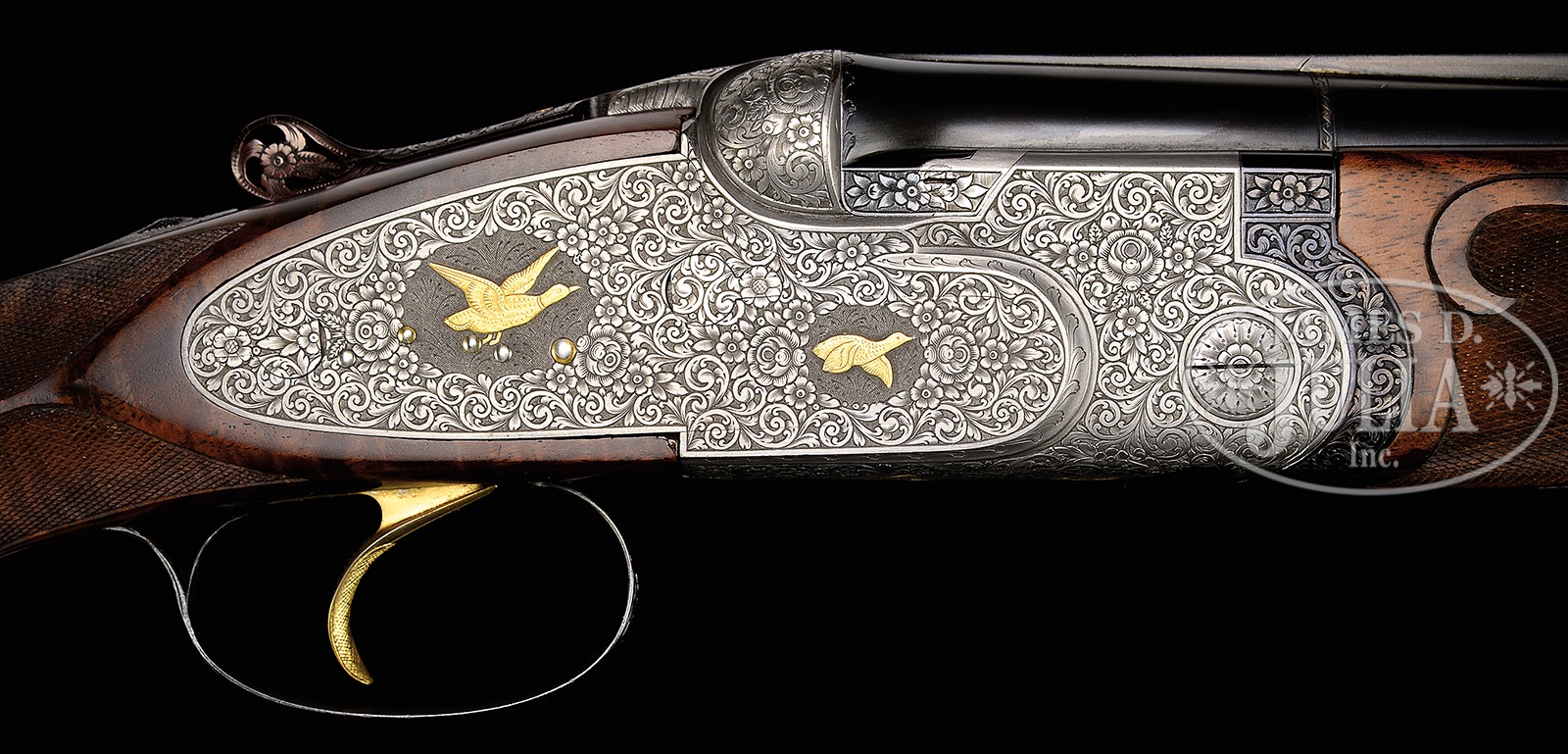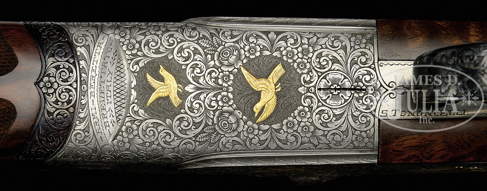 *UNUSUAL BERETTA S3EELL PIGEON GUN WITH FINE SCROLL AND GOLD INLAY BY TONONCELLI WITH EXTRA BARRELS AND CASE.SN 30189. Cal. 12 ga. 2-3/4″ Chambers. 28″ and 30″ Mono-bloc bbls are gold inlaid “I” and “II” at rear portions of narrow, matted, ventilated ribs. Left sides of bbls and mono-blocs are marked with steel type and Beretta name and address, along with “MADE IN ITALY”. Sides of mono-blocs are engine turned, and bottoms are stamped with 1965 Italian nitro proofs, grade and SNs. Choke stars are on left sides of bbls. Coin finished, low profile, sidelock action features non-automatic safety, double Kersten type bolt, and gold plated single non-selective trigger. Action and lockplates are engraved with full coverage open shaded scroll with multi-floral and acanthus highlights surrounding gold inlaid game birds in oval and circular motifs; two pigeons on bottom of action, pheasant and snipe on left lockplate, and a duck and grouse on right. Engravers signature “S. Tononcelli” is on trigger plate. Blued top lever, with thumbpiece pierced in floral motif, is gold inlaid with a crown. Trigger guard with more scroll, has SN on tang. Exceptional high quality, beautifully flame figured, dense American walnut rosewood capped pistol grip buttstock measures 14-1/8″ over brown KICKEEZ pad. Borderless checkering at grip is very cleanly cut. Checkering features fleur-di-lis and ribbons through pattern along with large flourishes into butt. Matching long one piece forend has Deeley type release, and a gold sparrow inlet above escutcheon. 28″ BBL SET “I”: Bore diameter: top -.725, bottom – .723. Bore restrictions: top – .022 (mod), bottom – .011 (lt mod). Drop at heel: 1-7/8″, drop at comb: 1-7/16″. Cast: approx 1/4″ off. Weight: 7 lbs. 15 oz. LOP: 14-1/8″. 30″ BBL SET “II”: Bore diameter: top -.725, bottom – .723. Bore restrictions: top – .042 (extra full), bottom – .023 (mod). Drop at heel: 1-13/16″, drop at comb: 1-3/8″. Cast: approx 1/4″ off. Weight: 7 lbs. 15 oz. LOP: 14-1/8″. Makers green canvas case with stitched leather corners is lined in blue velvet with Beretta embroidered in gold in lid. PROVENANCE: Remarkable William Larkin Moore Private Estate Collection of Fine Sporting Arms. CONDITION: Excellent, as refurbished. Both sets of bbls retain nearly all of what appears to be their orig blue. Coin finish of action remains bright, with little evidence of cleaning. New stocks retain essentially all of their fine hand rubbed oil finish, with only one or two of the faintest of handling marks. Checkering remains light in color, with almost no wear. Bores are excellent. Action is tight. Ejectors are in time. Trigger works. Case is very good, with some scuffs on exterior, and a few compressions and rubs on interior. 50594-74 MGM82 (12,500-22,500) C&R – Lot 3361