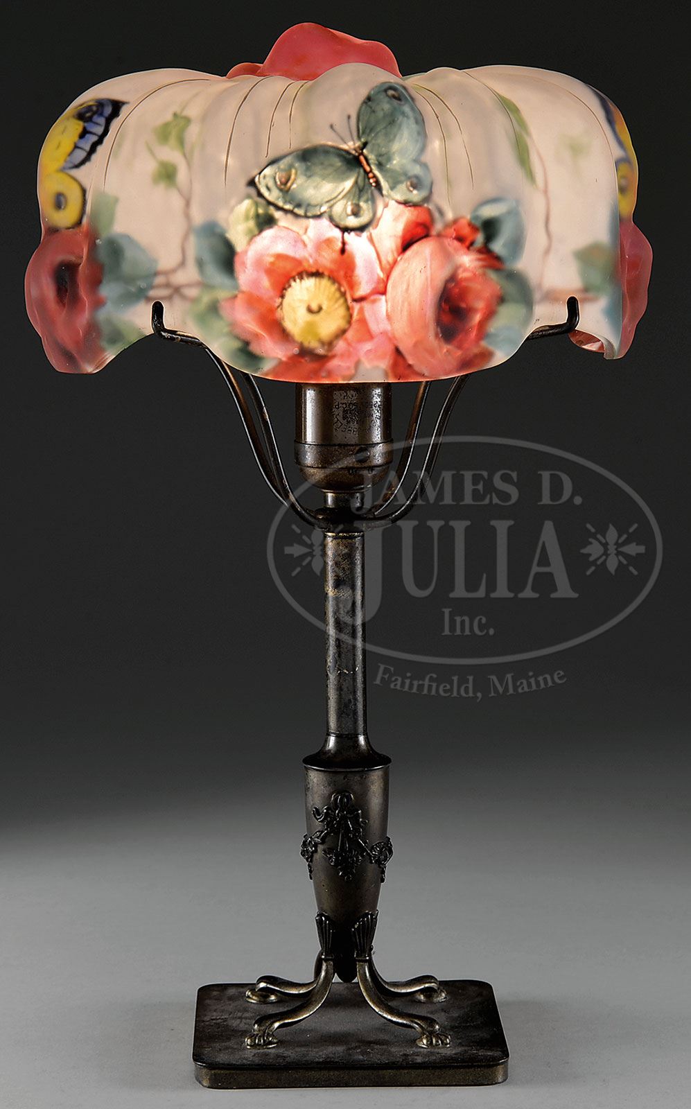 PAIRPOINT PUFFY BOUDOIR LAMP.Pairpoint Puffy boudoir lamp has red roses at each corner and a red rose at the top. Colorful butterflies are flying above the roses at each corner all set against a white background with green and blue shaded leaves. Shade rests on a Pairpoint base with four lion paw feet and a spray of flowers surrounding the stem. Base is signed on the underside “Pairpoint Mfg. Co.” with the Pairpoint logo “B3025”. Shade is signed on inside edge in gold “The Pairpoint Corp’n Patented July 9th 190?”. SIZE: Shade is 9″ dia at widest. Lamp is 16″ t. CONDITION: Very good to excellent with some wear to finish on base. 5-67755 (2,500-3,000) – Lot 3363