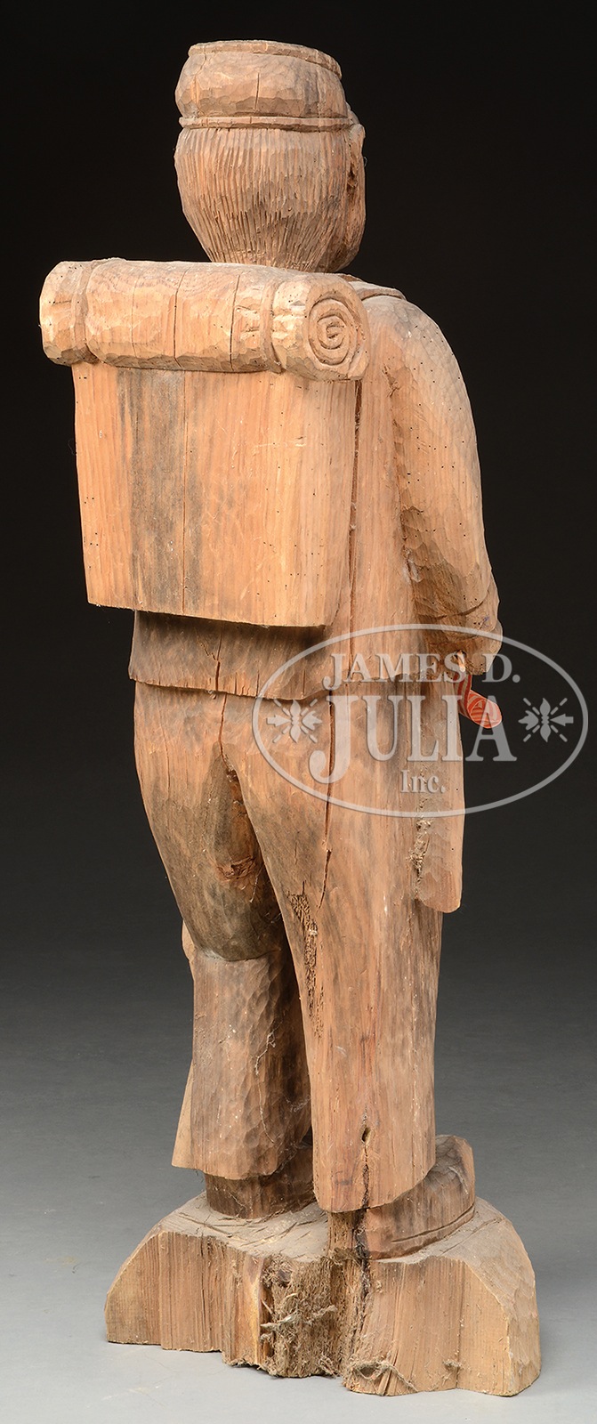 CARVED HALF SIZE CIVIL WAR SOLDIER WITH RIFLE AND BACKPACK.The cigar store style figure, unpainted with nice weathered patina. Probably late 19th early 20th century. SIZE: 41″ h. PROVENANCE: From the personal estate collection of John W. Armiger Jr. CONDITION: Some shrinkage cracks and back third of base missing, otherwise good. 49055-90 (2,000-3,000) – Lot 3363