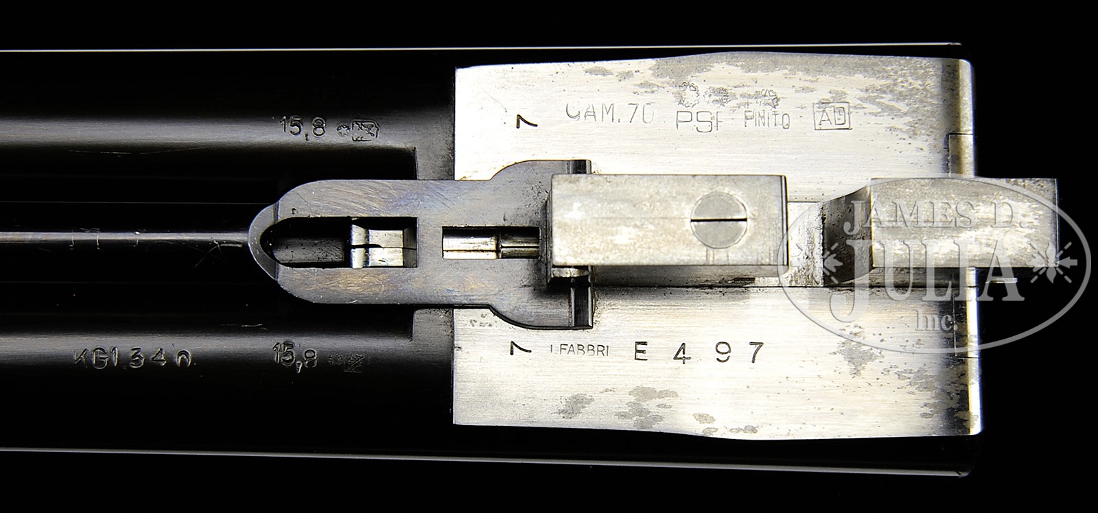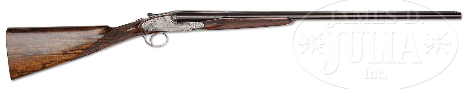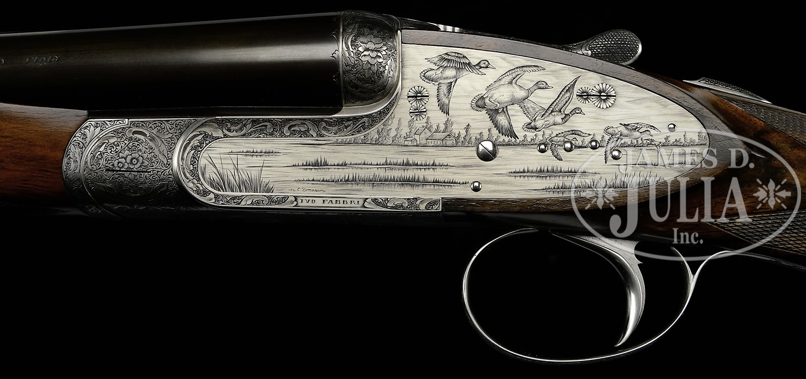 *VERY FINE TOMASONI ENGRAVED IVO FABBRI SELF-OPENING SIDELOCK GAME GUN WITH CASE.SN E497. (1978) Cal. 20 ga. 2-3/4″ Chambers. Finely struck 27″ chopper lump bbls with semi-raised, flat, matted rib are engraved “BOEHLER SUPER BLITZ STEEL” on side of right bbl, and “IVO FABBRI BRESCIA ITALY” on side of left bbl. Bbl flats are stamped with 1978 Italian nitro proofs for 2-3/4″ chambers. Bbls are fitted with Holland & Holland type self-opening assist spring. Coin finished sidelock action features non-automatic safety (SAFE engraved), line engraved tumbler end cocking indicators, and single non-selective trigger. Action is engraved with well done, shaded small scroll as background for larger scrolled acanthus and floral highlights, framing oval vignette of three snipe diving over marsh on bottom. “IVO FABBRI” is on bottom of each side under lockplates. Lockplates are fully engraved to the edge in a style originated by Harry Kell, with Bulino game scenes in finely detailed backgrounds; a flock of mallards wing across open marsh with low woods and buildings in background on left lockplate; and on the right, a flock of Hungarian partridge attempt escape over open cropland with two hapless individuals falling from sky, with feathers flying, obviously hit. This fine work is by noted engraver Claudio Tomasoni, whose signature appears at the bottom of each lockplate scene and on trigger plate. Single beaded trigger guard is engraved in style matching action, with SN at grip. Finely marbled European walnut straight grip buttstock measures 13-3/4″ over fully checkered wood butt. Well cut, borderless, point pattern checkering is at grip and on matching small beavertail ejector forend with Anson release. Bore diameter: left-.621, right -.621. Bore restrictions: left -.025 (IM), right -.025 (IM). Minimum wall thickness: left -.042, right -.042. Drop at heel: 1-5/8″, drop at comb: 1-7/16″. Weight: 6 lbs. 12 oz. LOP: 13-3/4″. High quality black leather case with stitched leather corners is lined in scarlet velvet. Case contains straps for exterior, and engravers certificate. CONDITION: Excellent, near new, possibly unfired since proof, with only a hint of case wear, and a few light marks on wood and metal. Bright polish on lumps, bbl flats, and ends of bbls, toning. Case leather is excellent, as is interior. 4-50398 MGM177 (45,000-65,000) – Lot 3364