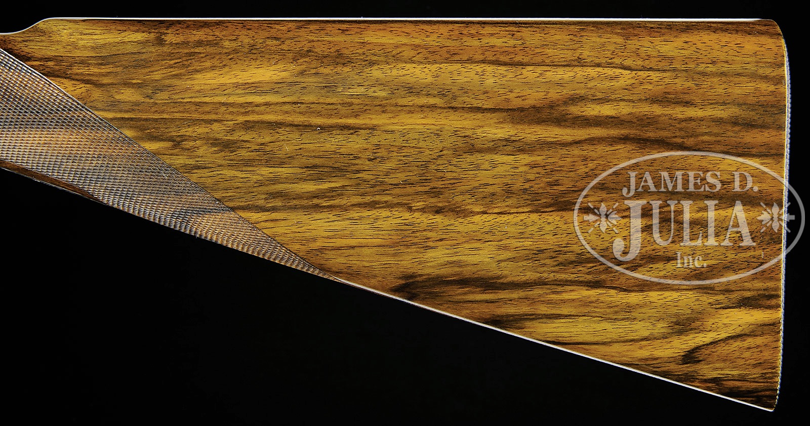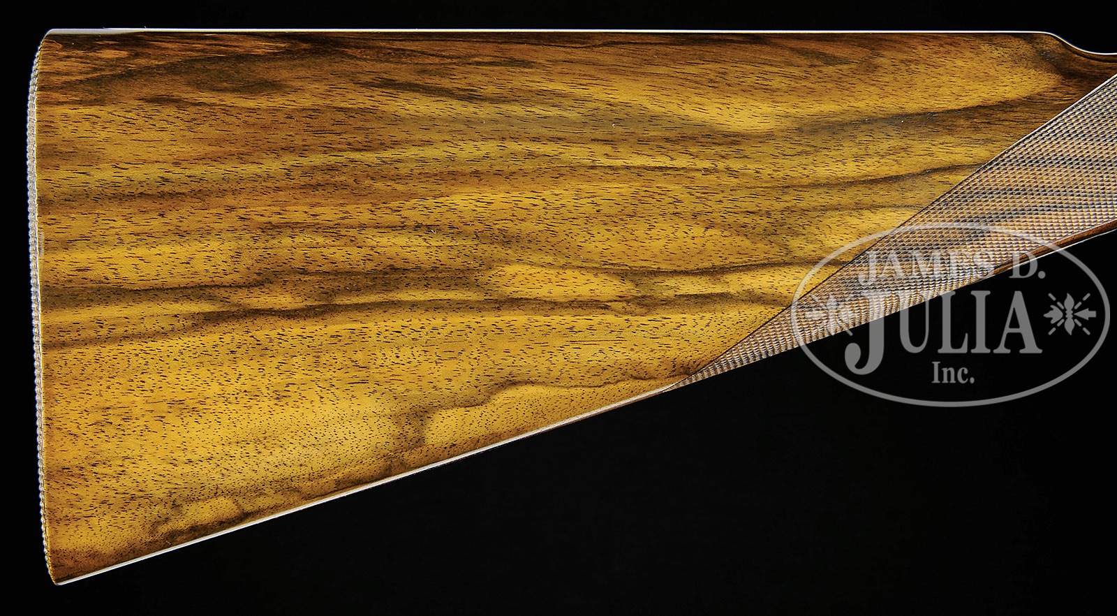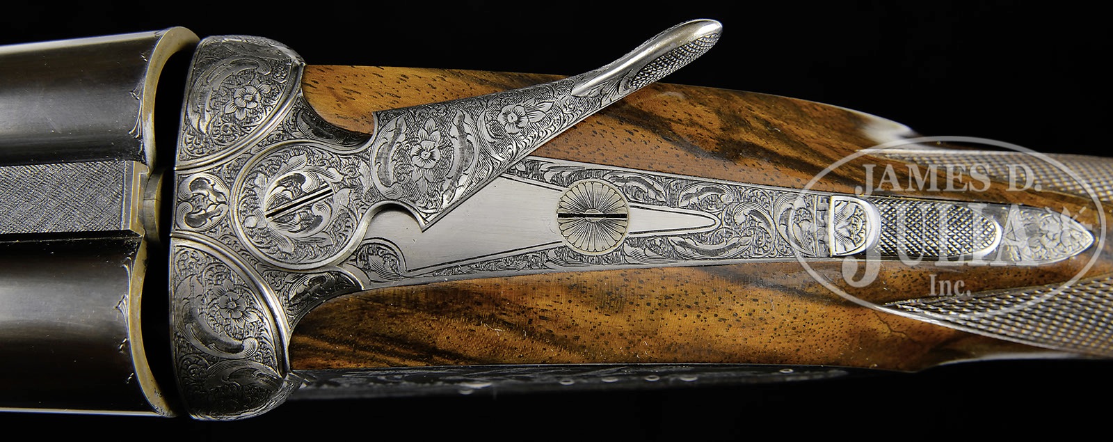 *VERY FINE TOMASONI ENGRAVED IVO FABBRI SELF-OPENING SIDELOCK GAME GUN WITH CASE.SN E497. (1978) Cal. 20 ga. 2-3/4″ Chambers. Finely struck 27″ chopper lump bbls with semi-raised, flat, matted rib are engraved “BOEHLER SUPER BLITZ STEEL” on side of right bbl, and “IVO FABBRI BRESCIA ITALY” on side of left bbl. Bbl flats are stamped with 1978 Italian nitro proofs for 2-3/4″ chambers. Bbls are fitted with Holland & Holland type self-opening assist spring. Coin finished sidelock action features non-automatic safety (SAFE engraved), line engraved tumbler end cocking indicators, and single non-selective trigger. Action is engraved with well done, shaded small scroll as background for larger scrolled acanthus and floral highlights, framing oval vignette of three snipe diving over marsh on bottom. “IVO FABBRI” is on bottom of each side under lockplates. Lockplates are fully engraved to the edge in a style originated by Harry Kell, with Bulino game scenes in finely detailed backgrounds; a flock of mallards wing across open marsh with low woods and buildings in background on left lockplate; and on the right, a flock of Hungarian partridge attempt escape over open cropland with two hapless individuals falling from sky, with feathers flying, obviously hit. This fine work is by noted engraver Claudio Tomasoni, whose signature appears at the bottom of each lockplate scene and on trigger plate. Single beaded trigger guard is engraved in style matching action, with SN at grip. Finely marbled European walnut straight grip buttstock measures 13-3/4″ over fully checkered wood butt. Well cut, borderless, point pattern checkering is at grip and on matching small beavertail ejector forend with Anson release. Bore diameter: left-.621, right -.621. Bore restrictions: left -.025 (IM), right -.025 (IM). Minimum wall thickness: left -.042, right -.042. Drop at heel: 1-5/8″, drop at comb: 1-7/16″. Weight: 6 lbs. 12 oz. LOP: 13-3/4″. High quality black leather case with stitched leather corners is lined in scarlet velvet. Case contains straps for exterior, and engravers certificate. CONDITION: Excellent, near new, possibly unfired since proof, with only a hint of case wear, and a few light marks on wood and metal. Bright polish on lumps, bbl flats, and ends of bbls, toning. Case leather is excellent, as is interior. 4-50398 MGM177 (45,000-65,000) – Lot 3364
