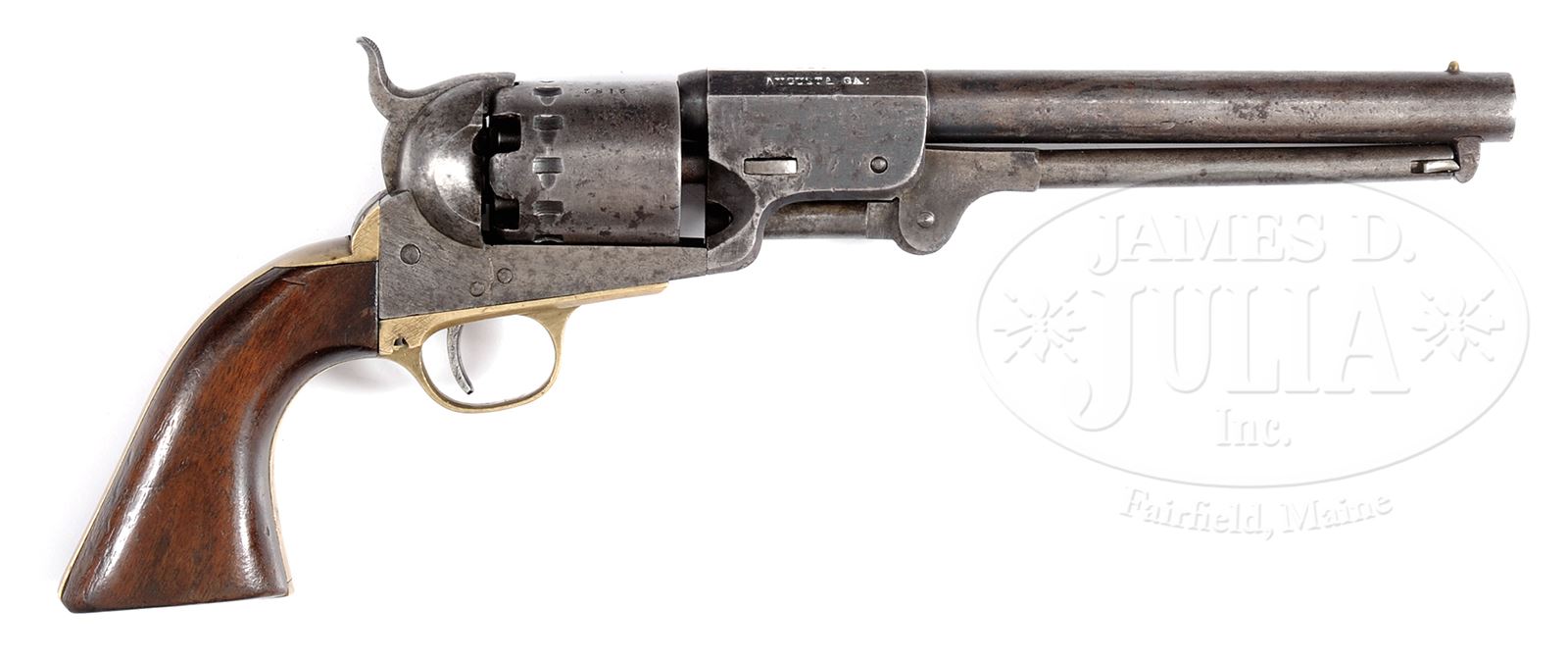 EXTREMELY RARE AND EXTREMELY FINE “C H RIGDON, AUGUSTA, GA CSA” MARKED CONFEDERATE REVOLVER.SN 2182. There are only 3 Rigdon & Ansley revolvers with these complete specific markings; the other two being SN 2154 and SN 2180. SN 2182 is no doubt the finest of the 3 retaining much orig finish and excellent markings. Full SN is found on bbl, frame, trigger guard, backstrap, cylinder, loading arm, wedge and cylinder pin. The left oct flat of bbl housing is marked “C H RIGDON”, top flat “CSA” and right flat “AUGUSTA, GA”. This is the most desirable marking one can find on any late-war iron frame Rigdon & Ansley revolver and is equally rare as the earliest iron frame products marked “NOVELTY WORKS” such as we are offering in an earlier lot in this sale showing the progression of Leech & Rigdon revolvers. The standard production of Rigdon & Ansley revolvers featured the standard 12-stop cylinder with no safety pins and Colt-type loading arm. Rigdon utilized the best Colt and Manhattan patents for his revolvers and was not worried about Northern litigation. PROVENANCE: Will Hoffeld Collection pictured in Confederate Revolvers by William Gary, pages 26, 27 & 168; RIA Lot 3088, May 21, 2008; Collection of Jim Maconkey. CONDITION: Extremely fine overall. All orig and matching with exception of loading lever catch which appears contemporary though unserialized. Bbl retains about 25% bright blue especially in protected areas with balance plum/grey. Cylinder retains strong traces of bright blue finish, especially in protected areas with balance grey/plum. Frame shows muted case colors in protected areas with balance grey with areas of staining, old finishing marks with casting flaws. Stocks are well fit, retaining about 90% of orig varnish with edge wear. Mechanically gun is excellent with crisp fine bore. 49442-5 JS (40,000-60,000) – Lot 3364