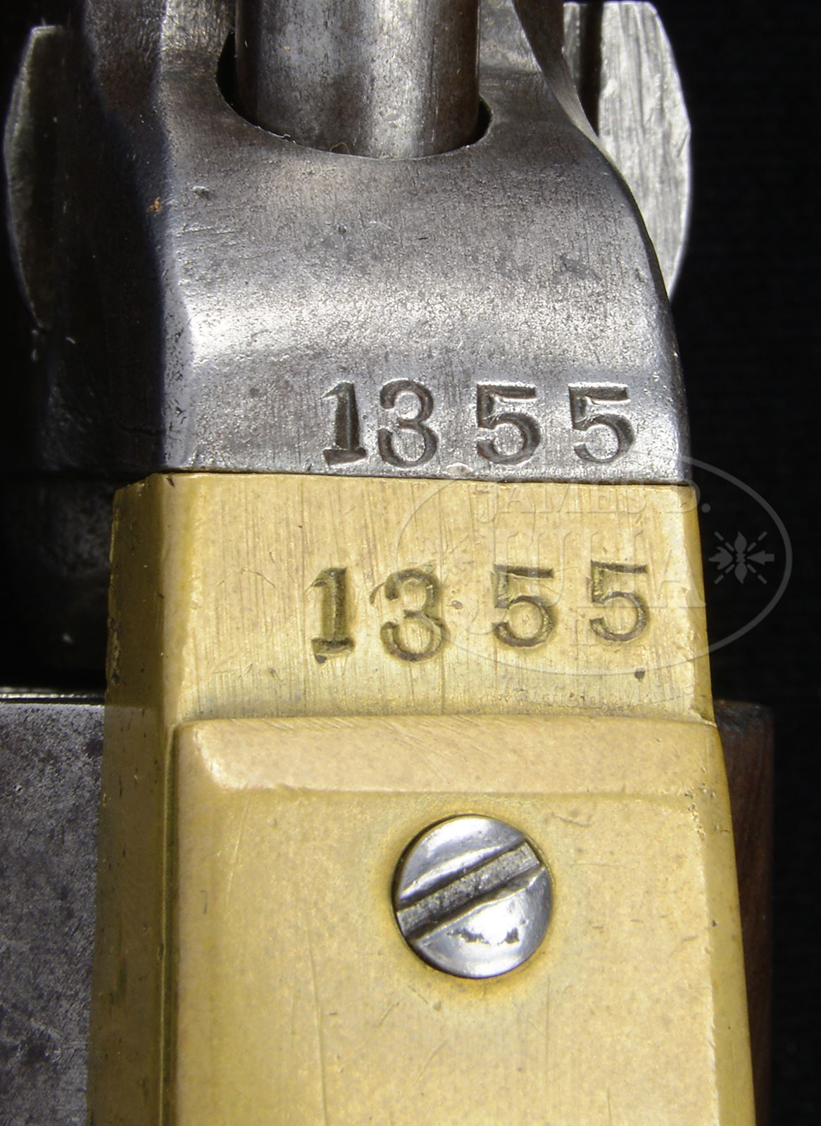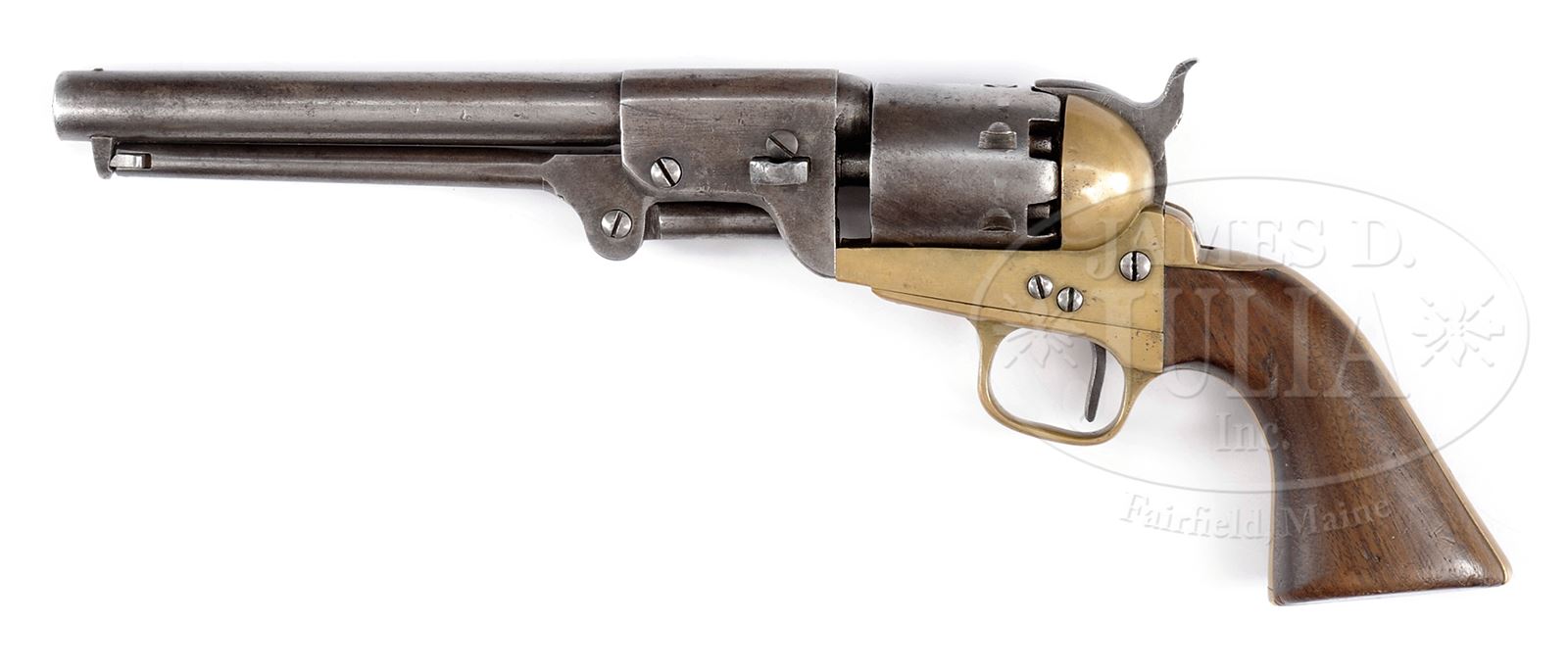 FINE, RARE IDENTIFIED FIRST MODEL GRISWOLD CONFEDERATE REVOLVER WITH ORIGINAL “ATLANTA ARSENAL” MARKED HOLSTER.SN 1355. This is about as fine a first model Griswold that you will find. It retains strong traces of bright blue finish in protected areas and is a crisp sharp gun in every detail. Serial number 1355 appears on the bottom of the bbl lug, frame and cylinder. Secondary number “5” is found on loading arm, wedge, trigger guard and bottom of right grip. Cylinder retains all 6 safety pins which is rare to see on these revolvers. Cryptic “A” is found on bottom of bbl, trigger guard, backstrap and frame. Roman numeral: “XII” is found on trigger guard and backstrap. Accompanied by a copy of a hand written letter dated 2-23-83 addressed to a Mr. Edwards (William B. Edwards, author of Civil War Guns, 1957) stating that the writer’s great-grandfather, John C. Cate of Niota, TN was the orig owner of this revolver. He enlisted at Knoxville, TN in the Confederate Army & was at the siege of Vicksburg & later Confederate Post Master at Knoxville. One of his descendants, Thomas Cate, died in the 1960’s at a very advanced age and the revolver & holster, along with some swords, came into the writer’s possession. Consignor states that the letter was written by Richard Cate, a long time friend and direct descendent of John C. Cate (John C. Cate is listed as enlisting March 28, 1862 in Company F 39th Tennessee Infantry). Writer of letter, which last page is missing and lost since originally sold on these floors in Fall of 2005, was asking Mr. Edwards to certify this was indeed a Confederate revolver. Also accompanying is a lengthy Master’s Thesis written by Deborah B. Lowry in 1999 regarding a very well known house in the East Tennessee area where this revolver & holster were discovered. This Thesis, in the introduction, relates a visit to the home of Mrs. Anna Cate in Madisonville, TN, known as the Stickley Mansion. The accompanying holster is quite rare being marked in a lozenge shaped cartouche “ATLANTA ARSENAL / GA / 186”. Atlanta marked accoutrements are quite rare and only a few other examples are known and other orig examples do not have the last digit in the date. PROVENANCE: Descendants of John C. Cate, 39th Tennessee Infantry; James D. Julia, Lot 3113, Fall 2005; Collection of Jim Maconkey. CONDITION: Gun appears orig and authentic throughout including every screw. This gun is very good overall for any Civil War revolver and for a Confederate brass frame revolver is excellent. Metal is smooth grey overall with staining and pitting, holster wear. Traces of bright blue finish are found on bottom of bbl and around bbl lug screws where protected. Distinctive Griswold “pointed screws” are found throughout with exception of wedge screw. Grips are sound, solid and well fit with a large burl flaw on right side (it is amazing that these grips remain so nice with this large flaw that could have easily caused breakage). Walnut for grips had to have been scarce for these to have passed inspection. Mechanics are good though mainspring is weak with crisp discernible rifling in bore. Holster still exhibits good brown color though there is considerable crazing to surface. Markings are mostly discernible, however, as can be seen in photos. Stitching has been resewn with thread and rawhide for apparent continued use at a later date. Belt loop enclosure strap are both missing but holster has been slit in back as improvised belt loop. Several holes and other reductions in leather as noted. 49442-2 JS (20,000-25,000) – Lot 3365