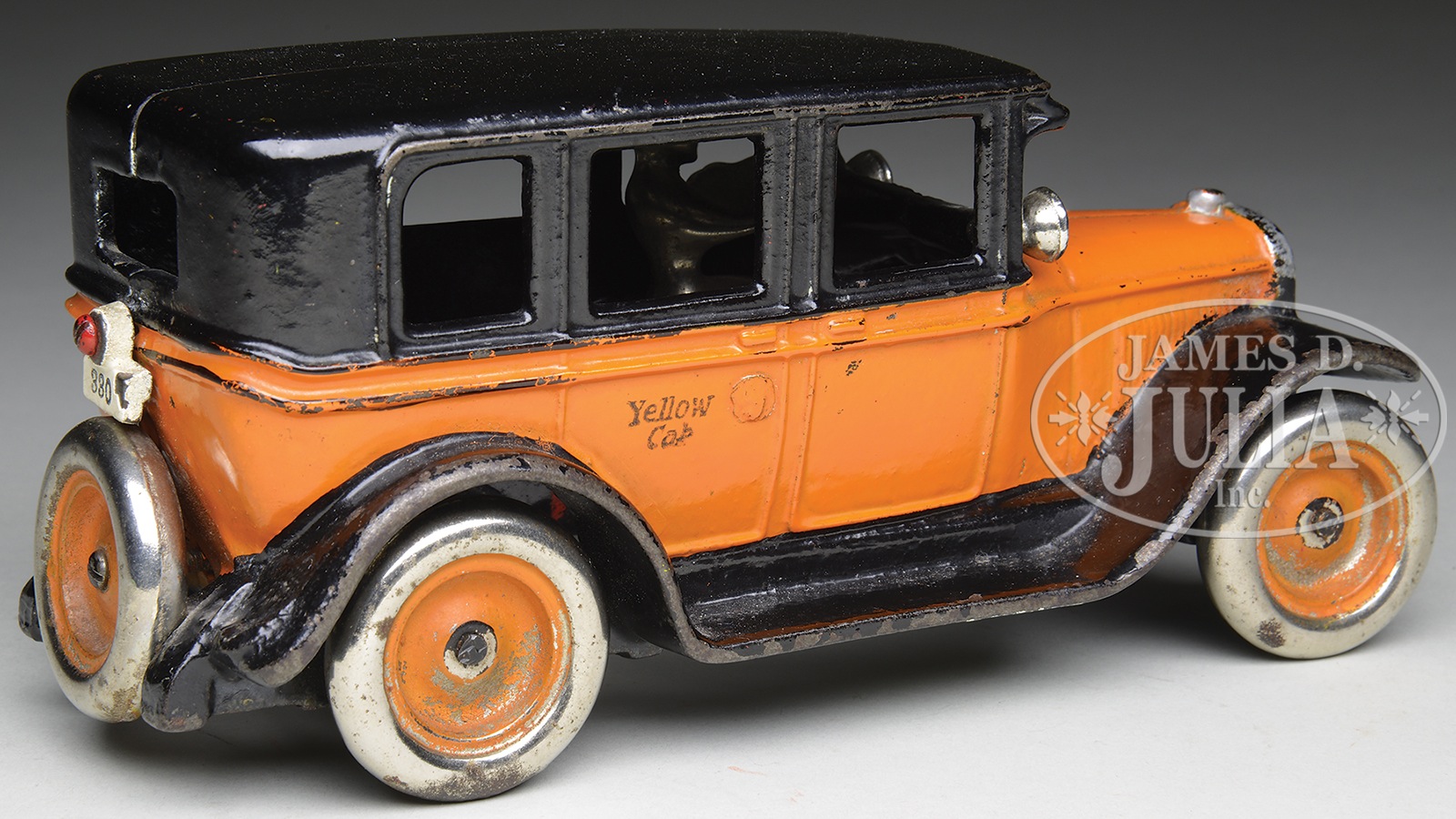ARCADE FLAT TOP YELLOW CAB.A classic automotive toy from the later part of the 1930s, depicting the Yellow cab that one often found roaming the streets of Chicago, New York City and other large metropolitan areas. This example is enameled in the trademark orange and black and rubber stamped “Yellow Cab” on passenger side compartment doors. Nickel plated iron wheels including the spare tire affixed to the rear with a white license plate #330 held in place with a red “tail light” screw. Car retains its original Arcade sticker on drivers side cowl, the 2 nickel plated cowl lights as well as the nickel plated driver. This toy is often susceptible to excessive wear on the black enameled roof, this one is virtually near mint showing no signs of wear or scratches. Oftentimes the front posts of the windshield have hairlines, these are intact and have no damage or hairlines. A great example of a in demand automotive toy from the classic 1930s era. SIZE: 8″ long. CONDITION: Overall very fine plus. Typical edge wear chipping to fender edges. Some thinness loss of paint above left rear fender. 1-14194 (4,000-6,000) – Lot 3366 Auction: Advertising, Toy & Doll - Spring 2014 Please Note: All prices include the hammer price plus the buyer’s premium, which is paid by the buyer as part of the purchase price. The prices noted here after the auction are considered unofficial and do not become official until after the 46th day. |