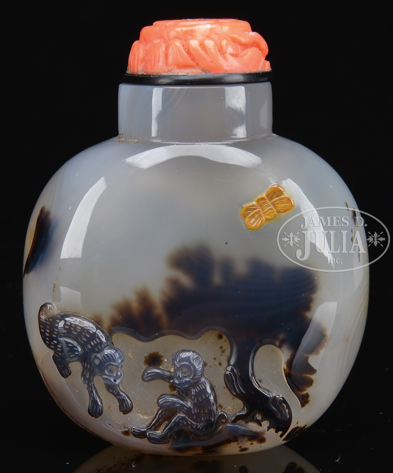 CLEVERLY CARVED AGATE SNUFF BOTTLE.19th century, China. The agate snuff bottle cleverly carved with monkeys and trees, against cloudy ground, complete with coral stopper. SIZE: 2-1/2″ (6.3cm) h. CONDITION: Good. 9-97154 (600-800) – Lot 3366