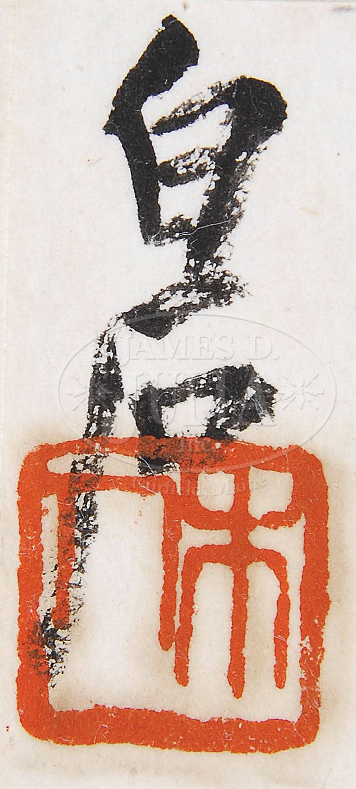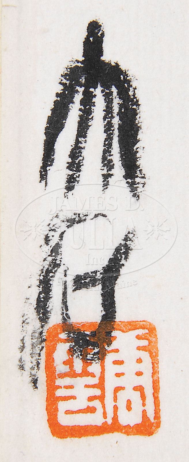 THREE PAINTED LEAVES. China, attributed to Qi Baishi (1864-1957), ink on paper, cameo painting depicting a butterfly, chicken group, and carp, respectively, signed, with seal. SIZE: 1) 4-3/8″ x 2-1/2″. 2) 5-1/2″ x 3-3/4″. 3) 7-3/8″ x 1-5/8″. CONDITION: Good. 7-73505 (500-700)