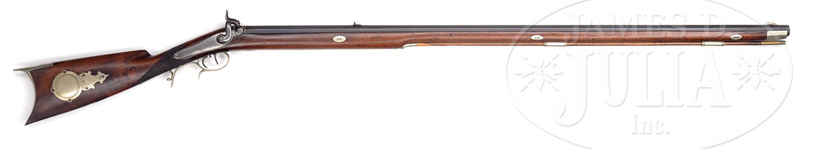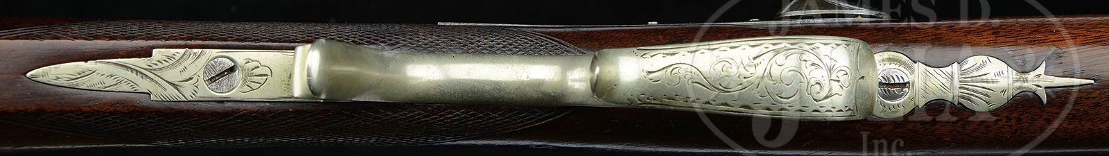 NEW YORK (ATTRIB.) PERCUSSION RIFLE.Cal. 40. 42″ oct bbl, ca. 1840. This fine condition rifle is stocked in walnut with a back action lock and all German silver engraved mountings including the rnd patchbox/cap box. Bbl is darkly blued, and also is inlaid with “German silver” bands at the breech and has a long tang that is beautifully engraved. PROVENANCE: Collection of Dr. Douglas Sirkin. CONDITION: Very fine. Gun is in very close to workbench condition. Walnut stock has no signs of being used or abused and the bbl surface is perfectly smooth. Rifling is crisp and sharp. Finish on walnut stock shows evidence of being carefully polished. 4-49764 SDH22 (1,000-2,000) – Lot 3368 Click here to view provenance