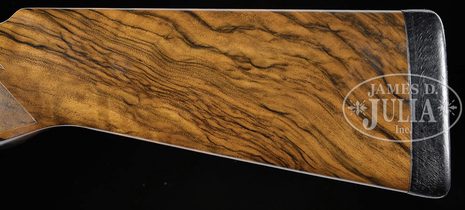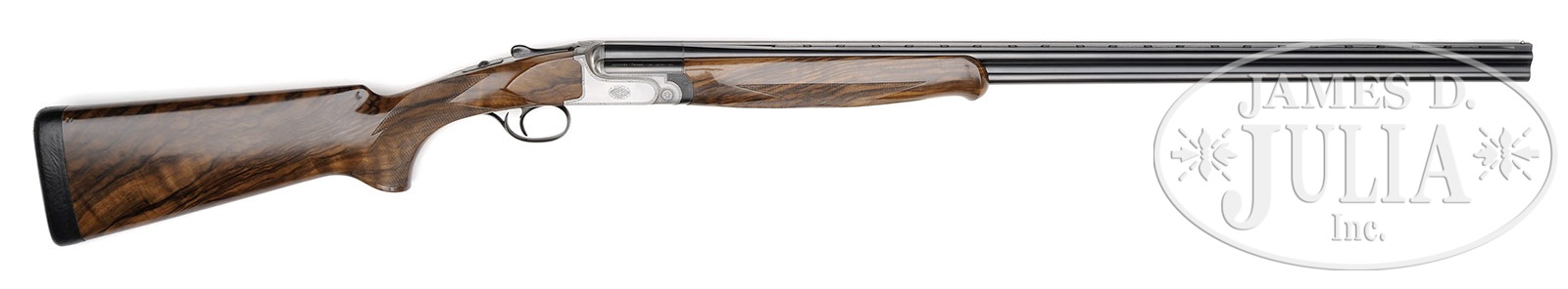 *.410 PERAZZI MX410 OVER-UNDER GAME GUN WITH CASE.SN 125827. Cal. .410. 3″ Chambers. 29-1/2″ Mono-bloc bbls fitted with raised, ventilated rib, are marked “Perazzi BRESCIA MADE IN ITALY” and “IMPORTER – Perazzi – USA AZ USA – CA.” on ejector bosses of mono-bloc. Bottom of mono-bloc is stamped with SN and 1902 Italian nitro proofs. Coin finished, low profile action is fitted with selective single trigger. Top lever and trigger group are blued. Action is engraved with nicely cut rose bouquets on sides and bottom and with geometric borders. Nicely veined and lightly figured European walnut full pistol grip buttstock measures 15-1/4″ over black leather covered pad. Borderless point pattern checkering is at grip. Matching schnabeled forend has Deeley type release. Bore diameter at muzzles: top: .375 (Full), bottom: .382 (Full). Drop at Heel: 2-3/16″. Drop at comb: 1-3/8″. Weight: 6 lbs. 4 oz. LOP: 15-1/4″”. Red ABS Perazzi marked case fitted with three combination locks, is lined in blue Perazzi patterned cloth, and contains gray bags for bbls and action, with directions, jacket patch, etc. and identification certificates in red pouch. CONDITION: Excellent, near new, with only a few of the lightest marks on wood and metal. Mechanically crisp. Top lever is considerably to right of center. 4-50159 MGM29 (10,000-15,000) – Lot 3369