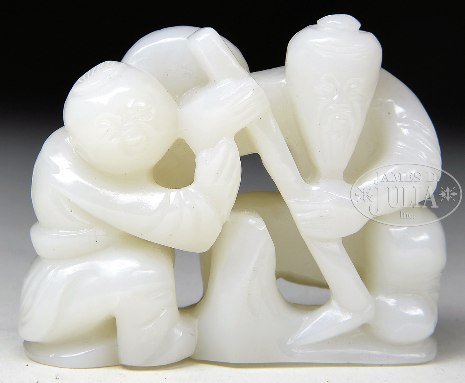 JADE CARVING OF A MAN & CHILD.19th/20th century, China. Figure of an old man and a child, the stone of a pure white color. SIZE: 2″ h x 2-1/2 w. CONDITION: Very good. 7-74639 (250-350) – Lot 3369