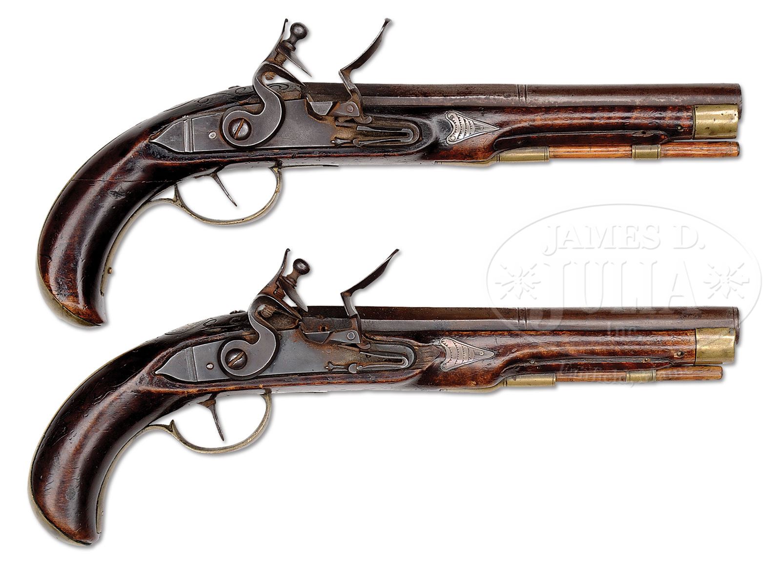 SN NSN. Each gun has a brass buttcap held at the bottom by a wood screw that runs 5-1/2″ up the rear of the pistol grip. There is incised carving on each side of each pistol’s engraved bbl tang and an oval silver engraved inlay on each pistol behind the bbl tang. The pistols have triangular shaped engraved silver inlays on each side of the stock above the brass ramrod entrance ferrules. The pistols have a nice panel running along each of their forends. The crude brass sideplates have an irregular shape which unfortunately is little help in identifying the maker or school of these pistols. As is normal, it is extremely difficult in most cases to pinpoint the area of manufacture or the gunsmith when working with pistols of the 18th century. Pistols of this period are attributed to makers based on characteristics found on identifiable rifles. The inlays on these pistols forward of the lock and sideplate panels and the irregular sideplates may ultimately be a clue as to their maker. Mr. Montague found one of these pistols and after he acquired it then later discovered the mate in Joe Kindig’s Collection and joined the two together. While this cataloger cannot guarantee the Neihardt attribution they are certainly a beautiful pair of rare 18th century silver inlaid Kentucky pistols. The Kindig gun is pictured on p. 55 (plate 167) of Sam E. Dyke’s Thoughts on the American Flintlock Pistol. PROVENANCE: Joe Kindig, Jr.; The Collection of John Montague. CONDITION: Very good. One pistol had been broken through the top of the pistol grip and repaired. This pistol also has a stress crack between the trigger guard and rear ramrod pipe. The second pistol has a very small piece of wood missing forward of the lock. A small part of the bow behind the trigger is broken off. 4-54350 (30,000-50,000) – Lot 3369