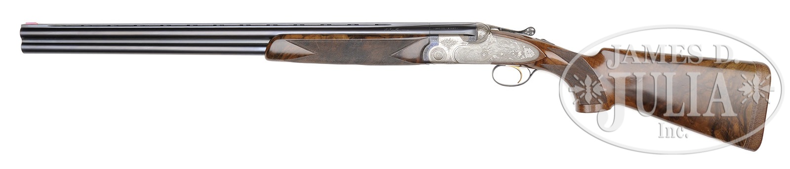 *MASTER ENGRAVED BERETTA SO3EELL WITH EXTRA BARRELS AND CASE.SN C10617B. Cal. 12 ga. 2-3/4″ Chambers. 26-3/4″ Bbls gold inlaid no. “1”, are engraved “SPECIAL SKEET” on mono-bloc, and 28″ bbls are gold inlaid no. “2”. Both sets of bbls have flat, ventilated ribs and are marked “P. Beretta – ITALY” on left side top bbls. Bottoms of mono-blocs are stamped with grades, SNs, and 1982 Italian nitro proofs. Coin finished, low profile, Beretta proprietary sidelock action is stamped with grade in bbl recess, and features non-automatic safety and gold-plated single trigger. Action is engraved with diamonds and triangles of very well cut small scroll, giving counterpoint to very fine Bulino renderings of game birds, with ducks flying over marsh on both lockplates, and a flushing grouse on bottom of action. Bottom of action is also engraved “BREVETTATO” “MADE IN ITALY” “P. BERETTA”. “P. BERETTA” also appears on bottom of each lockplate. Engravers signature “P Ferraglio” appears on trigger plate. Blued top lever has pierced, low thumbpiece, and is gold inlaid with a crown. Blued trigger guard has scroll engraving on bow, and SN at grip. Finely marbled and slightly stump figured European walnut full pistol grip buttstock measures 14-3/8″ over tan leather covered pad which has face inset with black rubber outline of the state of Texas. Point pattern checkering is at grip, and a silver oval at rear of toe line is engraved “L F M”. Small one piece forend has Deeley type release. Bbl set no. “1”: Bore diameter: top -.727, bottom -.728. Bore restrictions: top -.007 Flare (Skeet), bottom -.007 flare (Skeet). Drop at heel: 2-3/8″, drop at comb: 1-1/2″. Weight: 7 lbs. 8 oz. LOP: 14-3/8″. Bbl set no. “2”: Bore diameter: top -.727, bottom -.727. Bore restrictions: Screw chokes. Drop at heel: 2-5/16″, drop at comb: 1-7/16″. Weight: 7 lbs. 12 oz. LOP: 14-3/8″. Beretta patterned cloth leather trimmed case lined in gold-toned cloth with leather trim has space for action and both sets of bbls, and contains three Bob Allen choke tubes and wrench. CONDITION: Excellent. Bbls retain nearly all of their orig factory blue with a few light marks. Action and polished portions of breech ends of bbls have toned to a gray brown, with some small areas still bright, which though not intentional, is pleasing. Stocks have a considerable number of knocks, scrapes and scratches in their orig finish, some deep. Bores are excellent. Action is tight. Ejectors are strong and in time. Trigger works. Case exterior is excellent, with a few light rubs. Straps and handle are fine. Interior cloth has compressions and light soiling. 4-50411 MGM268 (12,500-17,500) – Lot 3370