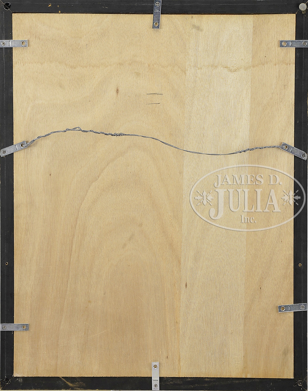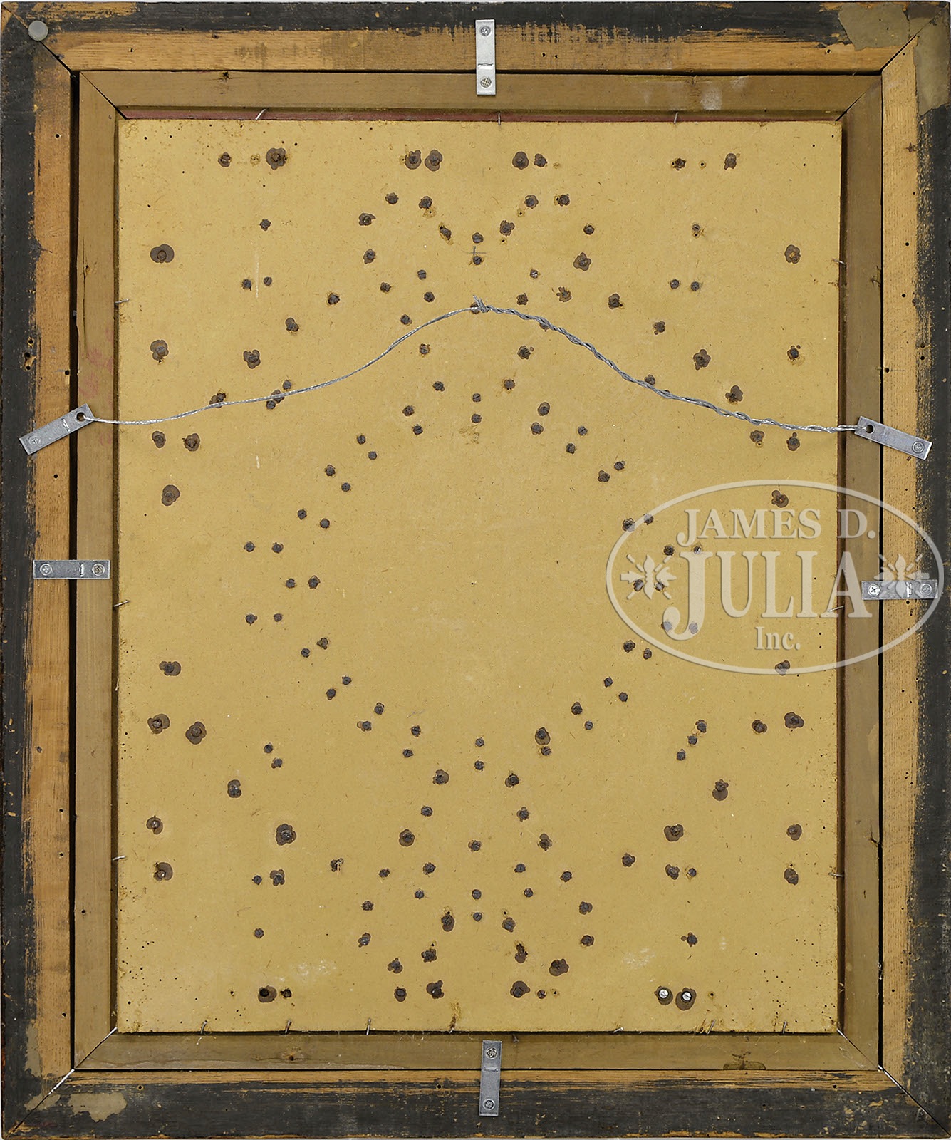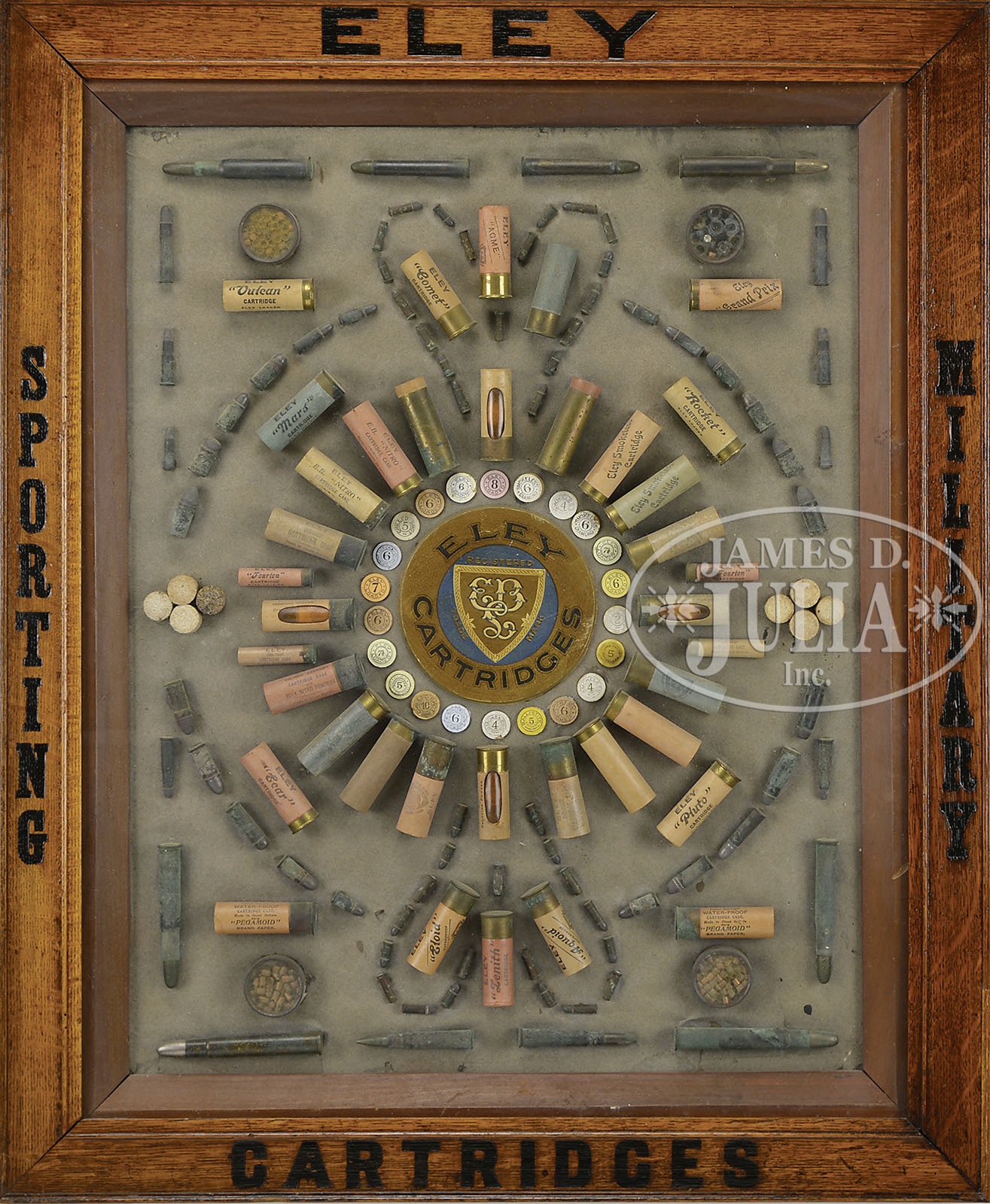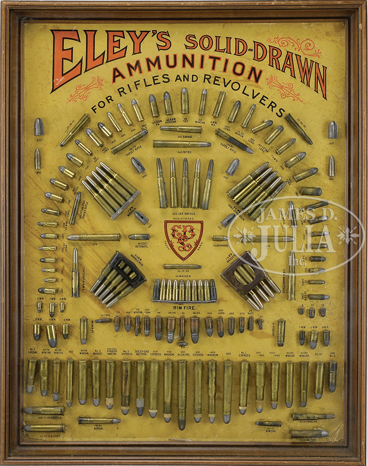 TWO ELEY CARTRIDGE BOARDS.SN NSN. No. 1: 21-3/4″ x 27-3/4″ Glass covered shadowbox of metallic cartridges and some bullets are mounted on card background printed “ELEY’S SOLID DRAWN AMMUNITION FOR RIFLES AND REVOLVERS.” Cartridges run the gamut from 5mm pinfire through .450 No. 2 Nitro, attractively arrayed having a number of military rifle cartridges in their stripper clips. .577 Lead bullets are sectioned to show copper caps. Board is housed in 2″ deep walnut frame. Backboard is protected by mahogany plywood. Condition: Good. Card is considerably foxed and wrinkled. All printing is clear. Most cartridges are tarnished. Frame is very good with a number of marks and dings. Glass is fine. No. 2: 25-3/8″ wide, 31-1/4″ high Shadowbox with a variety of metallic and shotgun cartridges, attractively arranged in circular motif on gray cardboard back. Central medallion with Eley logo is marked “ELEY CARTRIDGES” surrounded by a variety of overshot wads. Shadowbox has 1″ deep sides. Simply molded oak frame is embossed “ELEY” on top and “CARTRIDGES” on bottom, with “SPORTING” and “MILITARY” on sides. Condition: Backboard is wrinkled. Metallic cartridges are considerably discolored and tarnished to green. Shot shells are faded, some brass heads tarnished. Frame is very fine, with orig finish showing some light wear, and a 5″ repair to outer molding at bottom right. Glass is fine. Backing paper is missing. PROVENANCE: Robert H. Haskell, III Estate Collection. CONDITION: As above. 4-50219 MGM109 (2,000-3,000) – Lot 3372
