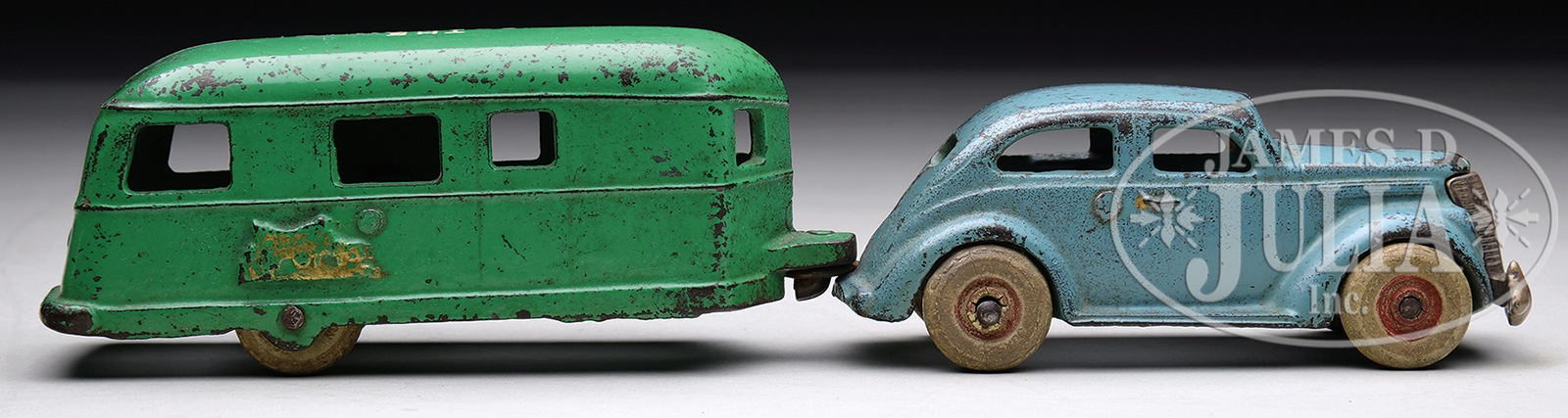 ARCADE NICKEL PLATED COUPE WITH COVERED WAGON TRAILER.A classic stream lined coupe with a nickel plated front bumper and grill and featuring rubber tires with red simulated hubs. The trailer is enameled in dark green and stenciled on the roof “The Covered Wagon”. When looking at this toy all one can think about is the “The Long, Long Trailer” movie with Lucy and Ricky and Ethel and Fred traveling up a mountain in the west pulling the trailer. The car itself retains remnants of the original Arcade decal. SIZE: 11-1/2″ long. CONDITION: Overall paint is good to very good with the car having slightly more paint loss then the trailer. Rubber tires are intact and solid but somewhat dirty and minimal loss where rivets project through center hubs. 1-14191 (800-1,200) – Lot 3372 Auction: Advertising, Toy & Doll - Spring 2014 Please Note: All prices include the hammer price plus the buyer’s premium, which is paid by the buyer as part of the purchase price. The prices noted here after the auction are considered unofficial and do not become official until after the 46th day. |