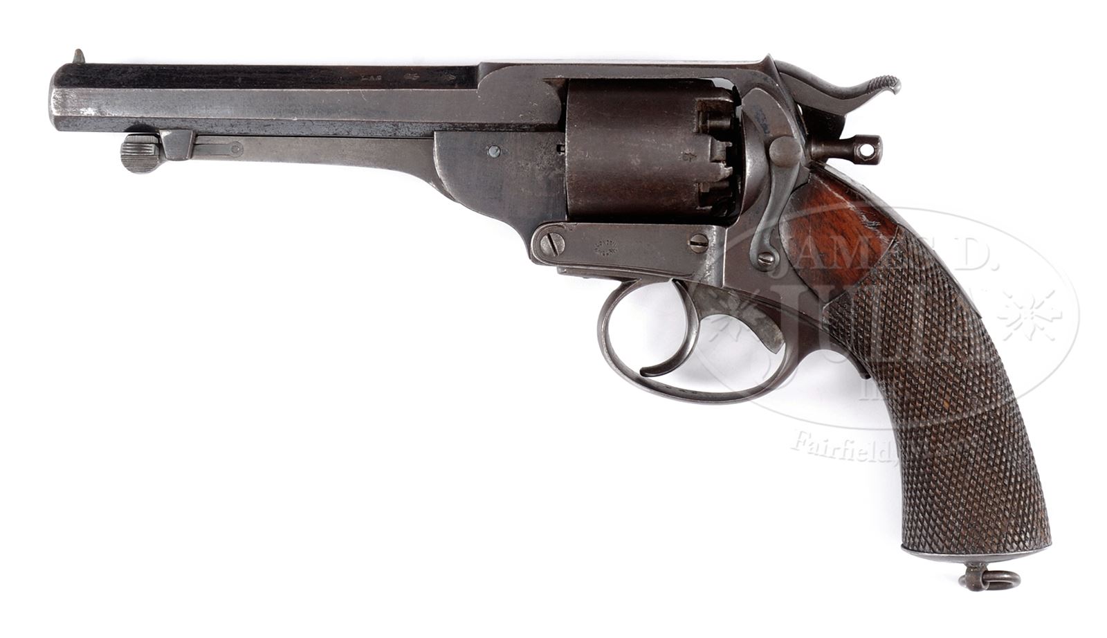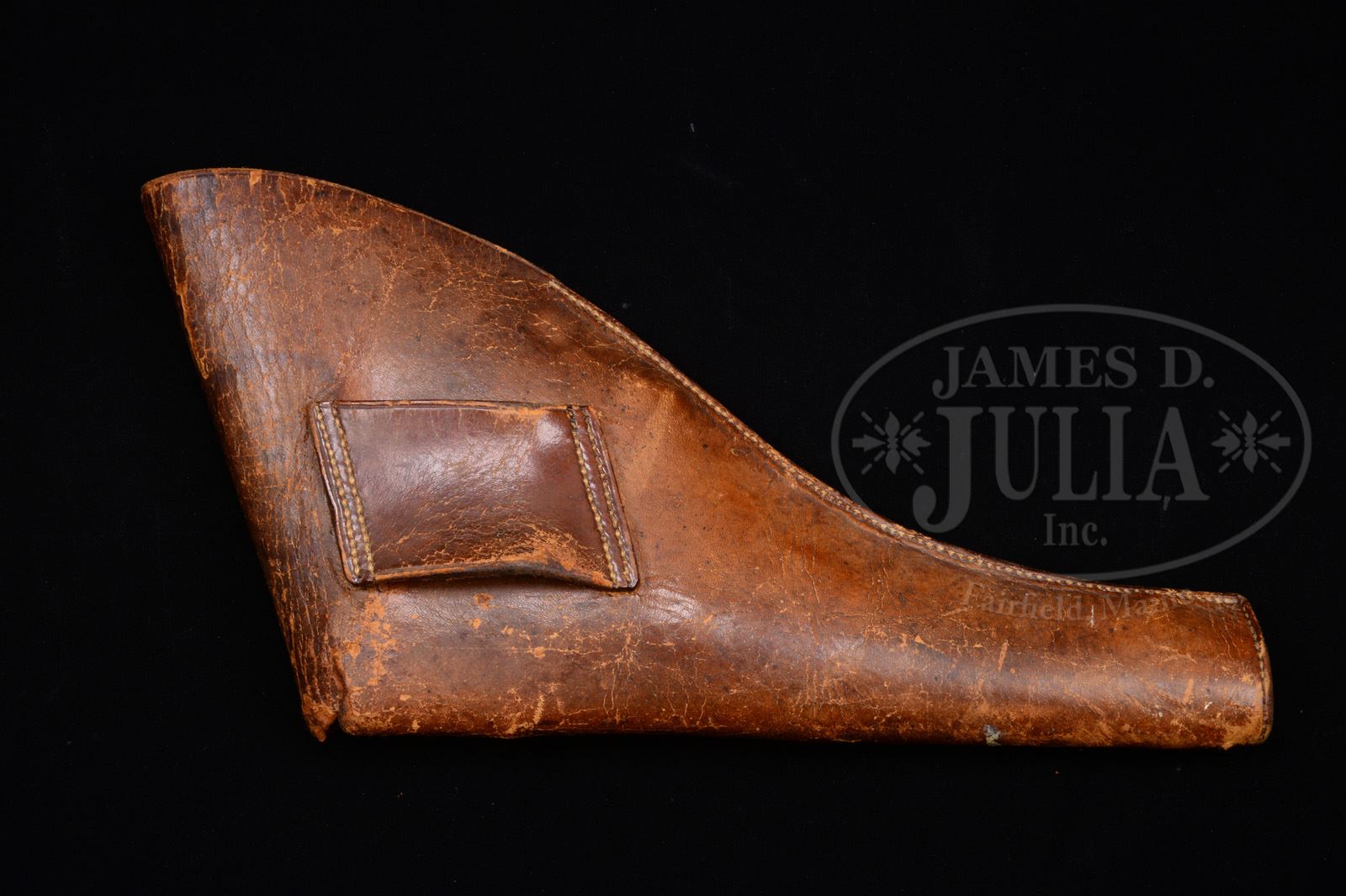 SN 4239. 45 Cal. Kerr Army revolvers were the most common imported revolver used by Confederate cavalry and officers during the Civil War. These guns typically saw hard service and rarely are found in such exceptional condition retaining most of their orig condition much less their orig belt and holster with ink ID “LT. COL. LILES 31ST NC”. There is another inscription ending with “CSA” that is not easily discerned. Liles is listed in the North Carolina rosters orig as Captain captured at Roanoke Island of February 8, 1862. He later became Lt. Col. September 17, 1862 and resigned in April 1863. The monumental text on British imports into the Confederacy just recently published by Russ Pritchard and C A Huey The English Connection; only 3 identified Kerr revolvers are mentioned (pg 233), one being owned by Jefferson Davis and SN 4239 being owned by Lt. Col. E R Liles 31st Regiment North Carolina Troops. This gun is in marvelous condition retaining much of its orig finish. The English Kerr holster is one of few known and the imported Kerr belt is unique at least to an identified example. Identical holsters are also shown in text. PROVENANCE: Steve Hockett Collection; A & S Auctions, Waco, Texas, Nov 10, 2001; Tommy Knox Collection; Collection of Jim Maconkey. CONDITION: Single action revolver is fine to very fine retaining about 60% bright blue to bbl and housing with remainder mostly plum with some small dings, dents and scratches. Frame and trigger guard retain traces of blue in protected areas with balance mostly plum. Cylinder has thin traces of blue with balance plum, with staining and pitting. Gun is complete and matching. Stocks retain much of their orig varnish with some red wax staining in diamond point cross-hatching below lock. The same red wax stains are found inside holster. There are a couple of chips in diamond points. Mechanically gun functions well with bright crisp bore. Holster is sound and solid missing in the tab, finial button is loose. Ink conscription is discernible as can be seen in photos and described above. Holster has cracking, crazing and water damage which has turned black at toe. Accompanying orig import belt has glued repair, missing portion of tongue. 49442-9 JS (8,000-12,000) – Lot 3372