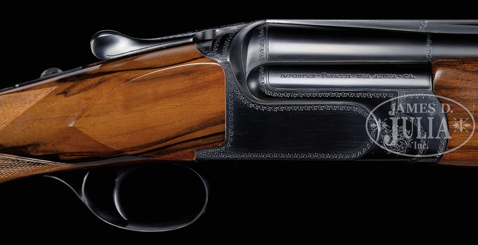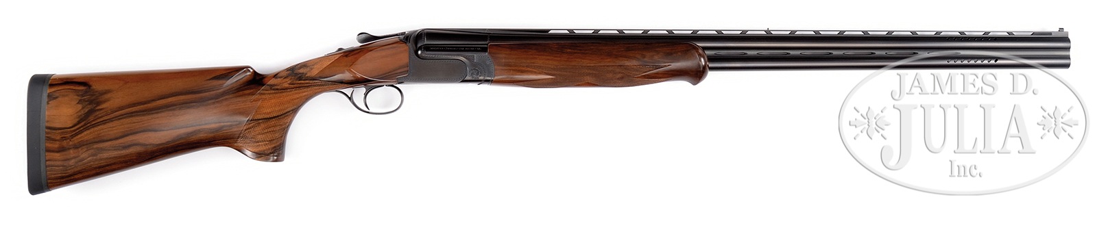 SN 130185. Cal. 12 ga/ 20 ga. 28-1/2″ Mono-bloc bbls with narrow matted ventilated ribs and ventilated side rib, are both ported and fitted with Briley interchangeable choke tubes. Mono-blocs are marked with Perazzi name and “MADE IN ITALY” along with importer (Perazzi USA). Bottoms of mono-blocs are stamped with 2004 Italian nitro proofs for 3″ chambers. Blued boxlock action features single selective trigger. Action has scroll border engraving and left side is marked “Perazzi MX 12″. Nicely marbled European walnut extreme pistol grip buttstock measures 14-1/2″ over black KICKEEZ pad, and point pattern checkering is at grip. Matching schnabeled one piece forend services both bbl sets. Each bbl set is supplied with 10 choke tubes. Drop at heel: 2-1/16″, drop at comb: 1-5/8″. Cast: approx 1/8″ off. Weight with 12 ga bbls: 7 lbs. 14 oz. LOP: 14-1/2”. Dark brown leather case with leather corners is lined in blue velvet with Beretta and logo embroidered in lid. Case has space for action and both sets of bbls, and contains choke tubes along with a pair of snap caps, square oil bottle, and socks for action and both bbls. CONDITION: Excellent, very close to new, with only a very few light handling and assembly marks on wood and metal, with very faint firing halos on breechface. Mechanically crisp. Case is excellent. Interior has some compressions. Perazzi shotguns are known for their reliability, this two bbl set would make a great clays gun, and would also be useful in the field. 51070-4 MGM283 (7,500-12,500) – Lot 3372