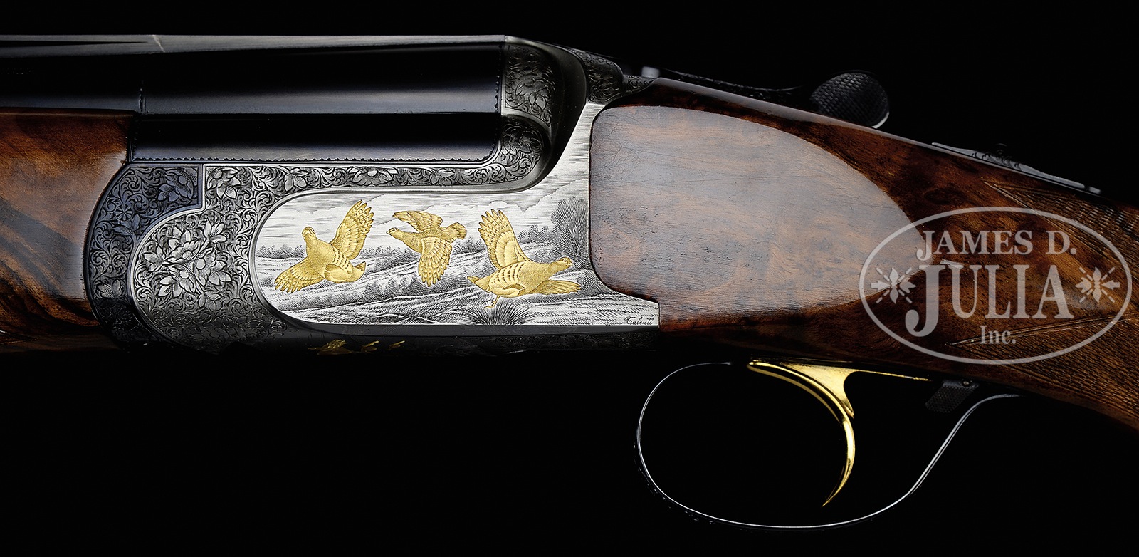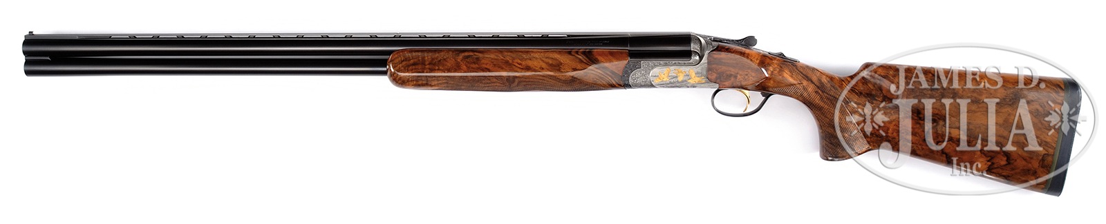 *FINE PERAZZI “MX 8 SCO ORO” OVER-UNDER CLAYS GUN WITH FINE ENGRAVING AND GOLD INLAID GAME SCENES BY TALENTI, WITH CASE.SN 84200. Cal. 12 ga. 2-3/4″ Chambers. 29-1/2″ Mono-bloc bbls with broad, matted, ventilated rib, (and no side ribs) are marked “Perazzi BRESCIA MADE IN ITALY” along with gauge and chamber on left side and with importer (Perazzi USA) on right. Bottom flat is stamped with 1992 Italian nitro proofs. Coin finished, low profile, OU action with selective single trigger in removable trigger/ firing group, is engraved with near full coverage floral accents in small open shaded scroll background. Bottom of action has grade gold inlaid in forend mortise, and scroll surrounds bulino scenes of chukar partridge, flush inlaid in gold; a pair take wing from hedgerow, the first to rise has obviously been hit by shot, as feathers are flying. Left side depicts a trio of chukar partridge flying over cropland; another group flying over hilly open terrain on right. Left side scene is signed “Talenti” (Ugo, presently working for Creative Art); the other two scenes are unsigned. Trigger plate and trigger guard with matching scroll, are blued, as is top lever. Exceptional, exhibition quality, burl figured and marbled European walnut extreme pistol grip buttstock measures 14-3/8″ over leather covered black pad. Point pattern checkering is at grip. Matching one piece semi-beavertail target forend has Deeley type release. Bore diameter: top -.724, bottom – .729. Bore restrictions: Screw chokes. Drop at heel: 2-1/8″, drop at comb: 1-3/8″. Cast: Neutral. Weight: 7 lbs. 14 oz. LOP: 14-3/8″. Red ABS Perazzi marked case is lined in blue Perazzi marked cloth, and contains stock dismounting tool. CONDITION: Excellent, very near to new, with only a few light handling and assembly marks in wood and metal, and faint firing halos on breechface. Mechanically crisp. Case is excellent. Be the envy of your squad, and perhaps everyone on the course, with this striking gun. 50819-13 MGM182 (18,000-28,000) – Lot 3373