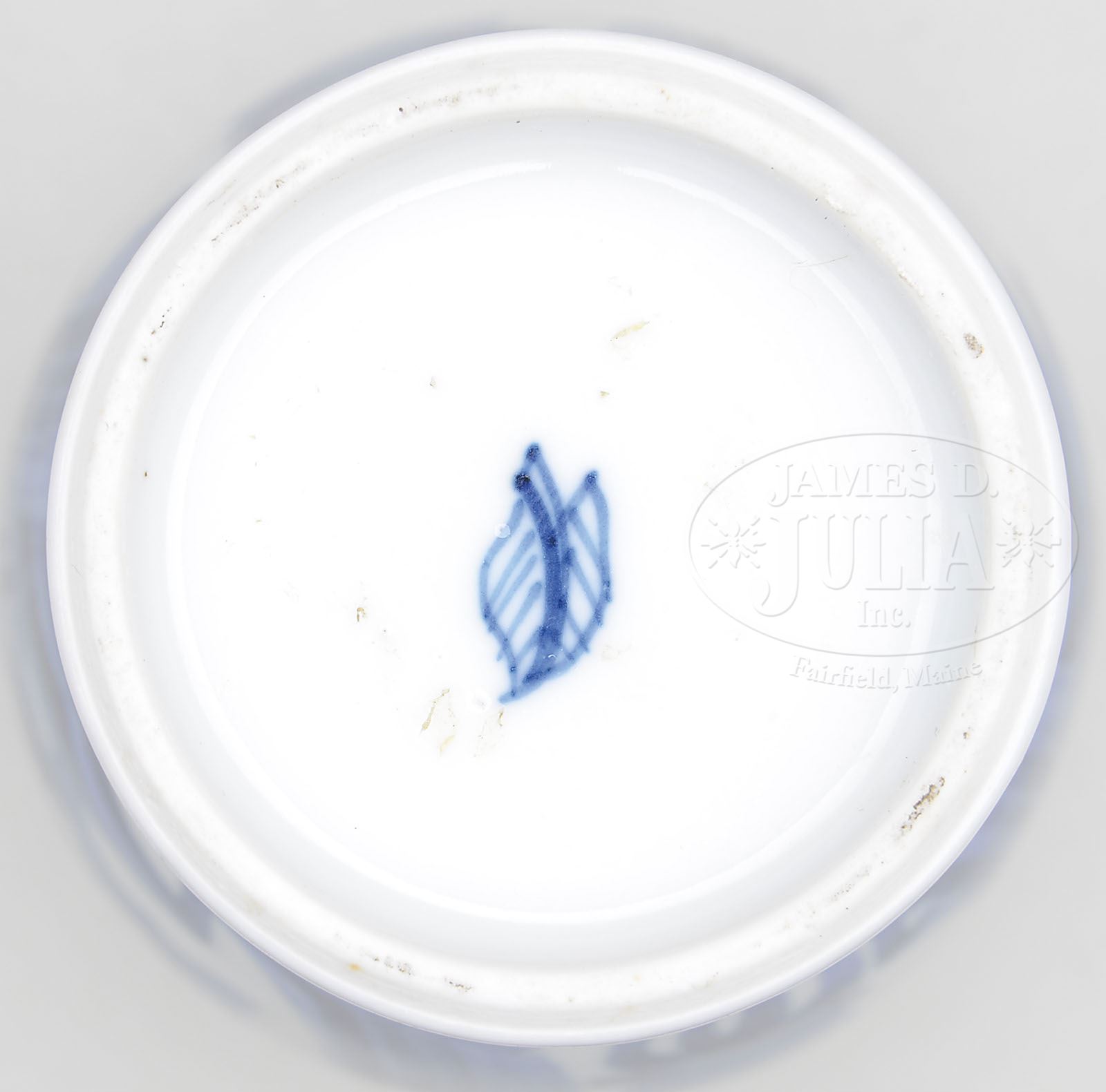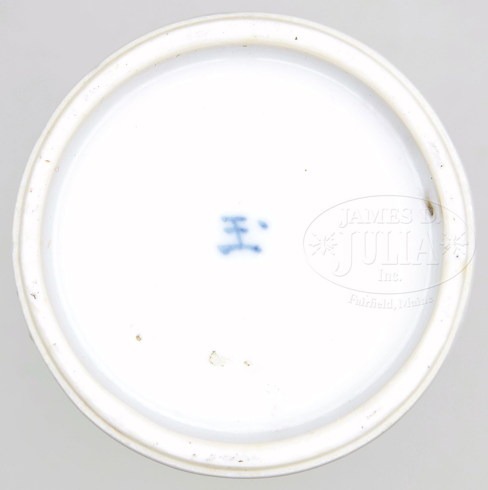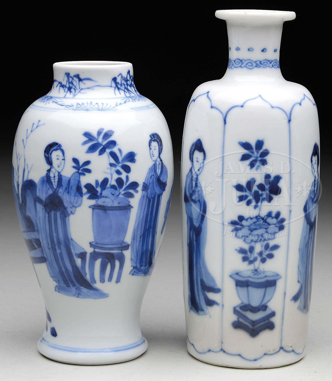 TWO BLUE AND WHITE PORCELAIN VASES. 19th century, China. In the K’ang Hsi style “Lange Elize” decoration of women. A vase and a jar missing its over. Marked with a leaf and the Chinese character “jade”. SIZE: 6″ t and 5-1/2″ t. CONDITION: The smaller with shallow chip in rim, otherwise very good. 7-74298 (200-300)