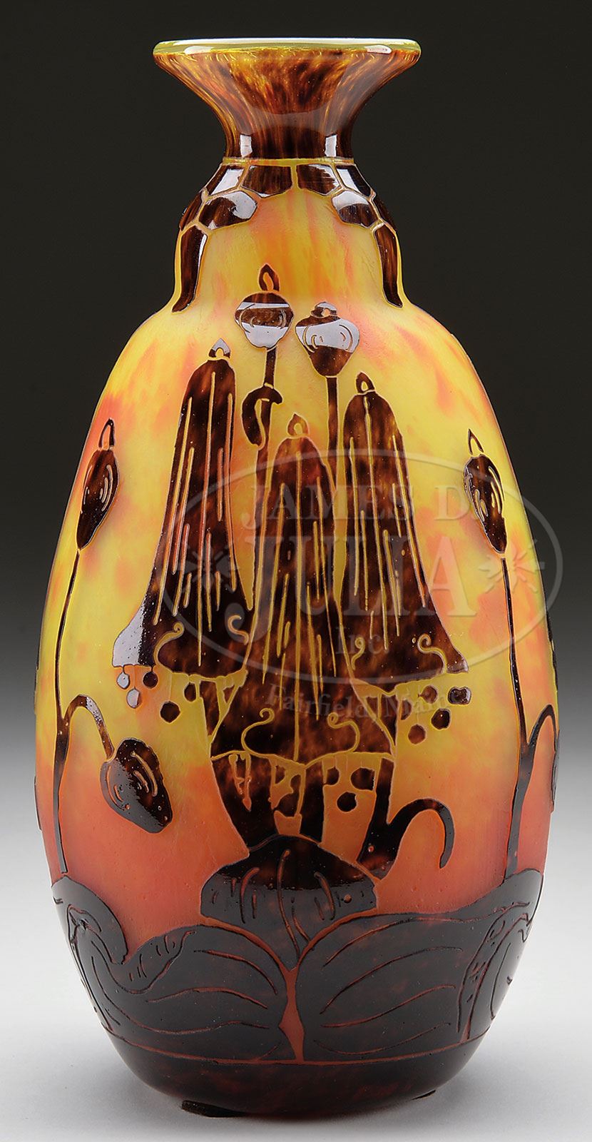 LEVERRE FRANCAIS CAMEO VASE.LeVerre Francais vase in the campanules pattern has mottled brown cameo decoration of stylized flowers and leaves surrounding the vase as well as a mottled brown cameo honeycomb decoration at the neck all set against a mottled orange and yellow background with acid textured surface. Signed on the side near the foot “LeVerre Francais”. SIZE: 12″ t. PROVENANCE: James Boma Collection. CONDITION: Very good to excellent. 5-69643 (1,200-1,500) – Lot 3376