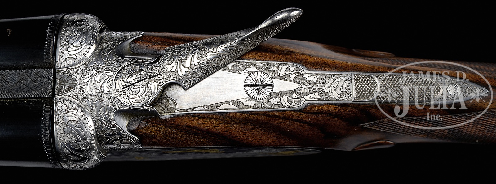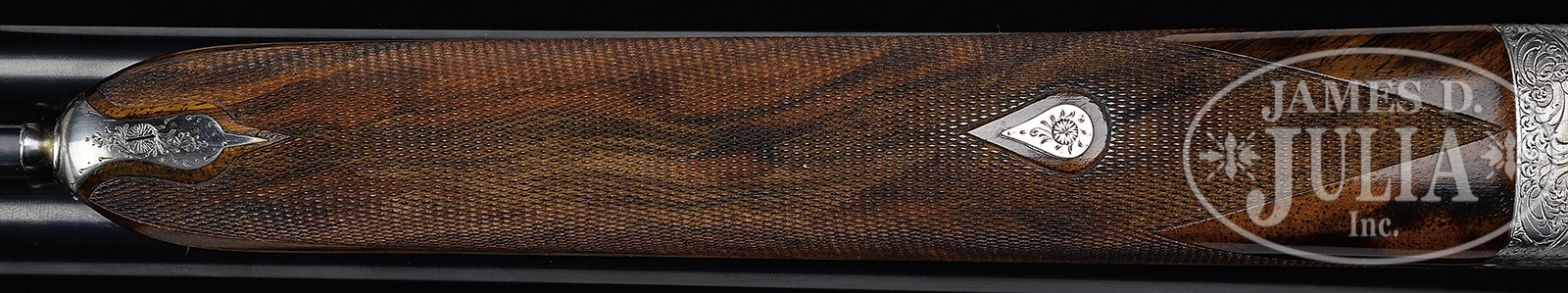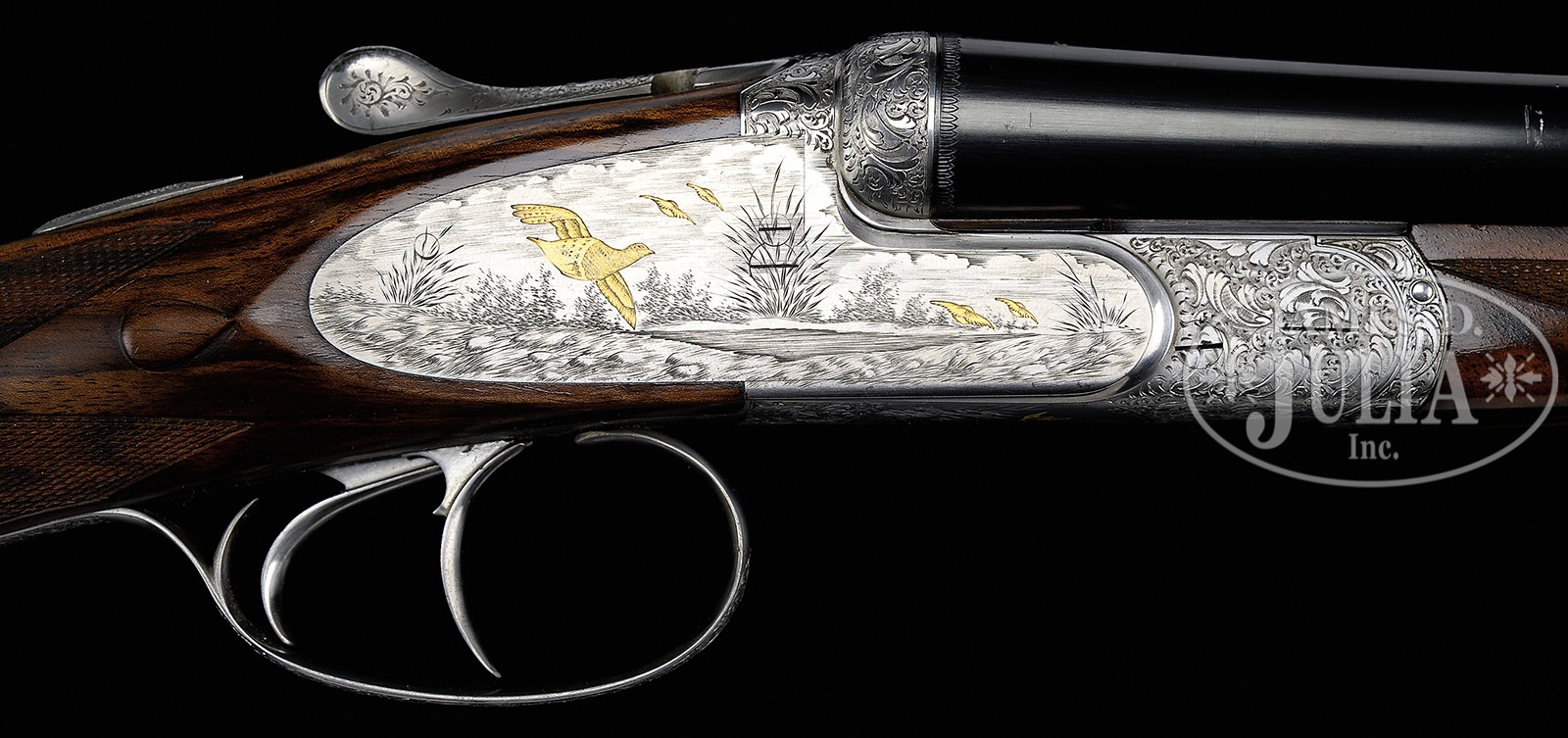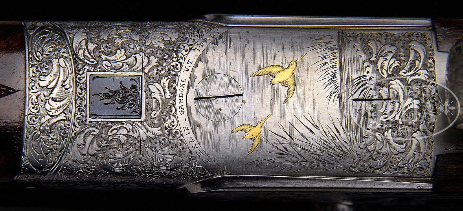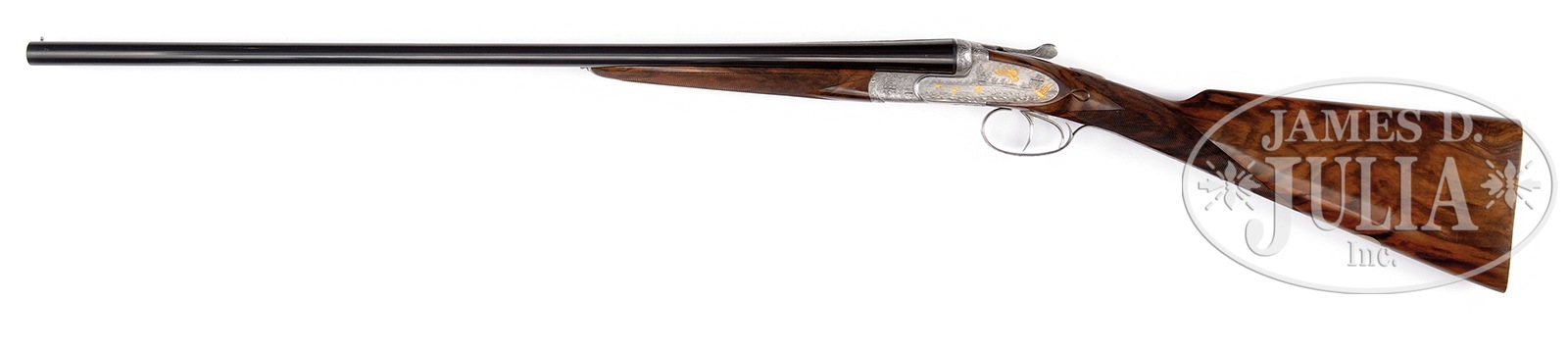 *20 GAUGE FERLIB “F – VII SIDEPLATE” SHOTGUN WITH GOLD GAME SCENES BY BREGOLI.SN 33655. Cal. 20 ga. 2-3/4″ Chambers. 27″ Dovetailed bbls with hand matted concave game rib are engraved “Libero Ferraglio Ferlib Italy” on top of left bbl. Bbl flats are stamped with 1986 Italian nitro proofs, and with bird logo. Coin finished, sideplated, boxlock action features non-automatic safety (S inlaid in gold) and dbl triggers (front “loose” to minimize discomfort to trigger finger when firing rear trigger). Action is engraved with sprays of acanthus in small scroll background surrounding Bulino game scenes with major subjects flush inlaid with gold; pair of snipe swoop into marsh on bottom of action under makers name and address on arch. Left plate and side of action depict a flock of mallards settling into marsh. Right plate and action feature five gold quail flying over cropland. Acanthus and scroll is on trigger guard bow and tang, with SN on banner. Engravers signature, “A. Bregoli” is on trigger plate. Well marbled and somewhat figured European walnut straight grip buttstock measures 14-5/8″ over checkered wood butt, and features drop points, as well as closely spaced, borderless, point pattern checkering on diamond hand. A vacant silver oval is on toe line. Matching long splinter ejector forend has Anson release. Bore diameter: left -.629, right – .629. Bore restrictions: left – .026 (full), right – .019 (mod). Drop at heel: 2-3/8″, drop at comb: 1-1/2″. Cast: Neutral. Weight: 5 lbs. 12 oz. LOP: 14-5/8″. PROVENANCE: Remarkable William Larkin Moore Private Estate Collection of Fine Sporting Arms. CONDITION: Excellent, with evidence of little field use, with a number of minor marks and light scratches on factory finishes, most notably a few fairly heavy and deep marks on side of right bbl, with an area touched up about 5″ back from muzzle. Bores are excellent. Action is tight. Mechanically excellent. 50594-40 MGM200 (12,500-20,000) – Lot 3378