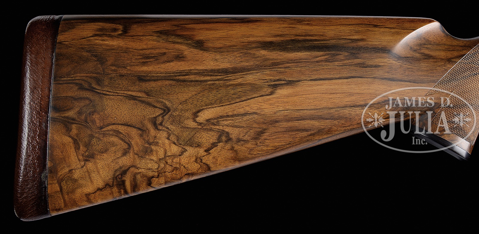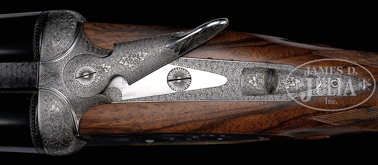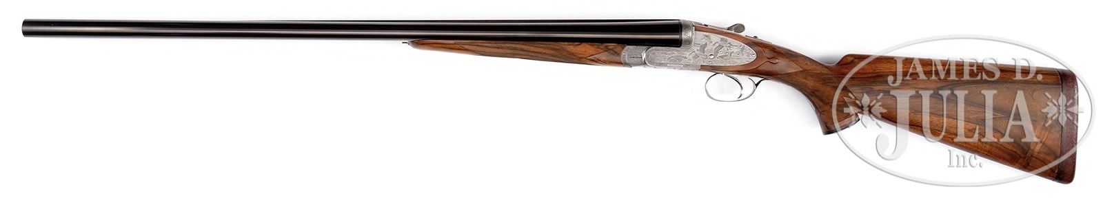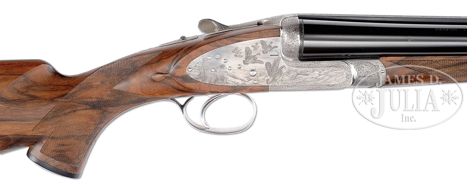 *VERY FINE LUIGI FRANCHI “IMPERIALE MONTE CARLO EXTRA” SIDELOCK GAME GUN WITH FINE GAME SCENE ENGRAVING BY F. GALEAZZI WITH CASE.SN 15159. (1997) Cal. 12 ga. 2-3/4″ Chambers. 28″ Chopper lump bbls with slightly raised, matted game rib, are engraved “FRANCHI S. P. A. BRESCIA MADE IN ITALY” on side of left bbl. Bbl flats are stamped with 1997 Italian nitro proofs for 2-3/4″ chambers, and side of right bbl is engraved with importers name and address (Beretta USA). Coin finished sidelock action features non-automatic safety (S inlaid in gold), bushed strikers, and single non-selective trigger. Action is engraved with full coverage well cut minuscule scroll, as background to sprays of roses and foliage, surrounding nicely rendered Bulino game scenes; hunter firing at flight of doves on bottom of action; flock of geese settling into marsh on left lockplate, and a covey of quail flushing as pair of pointers, one pointing, look on. Each scene is signed at bottom by the highly regarded “F. Galeazzi”. Single beaded small bow trigger guard with matching scroll has SN at grip. Nicely marbled and lightly figured, dense European walnut capped pistol grip buttstock measures 14-3/4″ over brown leather covered pad and features standard point pattern checkering. Matching splinter ejector forend has Anson release, and nicely inlet gold device engraved with grade (Imperiale Monte Carlo Extra) on central diamond. Bore diameter: left -.722, right – .723. Bore restrictions: screw chokes. Drop at heel: 2-1/4″, drop at comb: 1-1/2″. Cast off approx 1/4″. Weight: 7 lbs. 9 oz. LOP: 14-3/4″. Good quality dark leather case is lined in green felt, and has dark leather gold embossed Franchi label in lid. Case contains rosewood and brass 3-pc cleaning rod, a pair of rosewood and brass snap caps marked with grade, three Briley spare choke tubes (2 in gun), and an installation wrench. CONDITION: Excellent, with little evidence of use, with only some minor marks in what appear to be orig finishes. Bores are excellent. Action is tight. Ejectors are strong and in time. Trigger appears to work. Case leather is excellent, but shows minor scuffs. Interior cloth is excellent, lightly soiled. Label has some dings. This model is currently imported by Beretta, and is very expensive. 50401-7 MGM42 (20,000-30,000) – Lot 3380