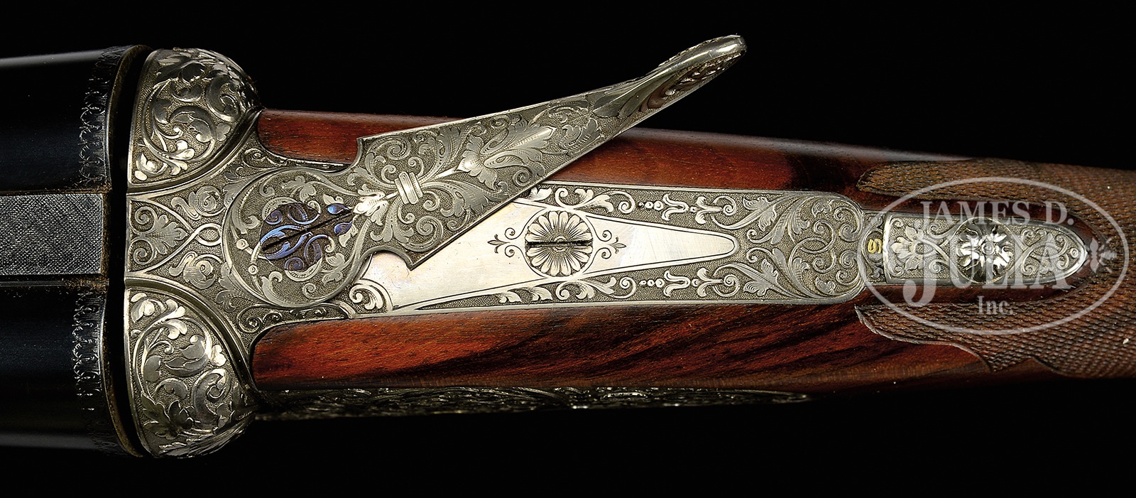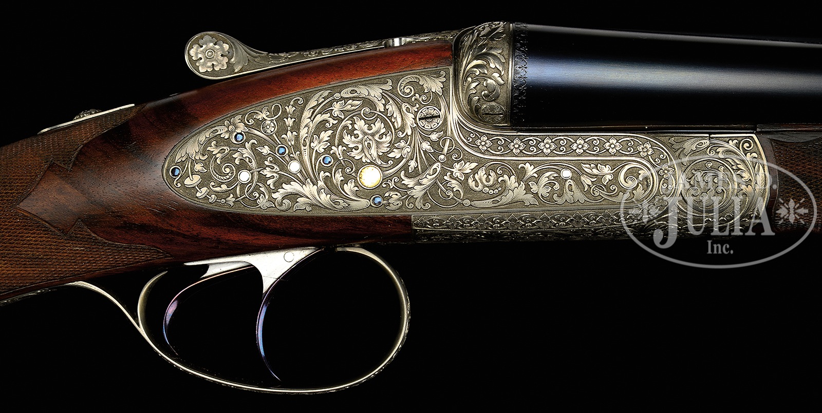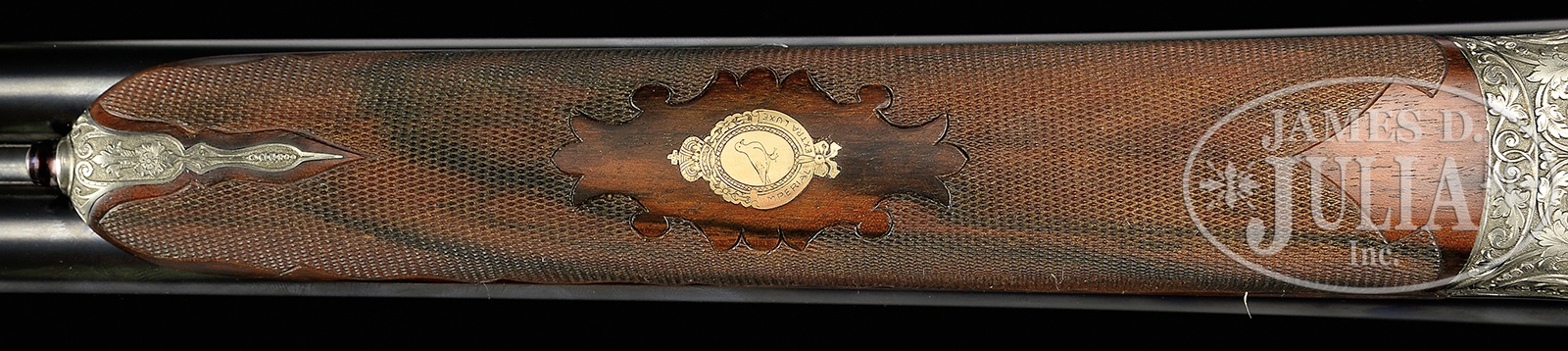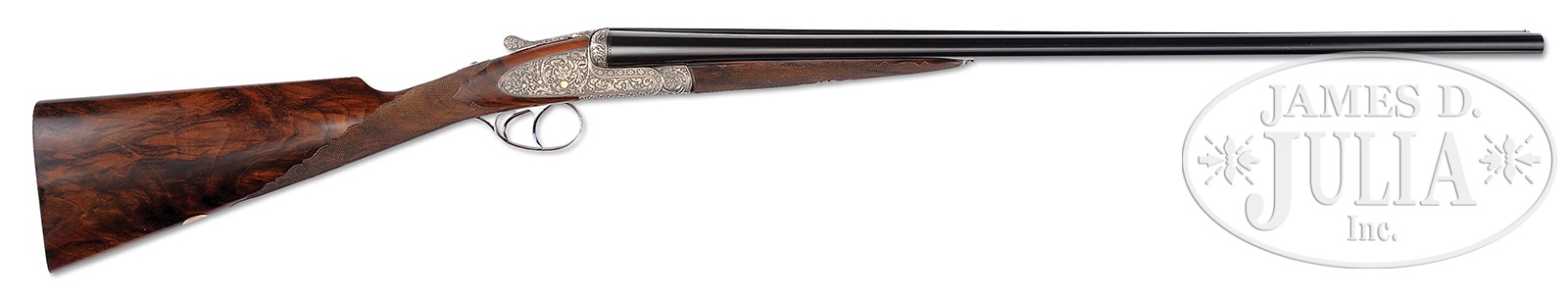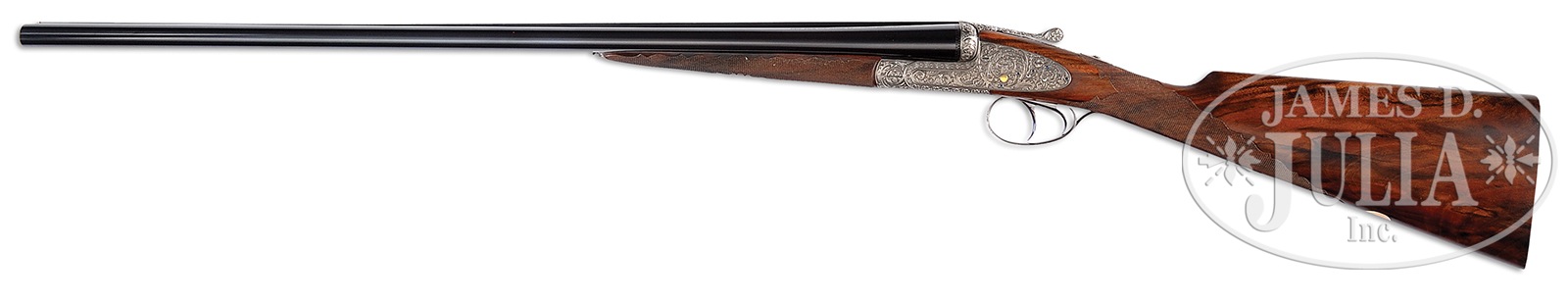 *EXCEPTIONALLY FINE LEBEAU-COURALLY 20 BORE “HOLLAND MODEL WASHINGTON” SIDELOCK EJECTOR GAME GUN WITH SUPERB HIGH RELIEF ACANTHUS SCROLL ENGRAVING BY LOVENBERG WITH CASE.SN 44660. (1983) Cal. 20 ga. 2-3/4″ Chambers. Although not a household name, Lebeau-Courally is recognized by fine gun aficionados to be among the highest order of gunmakers. This fine example of the gunmakers art has chopper lump 27″ bbls with concave matted rib. Top of right bbl is engraved “AUG. LEBEAU COURALLY”. Left side is engraved “FAIT POUR W. L. MOORE ET CO WESTLAKE, VLG CA”. Bbl flats are stamped with 1983 Belgian nitro proofs, and makers name and address. Small sized, coin finished, round bodied action features non-automatic safety (S inlaid in gold), gold plated tumbler ends and other internals, and dbl triggers (front articulated) with finger blades temper blued. Action and lockplates are engraved with full coverage truly exceptional relief carved large open scrolling acanthus with floral terminations and highlights within some interlocking scroll borders. Backgrounds are completely cut away and nicely stippled. Fences are full relief carved with matching scrolling acanthus. Makers name is not visible on action or lockplates, but is stamped on water table. Lebeau-Courally logo is on breechface. Engraving theme continues onto trigger guard. This wonderful engraving is by Lovenberg, with signature on trigger plate. Finely marbled, and nicely figured flesh-toned European walnut straight grip buttstock measures 14-1/2″ over checkered wood butt, and features fine borderless checkering on butt and grip, in classic outline within ogee scalloped borders. A vacant gold oval is on toe line. Matching splinter ejector forend has Anson release and inlet Lebeau-Courally crest in gold on uncheckered panel. Bore diameter: left -.623, right – .624. Bore restrictions: left – .012 (lt mod), right – .005 (IC). Drop at heel: 2-3/16″, drop at comb: 1-7/16″. Cast: approx 3/8″ off. Weight: 5 lbs. 15 oz. LOP: 14-1/2″. Light beige canvas case with stitched leather trim is lined in faun felt, and has black makers label in lid. Case contains proof certificate and test targets. PROVENANCE: Remarkable William Larkin Moore Private Estate Collection of Fine Sporting Arms. CONDITION: Excellent, very close to new, with very little evidence of having been fired since proof, with only the faintest of firing halos on breechface, and one or two of the faintest of handling and assembly marks on all factory finishes on wood and metal. Mechanically crisp. Case is excellent, with some scuffs. Interior cloth is excellent. Current retail for this model is well over 50,000 euros. A world class small bore shotgun. 50594-83 MGM85 (30,000-50,000) – Lot 3383