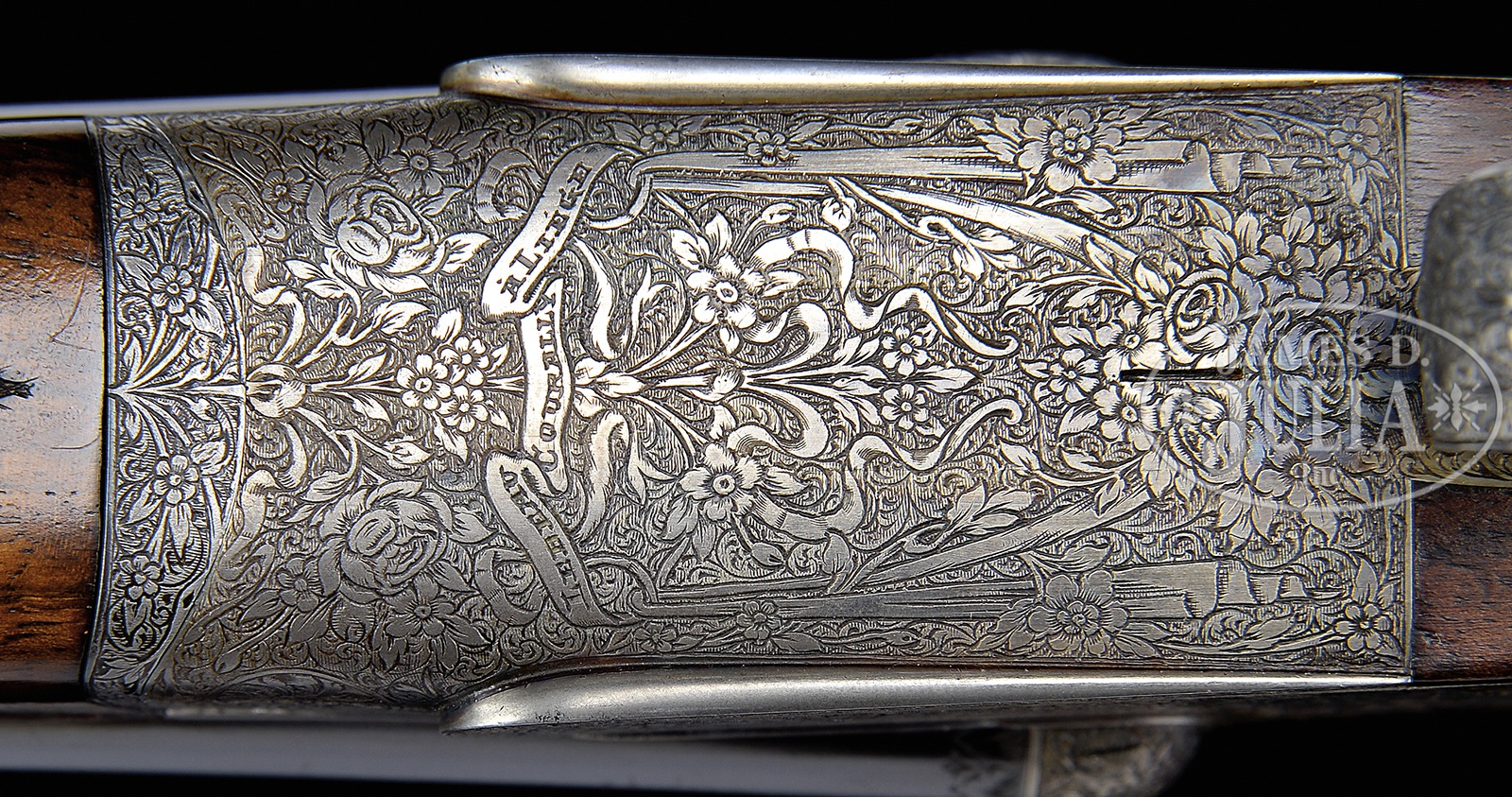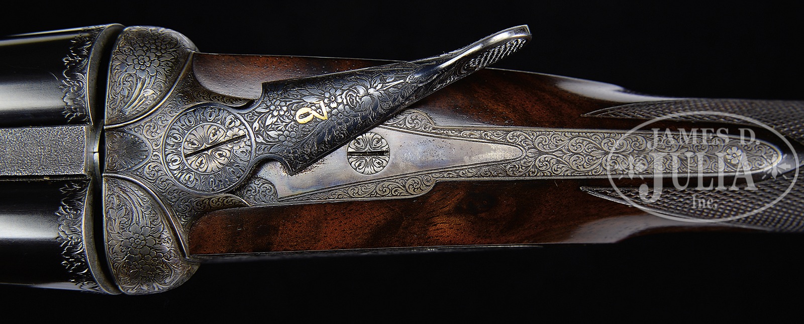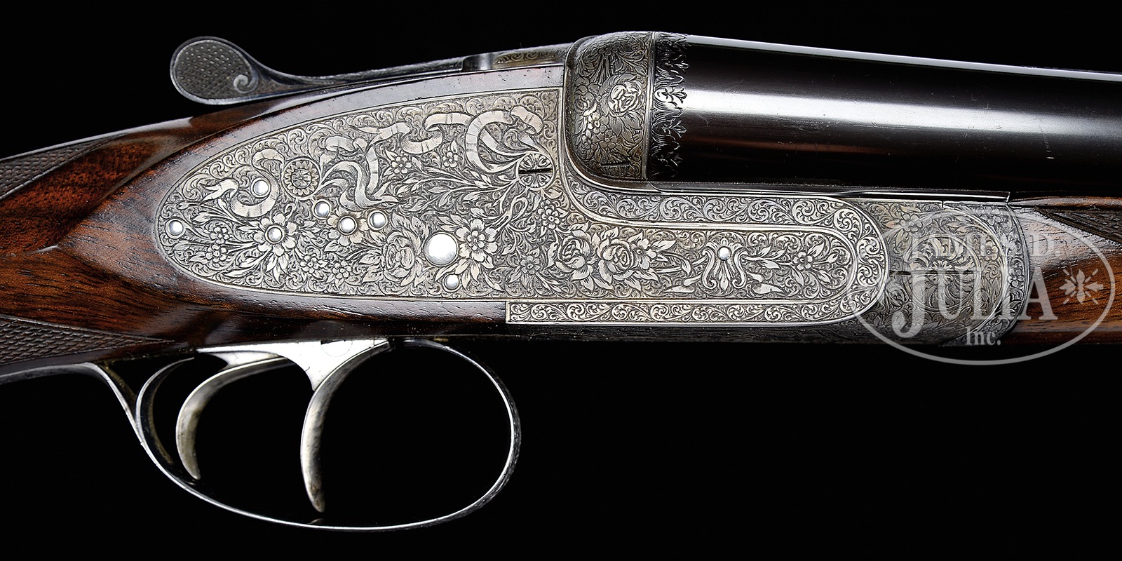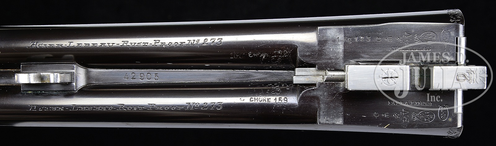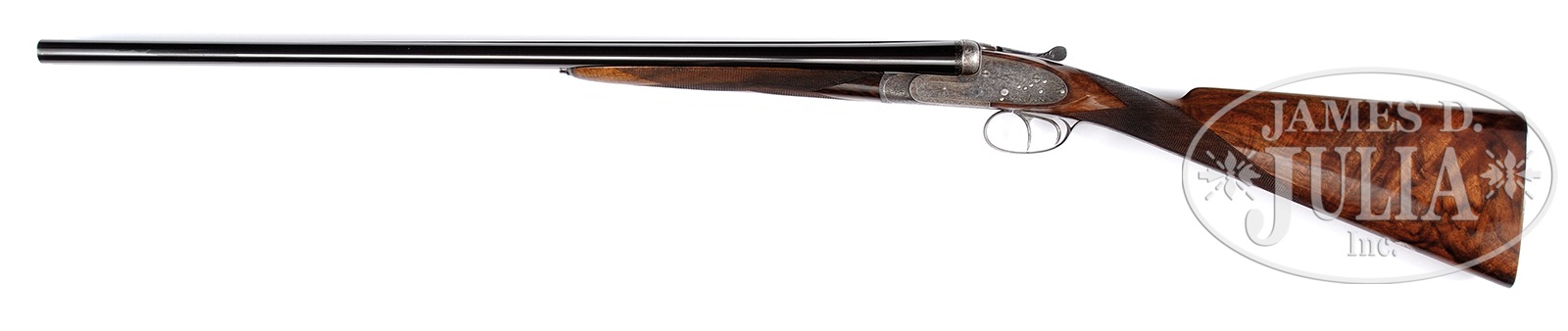 *WONDERFUL SMALL BORE “GOLDEN AGE” LEBEAU-COURALLY IMPERIAL SIDELOCK EJECTOR GAME GUN.SN 42905. (1936) Cal. 20 ga. 2-3/4″ Chambers. 27″ Chopper lump bbls with matted, game rib are engraved “Aug. Lebeau-Courally” “Liege” on tops. Bbl flats are stamped with 1936 Belgian nitro proofs. Gun is no. “2” of a pair, with “2” engraved on rear lump, gold inlaid on top lever, and engraved on forend iron. Bottoms of bbls are engraved “Acier – Lebeau – Rust – Proof No 273”. Splinter is stamped with SN. Case hardened, small sized action is made without safety and features hidden third fastener, bushed strikers, and dbl triggers (front articulated). Action is engraved with full coverage intertwined looped ribbons, flower stems and blossoms, with a few added leaves, all in a small scroll and shaded background, in a pattern often associated with the Lebeau-Courally Imperial grade. This engraving extends to fences and trigger guard. SN is on tang. Makers name and address is on scrolled ribbon device on bottom of action, and engravers signature “M Hannay” is on trigger plate. Finely marbled, and well figured, flesh-toned European walnut straight grip buttstock measures 14-1/2″ over broadly spaced flat top checkered wood butt. Point pattern checkering with line borders is at grip. A silver shield engraved “LL” (?) is on toe line. Matching long splinter patent ejector forend has Anson release. Bore diameter: left -.628, right – .626. Bore restrictions: left – .028 (full), right – .013 (mod). Wall thickness: left – .024, right – .027. Drop at heel: 2″, drop at comb: 1-5/16″. Cast: Neutral. Weight: 5 lbs. 14 oz. LOP: 14-1/2″. PROVENANCE: Remarkable William Larkin Moore Private Estate Collection of Fine Sporting Arms. CONDITION: Excellent. Bbls retain over 95% orig blue, with some silvering at muzzles, thinning along sides, and a number of light scratches and marks. Action retains 70 – 80% orig case hardening color, silvered on beads and fences, thinning on bottom, from normal hand wear. Lockplates retain over 90% of their muted color. Top lever is silvered on thumbpiece. Trigger guard retains 40 – 50% of its blue, silvered on sides and at grip. Trigger blades retain most of their orig case hardening color. Stocks retain nearly all of what appears to be their orig glossy oil finish which is possibly an old light refinish, or perhaps added oil. Checkering is lightly worn. Bores are excellent with some light frosting, with one or two small pings, mostly in left bbl. Action is tight. Bbls are on face. Ejectors are in time. Lebeau-Courally has made some of the finest guns in the world. This is a fine pre-war example. 50594-52 MGM103 (15,000-25,000) C&R – Lot 3384