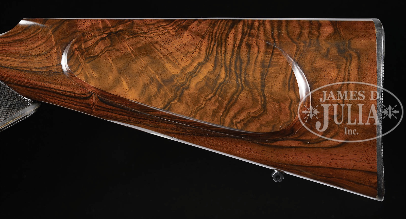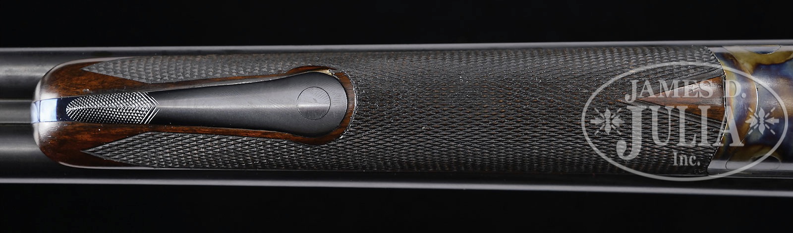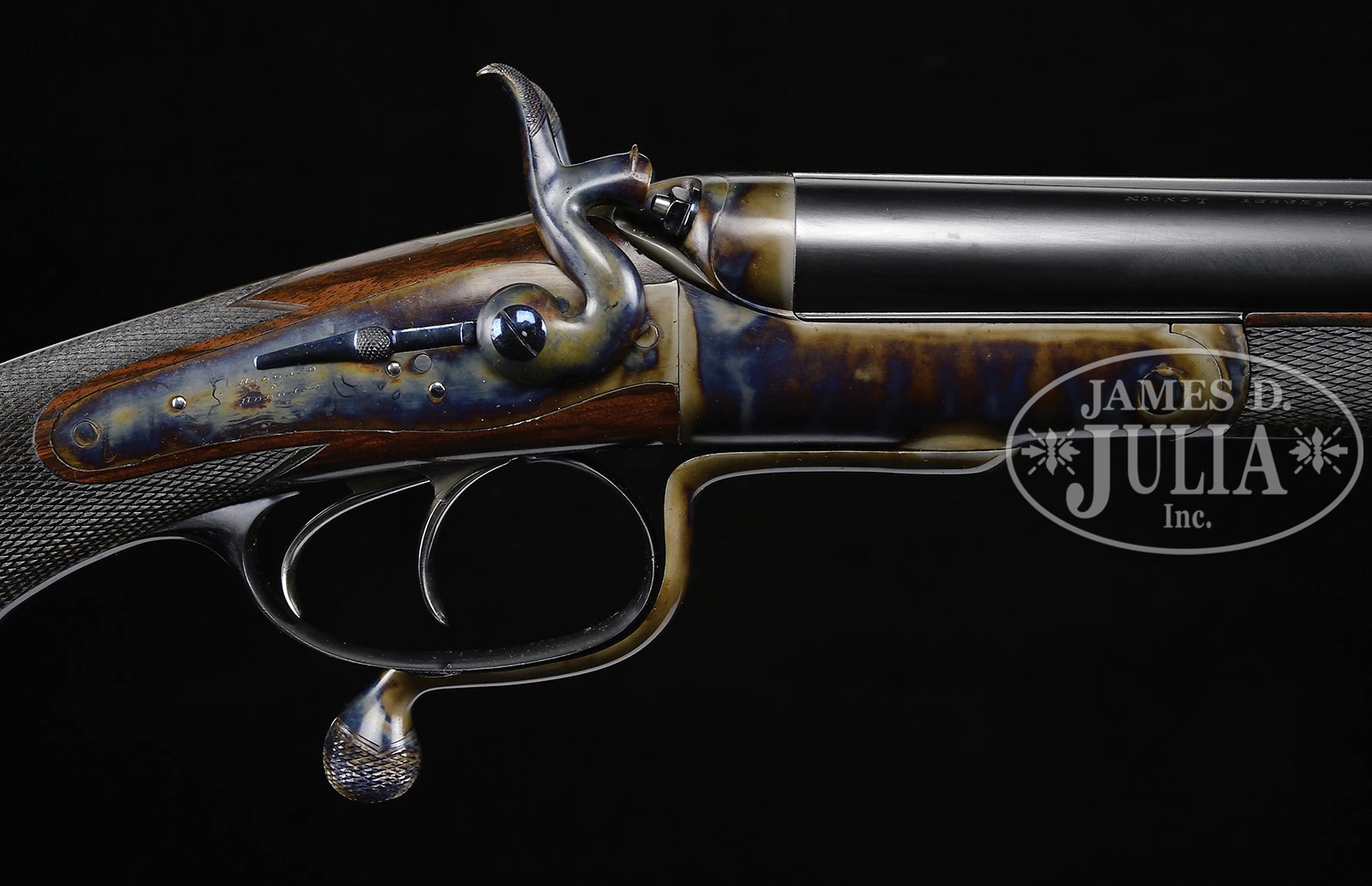 BEAUTIFULLY RESTORED HOLLAND & HOLLAND HAMMER DOUBLE RIFLE.SN 8811. (ca 1886) Cal. .450-.400 2-3/8 BPE. .408 Bore diameter. 26″ Steel dovetailed bbls have full length, tapered rib file cut at rear portion behind one standing, two folding leaf express rear sight. Remainder is plain, matted one inch before raised ramp holding fine silver bead front sight. Tops of bbls are engraved “Holland & Holland. 98. New. Bond Street. London” and “Winners of All the “Field” Rifle Trials, London, 1883″. Bottoms of bbls are stamped with London black powder proofs, and SNs. Round, Jones underlever, case hardened action with nicely filed fences, is fitted with peninsula rebounding back action locks, with round bodied serpentine hammers and back sliding safeties. Lockplates are engraved “Holland & Holland”. Blued trigger guard has SN at grip which extends to horn grip cap. Exceptional flame figured and marbled European walnut capped pistol grip buttstock measures 14-3/8″ over checkered horn buttplate, and features nicely shaped shadow line right hand cheekpiece, classic point pattern checkering at grip, and a vacant silver oval on toe line, which is also fitted with sling eye matching that on bottom of bbls. Near fully checkered splinter forend has forward pivoting lever release. Drop at heel: approx 2-3/4″, drop at comb: approx 1-3/4″. Weight: 7 lbs. 11 oz. LOP: 14-3/8″. CONDITION: Excellent, essentially near new, as meticulously restored. Bbls retain nearly all of a London quality re-black, with a few spots, engraving picked up. Action and lockplates retain essentially all of a correctly colored, most likely St. Leger, bright re-color hardening. Firing pin retainers, hammers, screws, safeties, etc. are beautifully fire blued. Triggers appear to be nickel-plated. Trigger guard charcoal blued. Meticulously shaped and finished, newly made, buttstock has only a few minor marks in its fine oil finish. Original forend has been refinished to match buttstock, checkering re-cut. Bores are excellent, with sharp rifling throughout, shiny, but with a few light pits toward breech ends. Locks are crisp. Safeties work. A stunning little rifle in a caliber easily loaded for, with brass and other components readily available. 4-51499 MGM63 (4,000-6,000) – Lot 3385