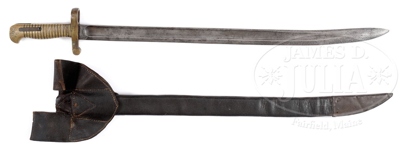 There are no more than 5 or 6 brass handled Georgia Armory bayonets known and this is possibly the only example in an orig scabbard. The Georgia Armory in Milledgeville, Georgia produced rifles and bayonets of the US 1855 pattern of which only a few survive. Bayonet measures 21-1/2″ and 26-1/2″ overall. Bayonet is deeply marked on ricasso “GA ARMORY 1862”. There is an initial and number “1” stamped in lug channel which is potentially the SN as the only other SNs on these brass handled bayonets are 2-digit and “32” being the highest SN known. There are initials “ATF” stamped in pommel of unknown origin but are possibly an inspector. Later 1863 produced Georgia Armory bayonets have wood slab grips. You may never find a Georgia Armory rifle but this is your opportunity to buy one of the rarest and finest examples of its saber bayonet. PROVENANCE: Collection of James Maconkey. CONDITION: Very good overall. Blade is grey with areas of pitting. Brass hilt exhibits mustard colored patina. Tin mounted scabbard is in matching very good condition as is frog. Both sound and sturdy. 49442-18 JS (12,000-16,000) – Lot 3385