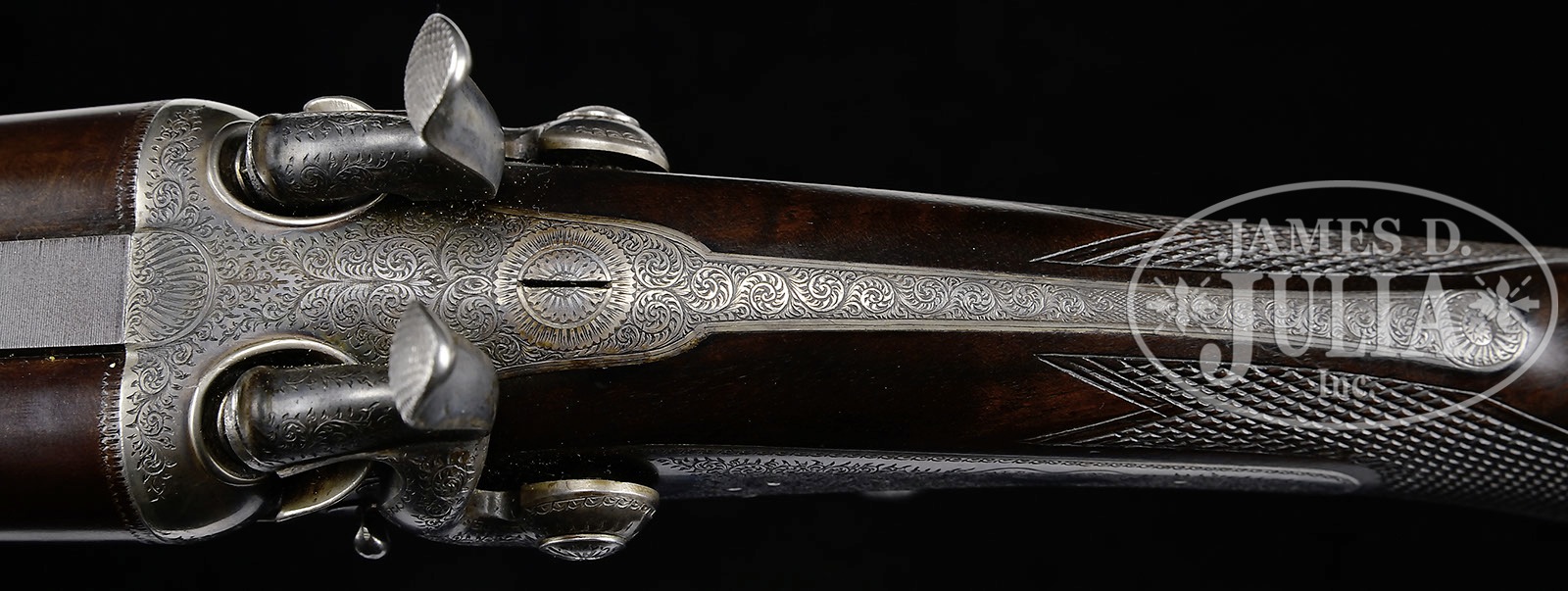 ALEXANDER HENRY BEST QUALITY HAMMER DOUBLE RIFLE.SN 3585. Cal. .500 BPE. 28″ Damascus bbls have full length, broad, file cut rib fitted with one standing, one folding leaf express rear, and silver bead front sights, engraved “Alexr. Henry. 12 South St. Andrew St. Edinburgh. Maker to Their Royal” “Highness’ The Prince of Wales and Duke of Edinburgh Patent. No. 2715”. Bbl flats are stamped with London black powder proofs, SN, “AH”, and “39” (Bore). Bottoms of bbls are stamped “HENRY’S PATENT A & T 1844”, The other stamped the same but with “1845”. Adams & Tate were bbl makers who made many of Henry’s bbls. Rounded Jones underlever action is fitted with peninsula, non-rebounding, back action locks with short round bodied serpentine hammers and front sliding safeties. Action and lockplates are engraved with well cut, small scroll at about 80% coverage. “Alexr Henry” is in ribands on each lockplate. Scroll engraved trigger guard has SN at grip. Finely marbled and lightly figured European walnut buttstock measures 14-1/4″ over checkered wood butt with engraved steel heel and toe plates. Stock features delicate double shadow line right hand cheekpiece, sling eye on toe line, point pattern checkering at grip, and engraved steel grip cap with trap. Matching splinter forend has nicely shaped steel tip, and attaches to bbl with captive side nail through shaped and engraved steel escutcheons. Drop at heel: approx 2-9/16″, drop at comb: approx 1-7/8″. Weight: 8 lbs. 12 oz. LOP: 14-1/4″. CONDITION: Excellent, as partially refinished. Bbls retain nearly all of an old re-brown, engraving and rib slightly washed, Damascus pattern barely visible. Action retains most of its orig case hardening color, balance a fine silver gray. Lockplates retain over 80% of their orig color, silvered at tails. Stocks retain nearly all of their orig rubbed oil finish, with a number of light marks and scratches. Bores are very fine with strong rifling, lightly frosted throughout. Action is tight. Locks are crisp. Safety works. A fine rifle by this highly regarded Scottish maker, who specialized in rifles. 4-49255 MGM123 (7,500-12,500) – Lot 3386