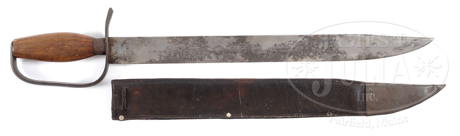 One of the finest armory made Confederate Bowie knives to come to market in many years. Of classical style and massive size, this orig Bowie knife retains its orig tin mounted leather scabbard in outstanding condition. The knife measures 23 ½ “overall with the blade being single edged with a lightly clipped point which is 1-1/2″ wide at the ricasso. The “D” guard is made from a single wide strap of iron with a convex face and flat interior terminating at the pommel with a simply rounded end and with a pointed simple quillon. The grip is of plain, undecorated walnut carved in bulbous form with an iron ferrule at the base. Accompanying this wonderful and massive Confederate knife is its orig scabbard with lead rivets, tin tip and orig sewn belt loop. You will rarely encounter a better example of this popular and rare Georgia Armory Bowie knife featured in Confederate Bowie Knives by Melton, Phillips & Sexton and Josh Phillips fine monograph just on these particular knives. PROVENANCE: Ben Michel Collection; James D. Julia Auction, Lot 1084, Fall 2007; Collection of Jim Maconkey. CONDITION: Very fine overall. Blade overall is mostly bright showing orig polish and tool marks with areas of staining and light pitting. D-Guard, ferrule and blade ricasso area still retain orig armory black paint or japanning rarely seen on but a handful of the best examples of this knife. Grip has hand worn patina. Scabbard is sound and solid with crazing and several age cracks. One of the three lead rivets to reinforce scabbard is missing and one of the four pins holding tin tip is missing. Blade and scabbard fit well with some shrinkage such that there is a 3/8″ gap. 49442-14 JS (10,000-15,000) – Lot 3387