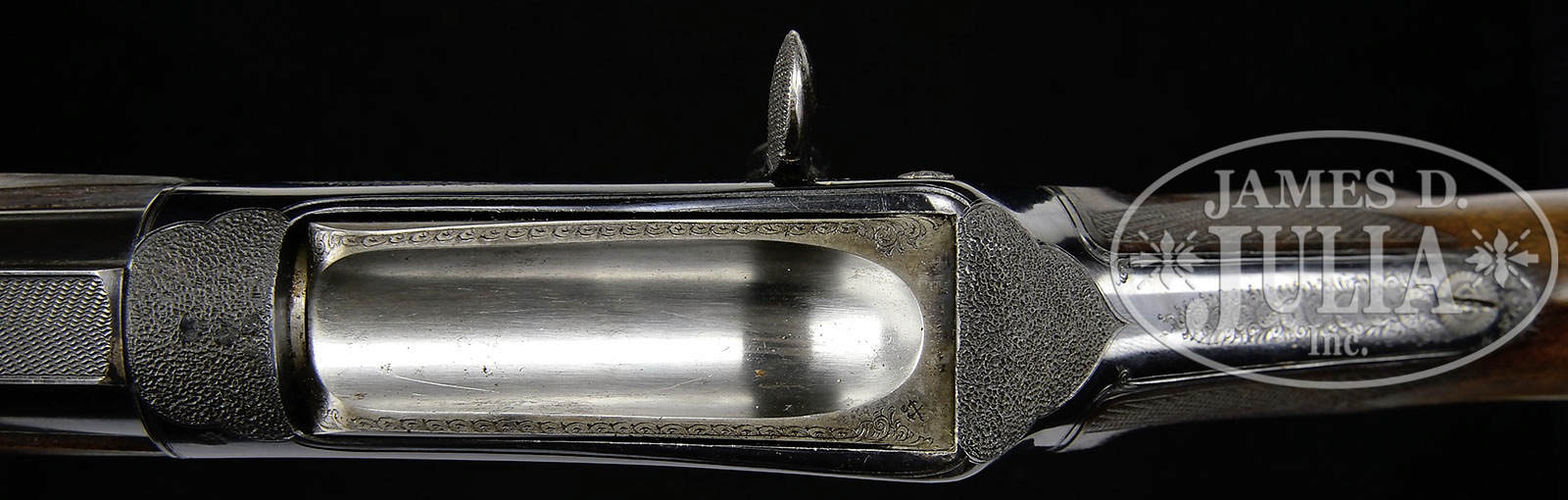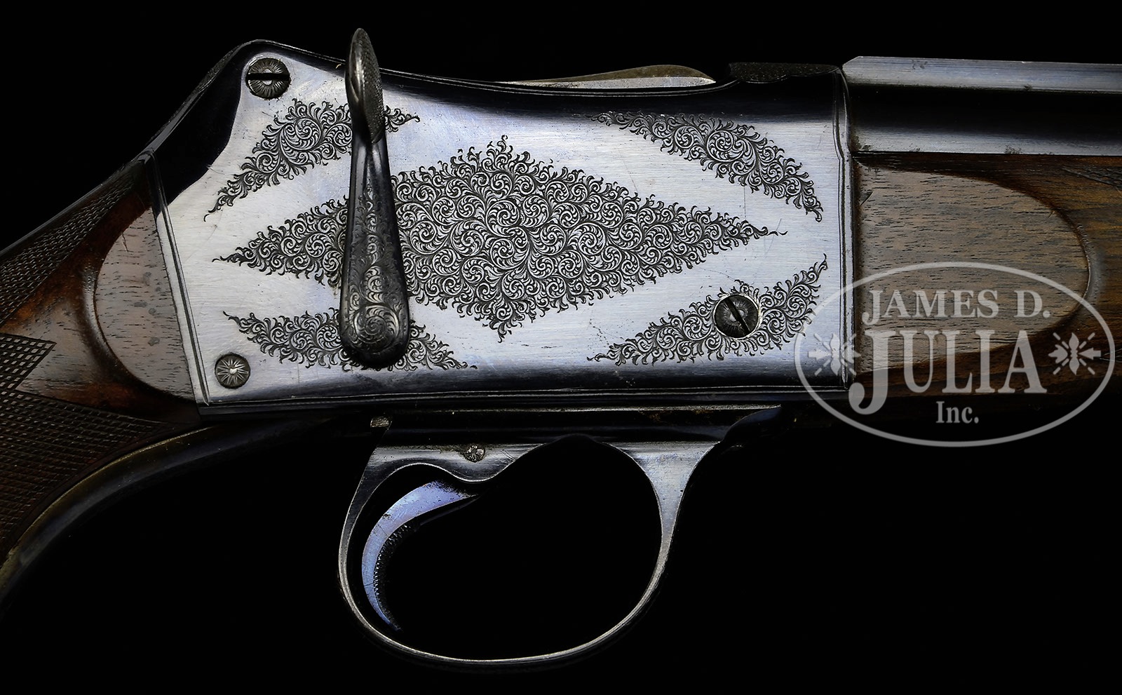 HOLLAND & HOLLAND “SWINBURN’S PATENT” MARTINI ACTION SINGLE SHOT SPORTING RIFLE WITH BAYONET, MOLD AND ORIGINAL CASE.SN 5131. Cal. 577-450. 28″ Tapered, round bbl with Henry rifling, is fitted with broad, flat, matted rib extending to within 5/8″ of muzzle to allow for installation of bayonet. Lug is mounted on right side of bbl. Rib is fitted with one standing, two folding leaf express rear sight, marked for 100, 200, and 300 yards, along with folding ladder sight graduated to 1000. Left side of bbl is stamped with Birmingham black powder proofs, right side is engraved “Holland & Holland. 98 New Bond St. London.” Blued, modified Martini action with secondary cocking lever on right side, has case hardened primary opening and cocking lever inlet into grip with checkered loop at tail. Left side of action is marked “SWINBURN’S PATENT”. Action is engraved with about 50% coverage of nicely cut small scroll which extends onto trigger guard and both cocking levers. Nicely marbled and well stump figured European walnut pistol grip buttstock measures 14″ over what appears to be its orig Silver pad. A sling eye is on toe line matching that on bottom of bbl. Square flat top point pattern checkering is at grip. Matching forend has horn tip, and attaches to bbl with screw through shaped and engraved steel escutcheon. Drop at heel: approx 2-5/8″, drop at comb: approx 1-7/8″. Weight: 8 lbs. 0 oz. LOP: 14″. Military type saw-backed bayonet is marked “P. D. L.” on ricasso of 18″ brightly polished blade. Handle of bayonet is also brightly polished and has checkered gutta percha scales. Leather scabbard has polished steel mouthpiece and tip. High quality bronze mold with pivoting steel sprue plate is marked “GREENFIELD LONDON .450” on one side, and “H. HOLLAND” on the other, and casts a 1-1/4″ long bullet with indented base for paper patch. Original makers oak and leather full length case with brass corners is lined in tan pigskin, with paper H & H New Bond Street label on lid. Case is semi-French fitted for rifle, bayonet and mold, along with compartments, some covered, for many other accessories, which are missing, except for brass cleaning rod with circular ebony knob. CONDITION: Exceptionally fine, investment quality. Rifle retains nearly all of its fine original factory finishes on wood and metal. Rust blue of bbl has only some slight silvering around muzzle and sharp edges, and some light flecking. Charcoal blue of action has only a hint of silvering on top tang and high points, with some loss due to flaking, mostly on left side at top of trigger guard. Trigger guard bow has loss due to cleaning, over some light pitting. Screw heads show considerable use. Main cocking lever retains 80 – 90% orig case hardening color. Stocks retain nearly all of their orig oil finish with numerous light marks and bumps. Pad appears to be original, but possibly original plates were retained and new rubber installed many years ago, as rubber is proud of plates and roughly shaped. Bore is excellent, appears unfired since proof. Action is a bit sluggish from congealed oil. Bayonet is excellent, with bright shiny blade, and only some minor discoloration and freckling, which also appears on grip, scabbard mouthpiece and tip. Mold has toned to a dark bronze color, and is generally excellent. Case leather is darkening and has numerous scrapes and rubs, handle detached. One D-ring is missing. Interior leather is good with numerous rubs and marks, as well as soiling from contact with rifle and accessories. It appears that all compartment covers are present. Paper label is very fine with some rubs and soiling, and it is considerably foxed. A really neat, high condition, rifle. 4-50426 MGM182 (12,500-17,500) – Lot 3388