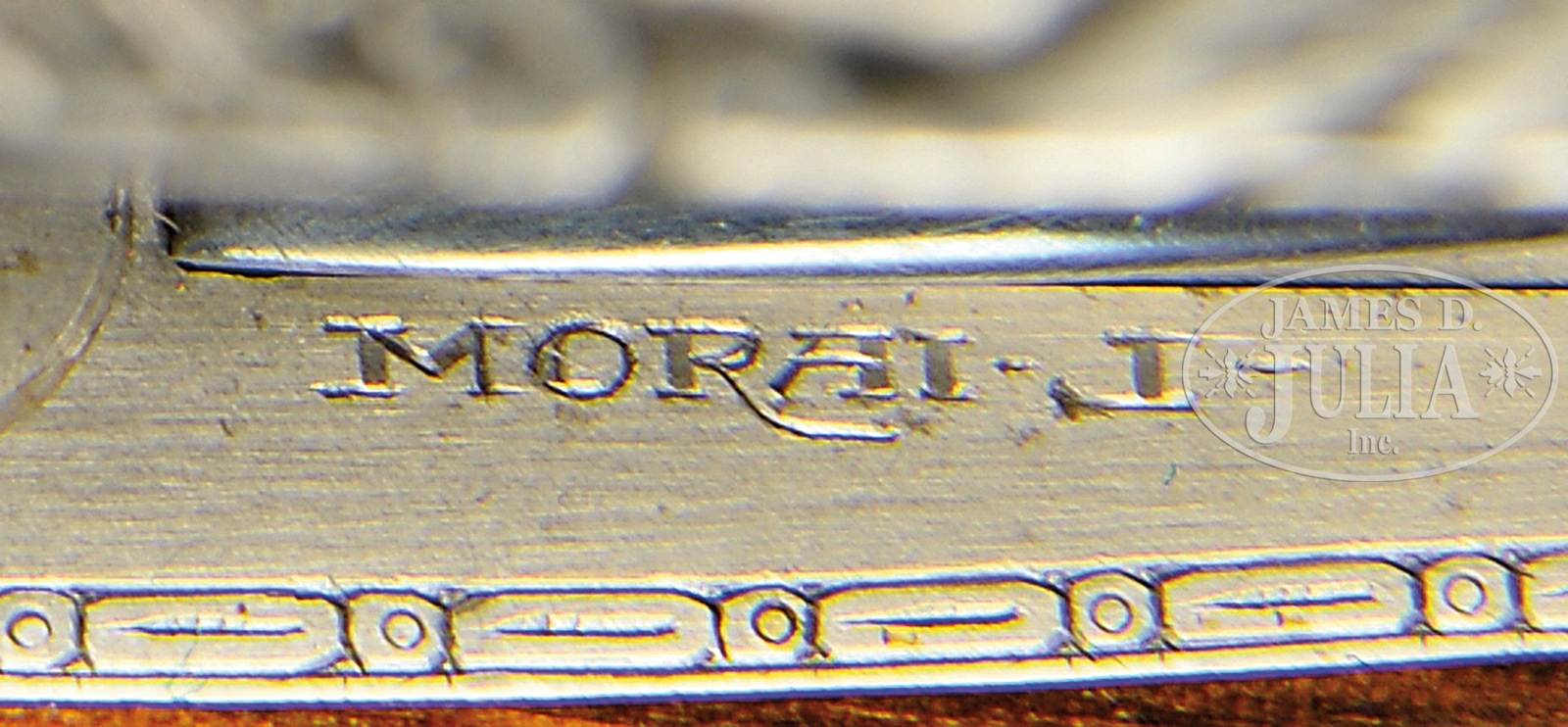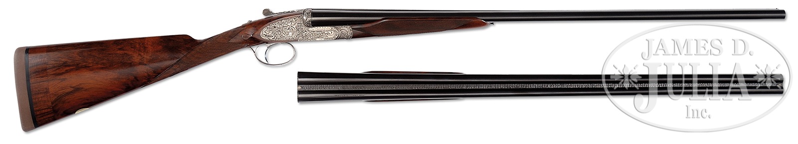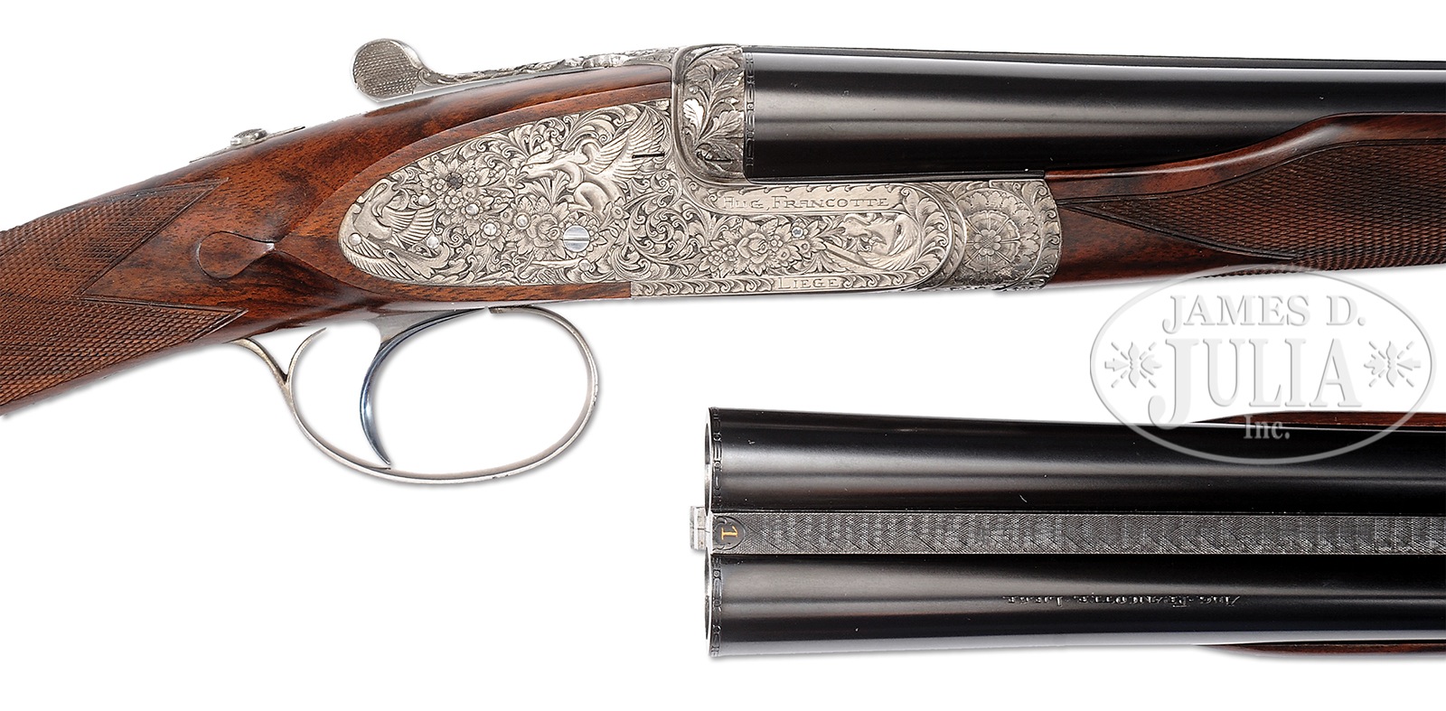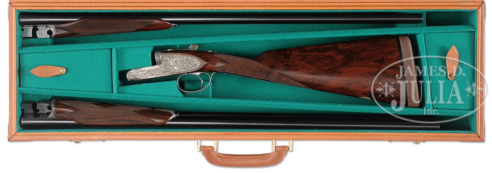 *LOVELY 28 GAUGE FRANCOTTE DELUXE SIDELOCK EJECTOR SINGLE TRIGGER GAME GUN WITH DEEP RELIEF BAROQUE ENGRAVING BY MORAI WITH EXTRA BARRELS AND CASE.SN 91668. (1985) Cal. 28 ga. 2-3/4″ Chambers. 27″ and 28″ Chopper lump bbls are gold inlaid at breech ends with “1” under a star, and “1”. Bbls are fitted with narrow, matted, concave, slightly swamped game ribs, and are engraved “Aug – Francotte – Liege” on tops of right bbls. Bbl flats are stamped with 1985 Belgian nitro proofs for 2-3/4″ chambers. Bottoms of left bbls are engraved with importer (PACHMAYR LOS ANGELES CA). Small sized, coin finished, sidelock action features non-automatic safety (SAFE inlaid in gold), bushed strikers, raised rib tumbler end cocking indicators, and single non-selective trigger. Action is engraved with near full coverage very well cut, semi-relief, open, shaded scroll with rose and foliage highlights, with makers name on ring around trigger plate screw. Fences and top lever are deep relief carved with scrolling oak leaves and acorns. Lockplates are engraved with scroll and bouquets matching action, as background for griffins; one central with full body and wings, others at front and rear of lockplate, partially hidden. Makers name and address is on each side of action. Engravers signature “Morai” is on trigger plate. This scroll extends to trigger guard with another partial griffin on bow, and SN gold inlaid on tang. Nicely marbled and lightly figured European walnut straight grip buttstock measures 14-1/2″ over brown Decelerator pad over 1″ lengthening piece. Stock features classic drop points, point pattern checkering with line borders at grip, and a vacant gold oval on toe line. Each bbl set has its own dedicated small beavertail forend with matching numbers gold inlaid on tips, and interiors of iron marked “1” or “2”. Forends have Anson releases. 27″ BBL set with “1” star: Bore diameter: left -.558, right – .558. Bore restrictions: left – .016 (mod), right – .013 (mod). Drop at heel: 2-5/16″, drop at comb: 1-9/16″. Cast: approx 1/8″ off. Weight: 5 lbs. 5 oz. LOP: 14-1/2″. 28″ BBL set: Bore diameter: left -.556, right – .555. Bore restrictions: left – .024 (full), right – .020 (Imod). Drop at heel: 2-1/4″, drop at comb: 1-1/2″. Cast: Neutral. Weight: 5 lbs. 6 oz. LOP: 14-1/2″. Tan pigskin leather case by Exposito, with leather corners, is lined in green felt. Case contains two keys. PROVENANCE: Remarkable William Larkin Moore Private Estate Collection of Fine Sporting Arms. CONDITION: Excellent, as partially refinished. Bbls retain essentially all of what appears to be their orig blue. Coin finish of action is still bright. Stocks retain nearly all of their orig finish, nicely blended in with addition of lengthening piece. Checkering remains light in color. Bores are excellent. Action is tight. Bbls are on face. Mechanically excellent. Case is excellent. An interesting great handling small bore Francotte. 50594-84 MGM60 (20,000-40,000) – Lot 3388