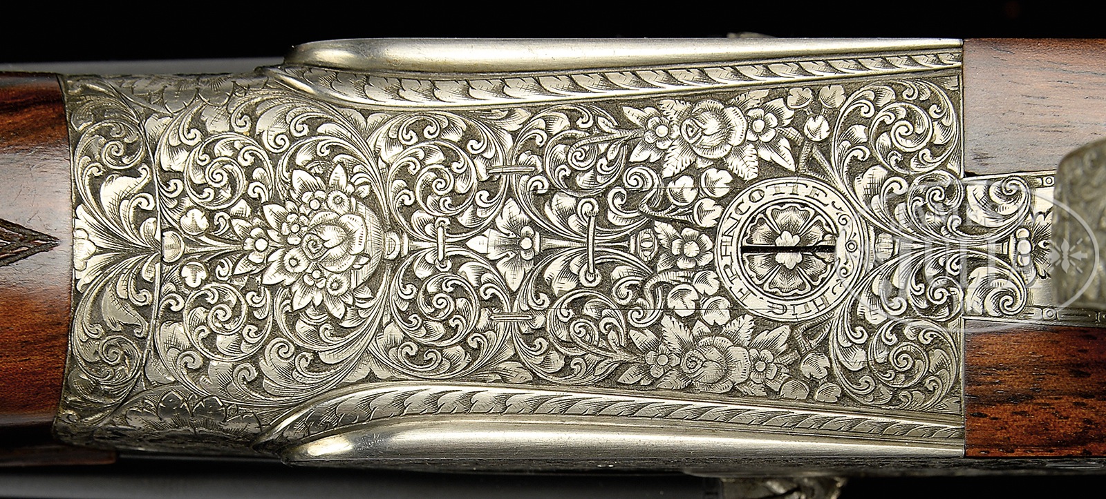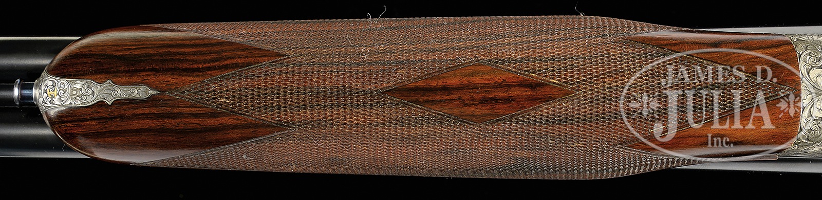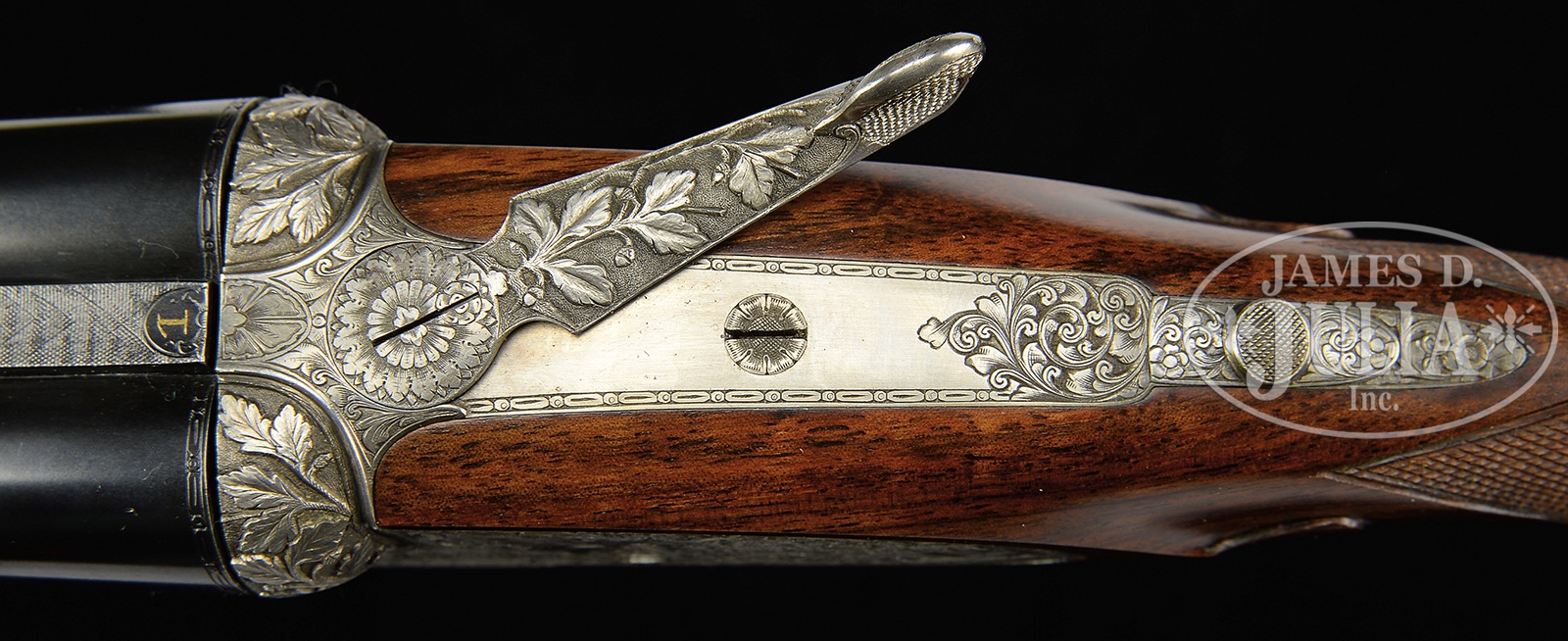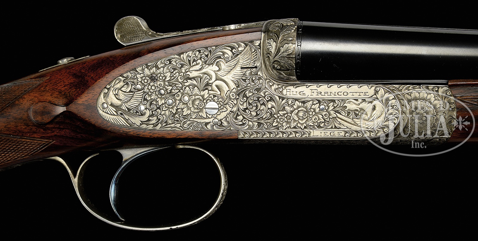 *LOVELY 28 GAUGE FRANCOTTE DELUXE SIDELOCK EJECTOR SINGLE TRIGGER GAME GUN WITH DEEP RELIEF BAROQUE ENGRAVING BY MORAI WITH EXTRA BARRELS AND CASE.SN 91668. (1985) Cal. 28 ga. 2-3/4″ Chambers. 27″ and 28″ Chopper lump bbls are gold inlaid at breech ends with “1” under a star, and “1”. Bbls are fitted with narrow, matted, concave, slightly swamped game ribs, and are engraved “Aug – Francotte – Liege” on tops of right bbls. Bbl flats are stamped with 1985 Belgian nitro proofs for 2-3/4″ chambers. Bottoms of left bbls are engraved with importer (PACHMAYR LOS ANGELES CA). Small sized, coin finished, sidelock action features non-automatic safety (SAFE inlaid in gold), bushed strikers, raised rib tumbler end cocking indicators, and single non-selective trigger. Action is engraved with near full coverage very well cut, semi-relief, open, shaded scroll with rose and foliage highlights, with makers name on ring around trigger plate screw. Fences and top lever are deep relief carved with scrolling oak leaves and acorns. Lockplates are engraved with scroll and bouquets matching action, as background for griffins; one central with full body and wings, others at front and rear of lockplate, partially hidden. Makers name and address is on each side of action. Engravers signature “Morai” is on trigger plate. This scroll extends to trigger guard with another partial griffin on bow, and SN gold inlaid on tang. Nicely marbled and lightly figured European walnut straight grip buttstock measures 14-1/2″ over brown Decelerator pad over 1″ lengthening piece. Stock features classic drop points, point pattern checkering with line borders at grip, and a vacant gold oval on toe line. Each bbl set has its own dedicated small beavertail forend with matching numbers gold inlaid on tips, and interiors of iron marked “1” or “2”. Forends have Anson releases. 27″ BBL set with “1” star: Bore diameter: left -.558, right – .558. Bore restrictions: left – .016 (mod), right – .013 (mod). Drop at heel: 2-5/16″, drop at comb: 1-9/16″. Cast: approx 1/8″ off. Weight: 5 lbs. 5 oz. LOP: 14-1/2″. 28″ BBL set: Bore diameter: left -.556, right – .555. Bore restrictions: left – .024 (full), right – .020 (Imod). Drop at heel: 2-1/4″, drop at comb: 1-1/2″. Cast: Neutral. Weight: 5 lbs. 6 oz. LOP: 14-1/2″. Tan pigskin leather case by Exposito, with leather corners, is lined in green felt. Case contains two keys. PROVENANCE: Remarkable William Larkin Moore Private Estate Collection of Fine Sporting Arms. CONDITION: Excellent, as partially refinished. Bbls retain essentially all of what appears to be their orig blue. Coin finish of action is still bright. Stocks retain nearly all of their orig finish, nicely blended in with addition of lengthening piece. Checkering remains light in color. Bores are excellent. Action is tight. Bbls are on face. Mechanically excellent. Case is excellent. An interesting great handling small bore Francotte. 50594-84 MGM60 (20,000-40,000) – Lot 3388