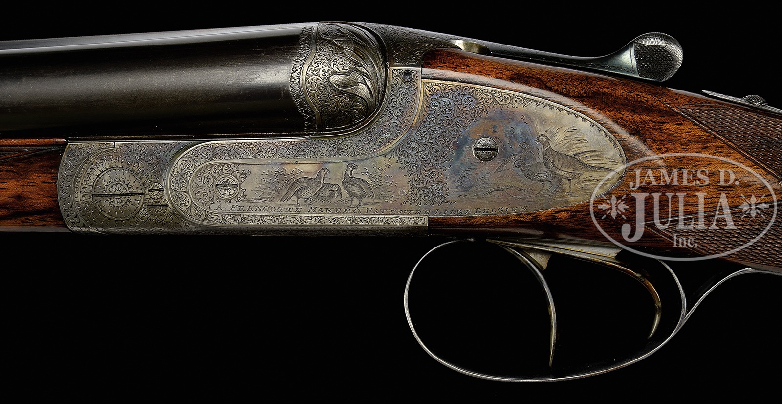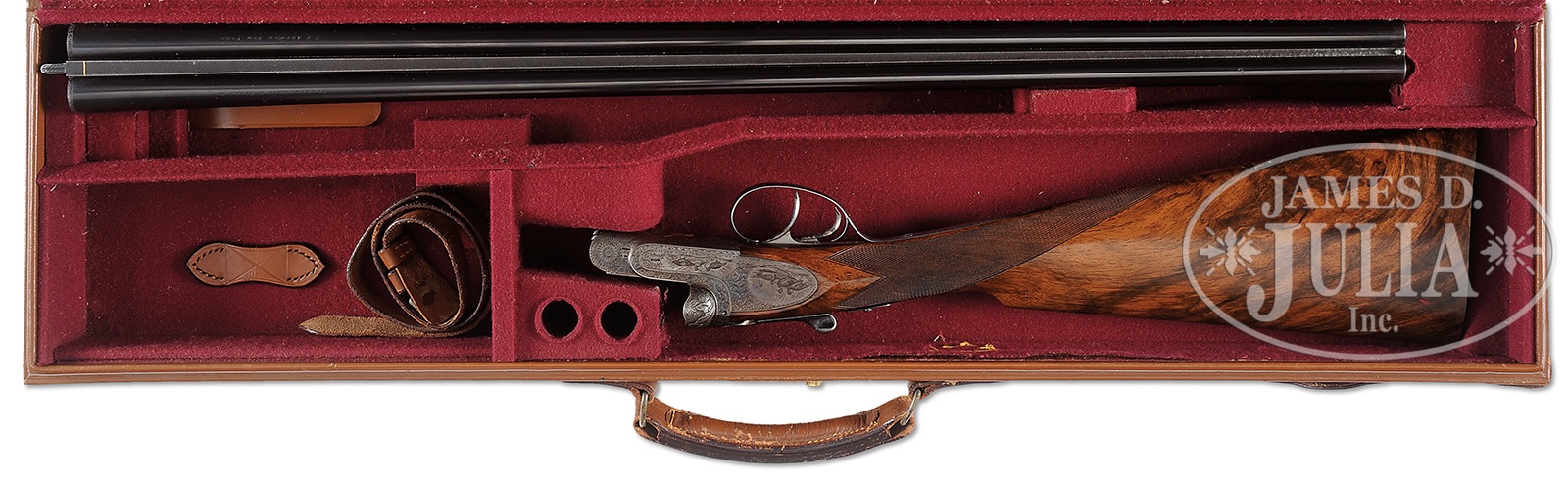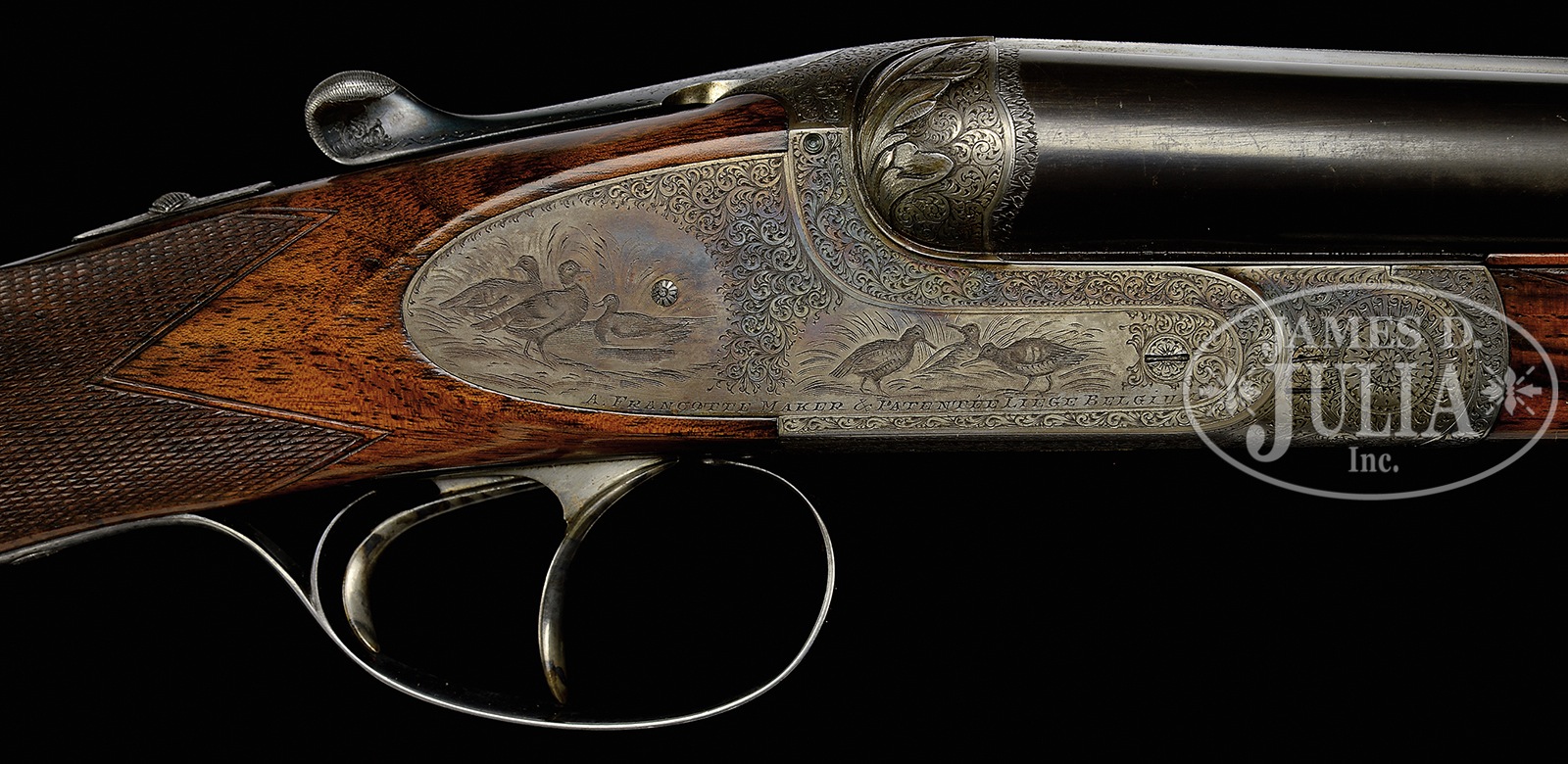 *LOVELY HIGH END SMALL BORE FRANCOTTE 45 “EAGLE” GRADE GAME GUN WITH CASE.SN 88471. Cal. 20 ga. The 45 “Eagle” retailed at $550.00 in 1927. This rare small gauge example has 28″ chopper lump bbls with narrow, file cut, concave game rib. Tops of bbls are engraved “Abercrombie & Fitch Co” “U.S. Agents New – York”. Bbl flats are stamped with Belgian nitro proofs for 2-3/4″ chambers. Case hardened, sideplated, boxlock, small sized action features automatic safety (S inlaid in gold), hidden crossbolt third fastener, side clips, intercepting safety sears, and dbl triggers. Action is engraved with near full coverage varying sized scroll within geometric borders; heraldic eagle is semi-relief engraved in two color gold on floorplate (shield is in light yellow). Fences are nicely relief carved in cattail motif. Sideplates have areas of scroll surrounding nicely detailed vignettes of game birds; group of quail (?) at front of left lockplate, and three pheasant at rear, and a trio of snipe (?) at front of right lockplate, with three ducks at rear. “A. Francotte Maker & Patentee Leige Belgium” is engraved along the bottom of each plate. Blued trigger guard with more scroll has SN on tang. Beautifully marbled and nicely figured flesh-toned European walnut straight grip buttstock measures 14-1/2″ over checkered wood butt. Closely spaced point pattern checkering with line borders is at grip, and two gold ovals are on toe line; small older one, perhaps original, is engraved “GDG”, and a later one “W. W. B” “4.28.76”. Matching splinter ejector forend has Anson release. Bore diameter: left -.620, right – .621. Bore restrictions: left – .013 (mod), right – .005 (IC). Wall thickness: left – .028, right – .026. Drop at heel: 2-1/8″, drop at comb: 1-7/16″. Cast: approx 5/8″ off. Weight: 5 lbs.7 oz. LOP: 14-1/2″. Abercrombie & Fitch marked British style VC leather case with stitched leather corners, has oval central medallion marked “W.W.B”. Case is lined in burgundy cloth, and contains straps and one detached strap loop retainer. CONDITION: Excellent, original, as found. Bbls retain approx 85% orig blue with numerous light marks, dulled and thinned considerably from normal hand wear near forend. Action and lockplates retain approx 80% orig case hardening color, quite strong where protected, thinning on edges and bottom from normal hand wear, and is still quite attractive. Top lever is silvered on thumbpiece. Trigger guard retains approx half of its orig blue, thinned on sides and silvered on tang. Stocks retain over 80% of what appears to be their orig oil finish over numerous light marks and scratches, which is possibly an old refinish. Present finish thinned on toe line after installation of new oval. Checkering remains sharp, possibly re-freshened. Bores are excellent. Action is tight. Bbls are on face. Ejectors are strong and in time. Case leather has numerous rubs and marks. Two corners are missing, one strap retainer detached. Orig handle is good. Interior cloth is fine with considerable rubs and soiling. A superb fast handling gun. 50730-9 MGM93 (10,000-14,000) C&R – Lot 3389