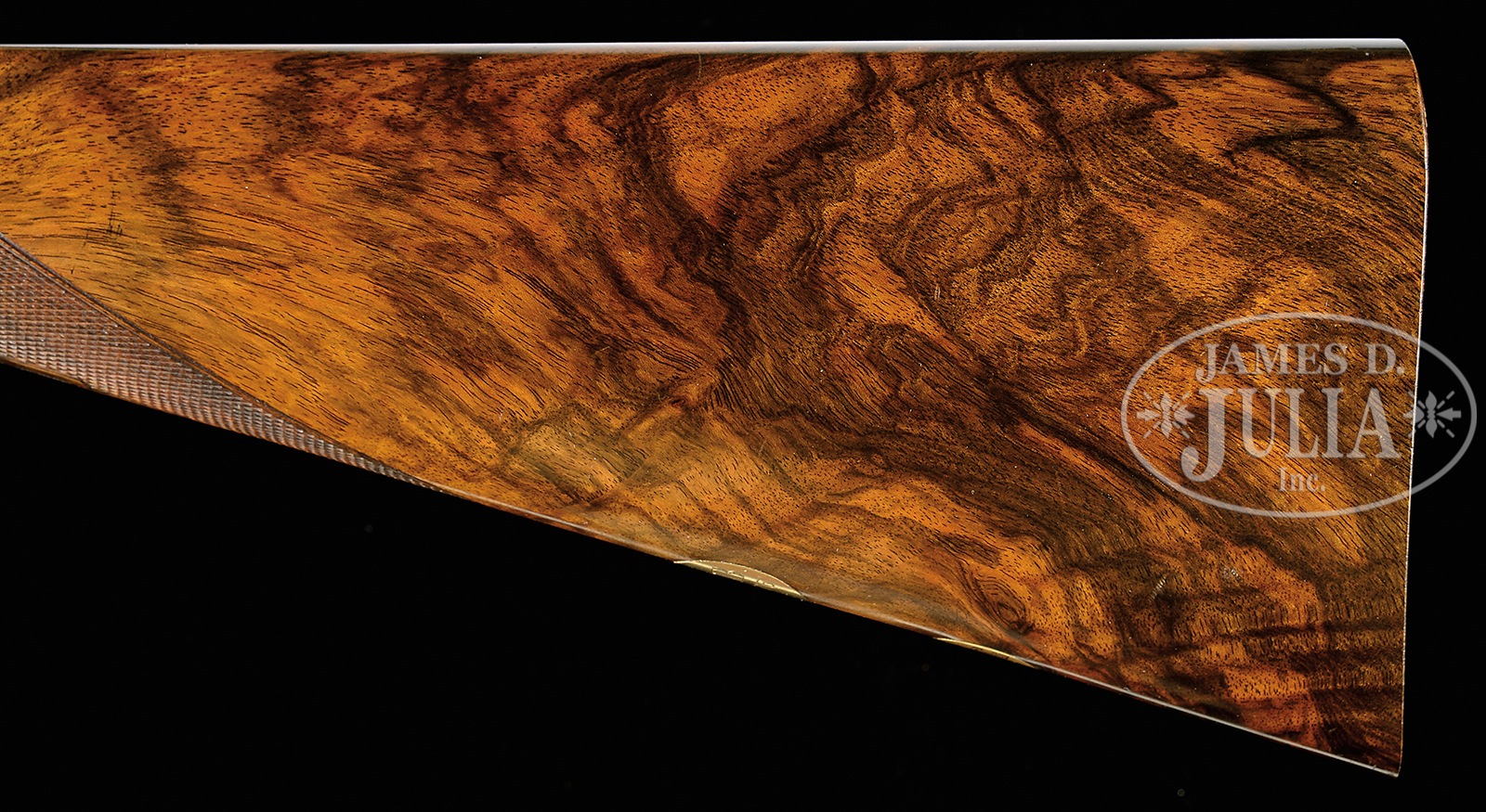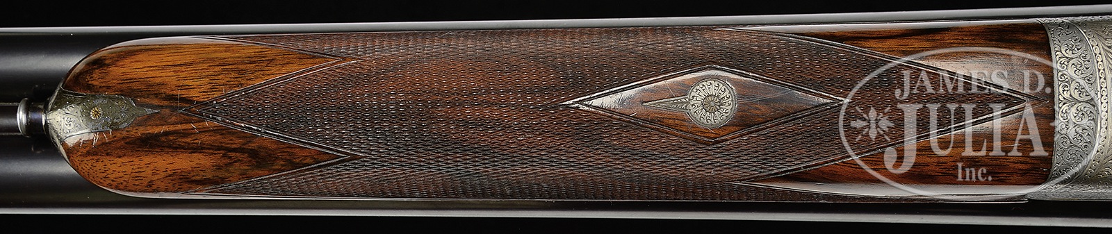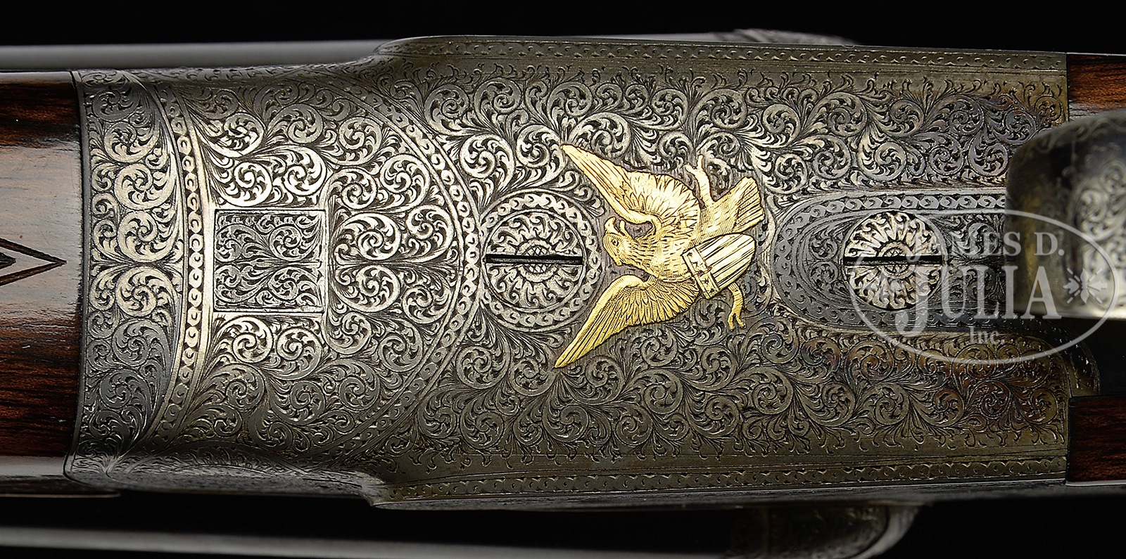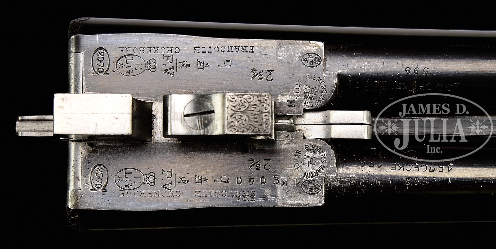 *LOVELY HIGH END SMALL BORE FRANCOTTE 45 “EAGLE” GRADE GAME GUN WITH CASE.SN 88471. Cal. 20 ga. The 45 “Eagle” retailed at $550.00 in 1927. This rare small gauge example has 28″ chopper lump bbls with narrow, file cut, concave game rib. Tops of bbls are engraved “Abercrombie & Fitch Co” “U.S. Agents New – York”. Bbl flats are stamped with Belgian nitro proofs for 2-3/4″ chambers. Case hardened, sideplated, boxlock, small sized action features automatic safety (S inlaid in gold), hidden crossbolt third fastener, side clips, intercepting safety sears, and dbl triggers. Action is engraved with near full coverage varying sized scroll within geometric borders; heraldic eagle is semi-relief engraved in two color gold on floorplate (shield is in light yellow). Fences are nicely relief carved in cattail motif. Sideplates have areas of scroll surrounding nicely detailed vignettes of game birds; group of quail (?) at front of left lockplate, and three pheasant at rear, and a trio of snipe (?) at front of right lockplate, with three ducks at rear. “A. Francotte Maker & Patentee Leige Belgium” is engraved along the bottom of each plate. Blued trigger guard with more scroll has SN on tang. Beautifully marbled and nicely figured flesh-toned European walnut straight grip buttstock measures 14-1/2″ over checkered wood butt. Closely spaced point pattern checkering with line borders is at grip, and two gold ovals are on toe line; small older one, perhaps original, is engraved “GDG”, and a later one “W. W. B” “4.28.76”. Matching splinter ejector forend has Anson release. Bore diameter: left -.620, right – .621. Bore restrictions: left – .013 (mod), right – .005 (IC). Wall thickness: left – .028, right – .026. Drop at heel: 2-1/8″, drop at comb: 1-7/16″. Cast: approx 5/8″ off. Weight: 5 lbs.7 oz. LOP: 14-1/2″. Abercrombie & Fitch marked British style VC leather case with stitched leather corners, has oval central medallion marked “W.W.B”. Case is lined in burgundy cloth, and contains straps and one detached strap loop retainer. CONDITION: Excellent, original, as found. Bbls retain approx 85% orig blue with numerous light marks, dulled and thinned considerably from normal hand wear near forend. Action and lockplates retain approx 80% orig case hardening color, quite strong where protected, thinning on edges and bottom from normal hand wear, and is still quite attractive. Top lever is silvered on thumbpiece. Trigger guard retains approx half of its orig blue, thinned on sides and silvered on tang. Stocks retain over 80% of what appears to be their orig oil finish over numerous light marks and scratches, which is possibly an old refinish. Present finish thinned on toe line after installation of new oval. Checkering remains sharp, possibly re-freshened. Bores are excellent. Action is tight. Bbls are on face. Ejectors are strong and in time. Case leather has numerous rubs and marks. Two corners are missing, one strap retainer detached. Orig handle is good. Interior cloth is fine with considerable rubs and soiling. A superb fast handling gun. 50730-9 MGM93 (10,000-14,000) C&R – Lot 3389