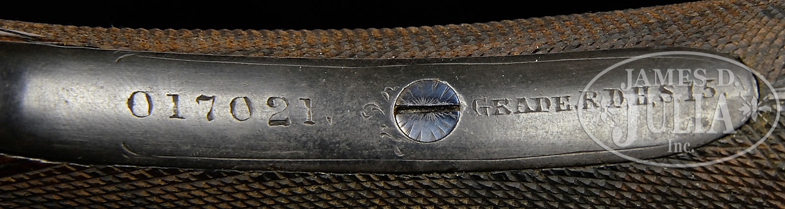 *W. W. GREENER GRADE 15 TOP LEVER EJECTOR BOXLOCK ROOK RIFLE.SN 017021. Cal. 22LR. 26-1/8″ Tapered octagon bbl is engraved “W. W. Greener 68 Haymarket London” on unmatted portion of matted top flat, fitted with three folding leaf express rear and Beech type folding front sights. Bottom of bbl is stamped with SN and caliber. Boxlock action with typical side safety, is engraved with a few flourishes of scroll and “W. W. Greener” on each side. Scroll engraved steel trigger guard has SN and grade at grip. Well streaked European walnut horn capped pistol grip buttstock measures 14-3/8″ over steel buttplate with widow’s peak. A “W. W. Greener” marked folding peep rear sight adjustable for windage and elevation, is set on inlet wooden base, in point pattern checkering at grip. Matching splinter forend has horn tip and friction release. Drop at heel: approx 2-3/4″, drop at comb: approx 1-5/8″. Weight: 5 lbs. 14 oz. LOP: .14-3/8″. CONDITION: Fine, as refinished. Bbl retains most of an old re-black, engraving slightly softened, edges somewhat rounded. Action is mostly silver gray. Stocks retain nearly all of an old oil refinish, checkering re-cut. Forend re-shaped in sweeping style most likely to smooth out chips and cracks. Bore is good, with strong rifling, but has numerous light pits. Action is tight. Peep rear sight is good. 4-49736 (1,000-1,500) – Lot 3390