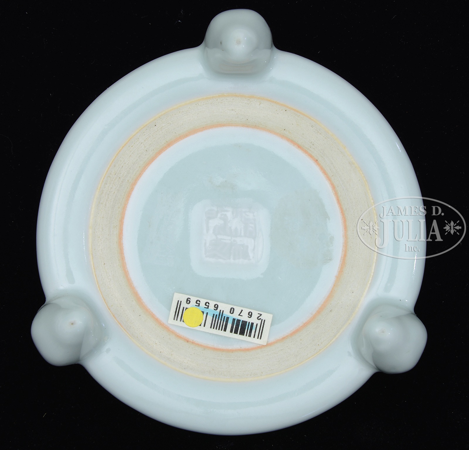 PAIR OF CELADON GLAZED TRIPOD WASHER.Qing Dynasty period, China. Of compressed cylindrical form, the washers supported by three small feet, beautifully glazed overall in celadon white color, with four character mark on the bottom. Includes Christie’s Auction tag. SIZE: 2-7/8″ (7.3cm) h x 5″ (12.7cm) dia. CONDITION: Good. 9-97035 (8,000-12,000) – Lot 3390